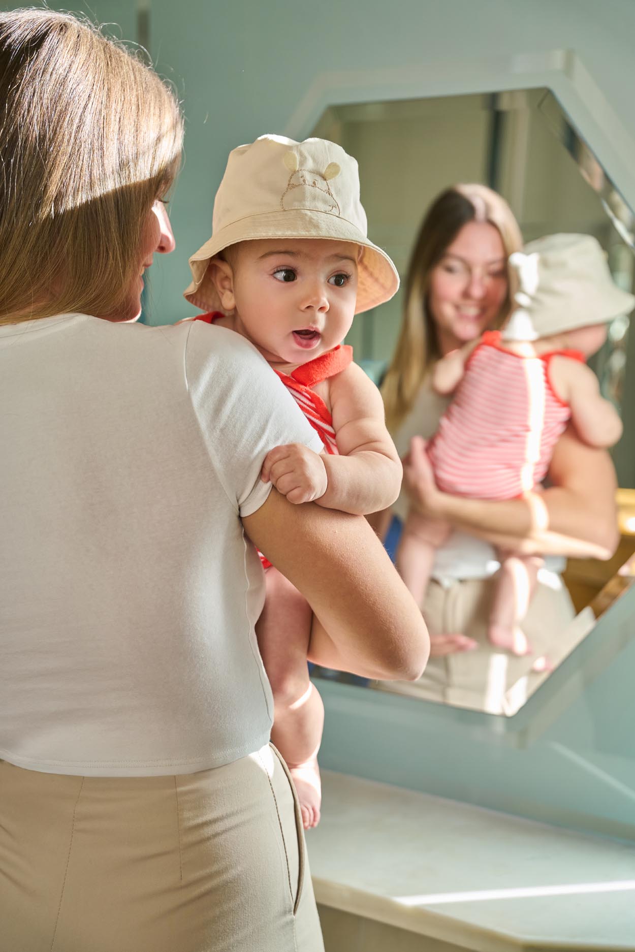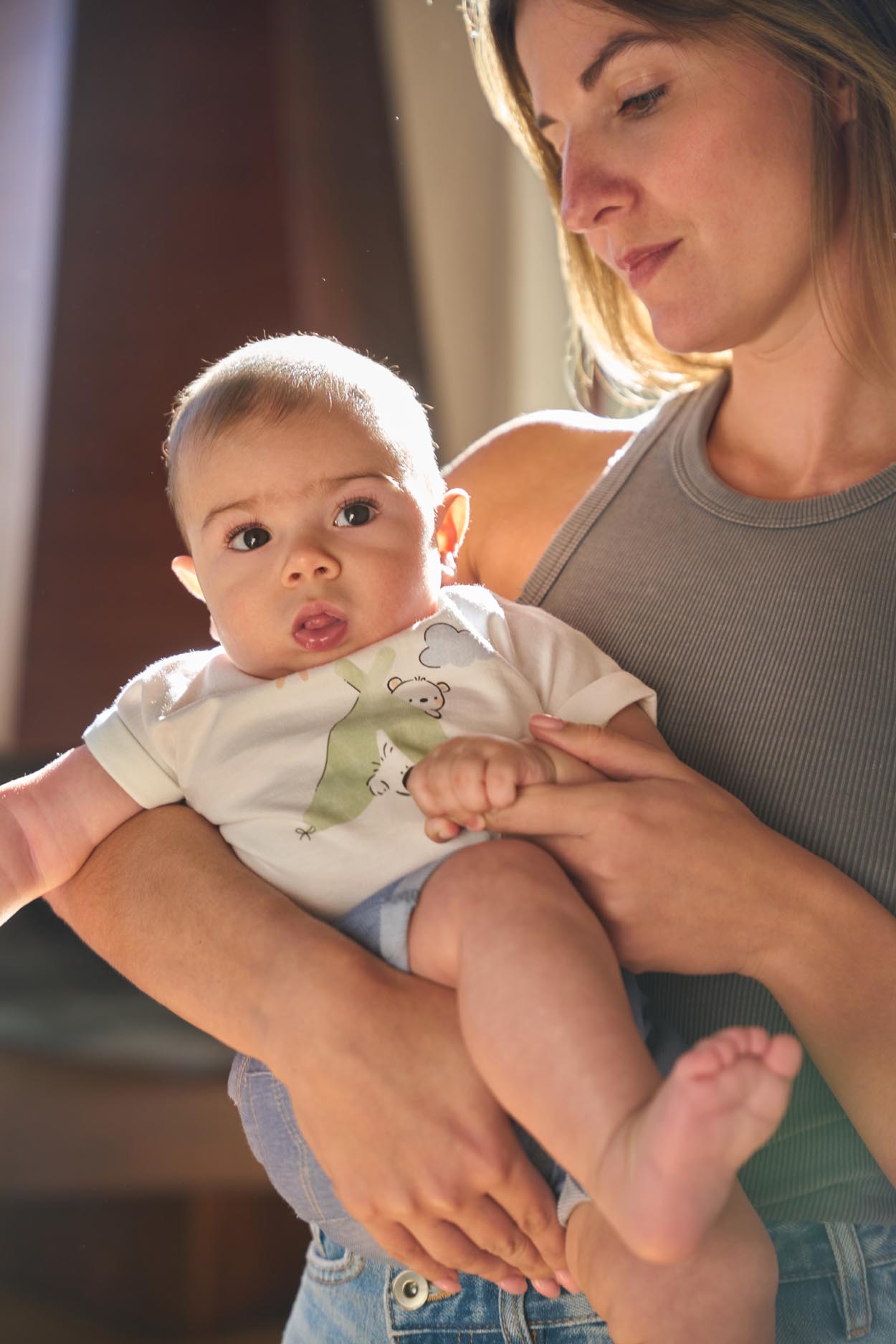 Hugs Bear è un mood dai colori neutri e rassicuranti, pensato per creare un’estetica morbida e senza tempo. Orsetti e mongolfiere diventano protagonisti di un immaginario sognante, perfetto per accompagnare i primi mesi del bambino.