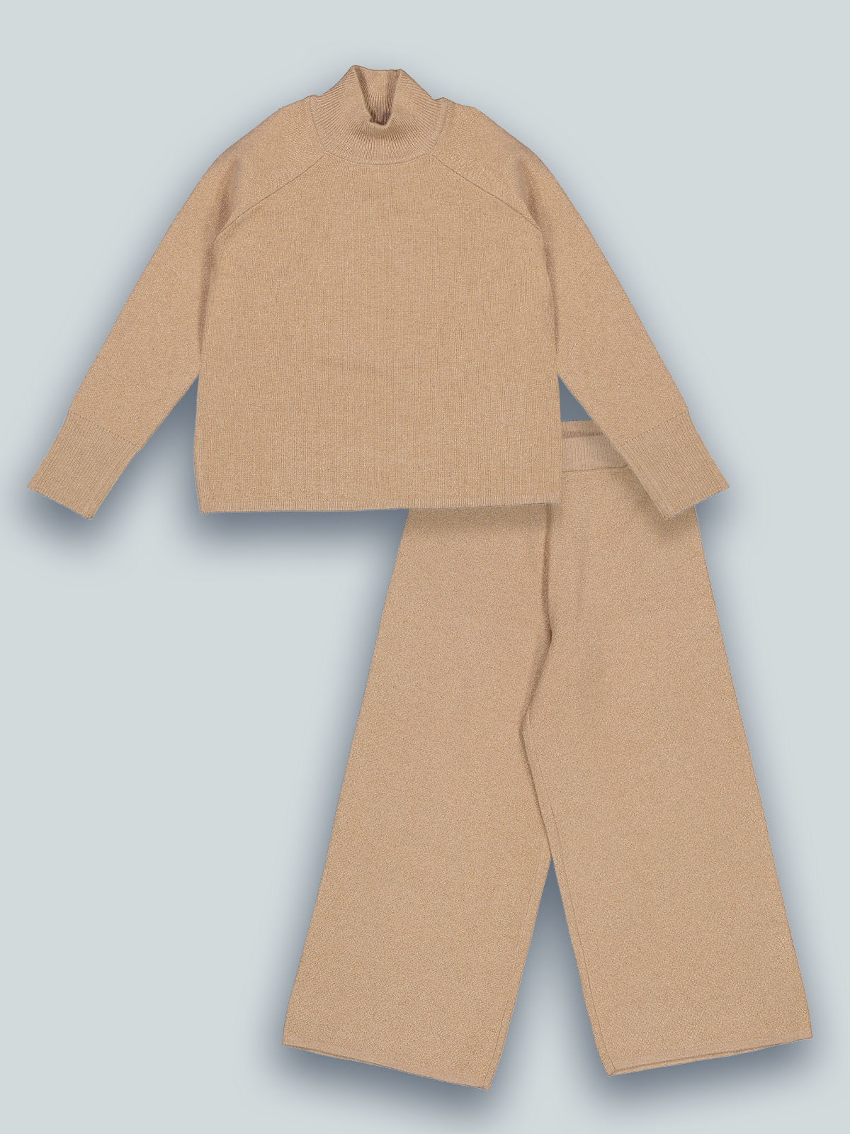 Completo due pezzi in morbida e calda maglia con lurex. Maglia a lupetto manica lunga modello corto a scatoletta. Pantaloni a palazzo von vita elasticata per maggiore comoditร  di indosso. Un capo super trendy.