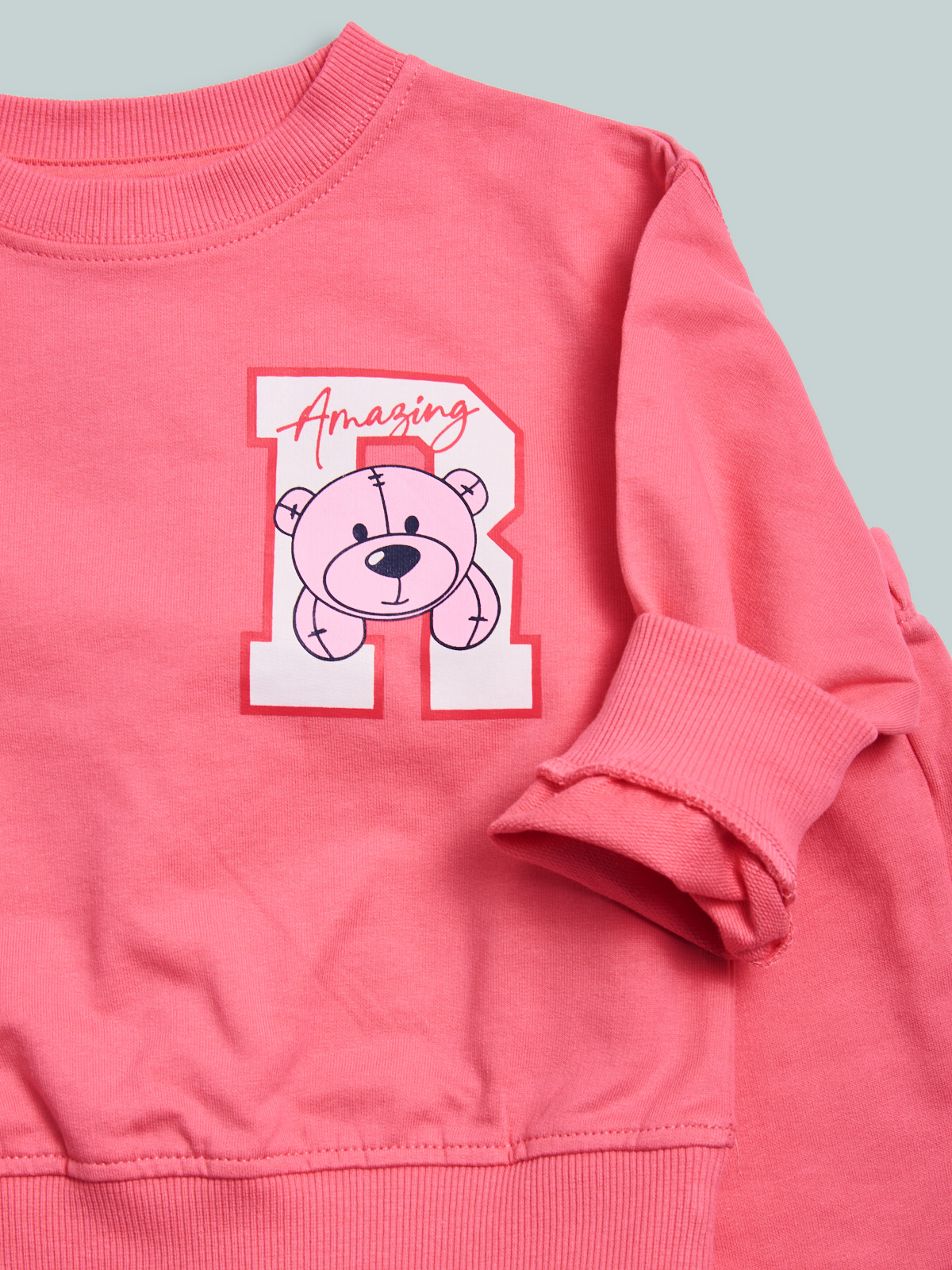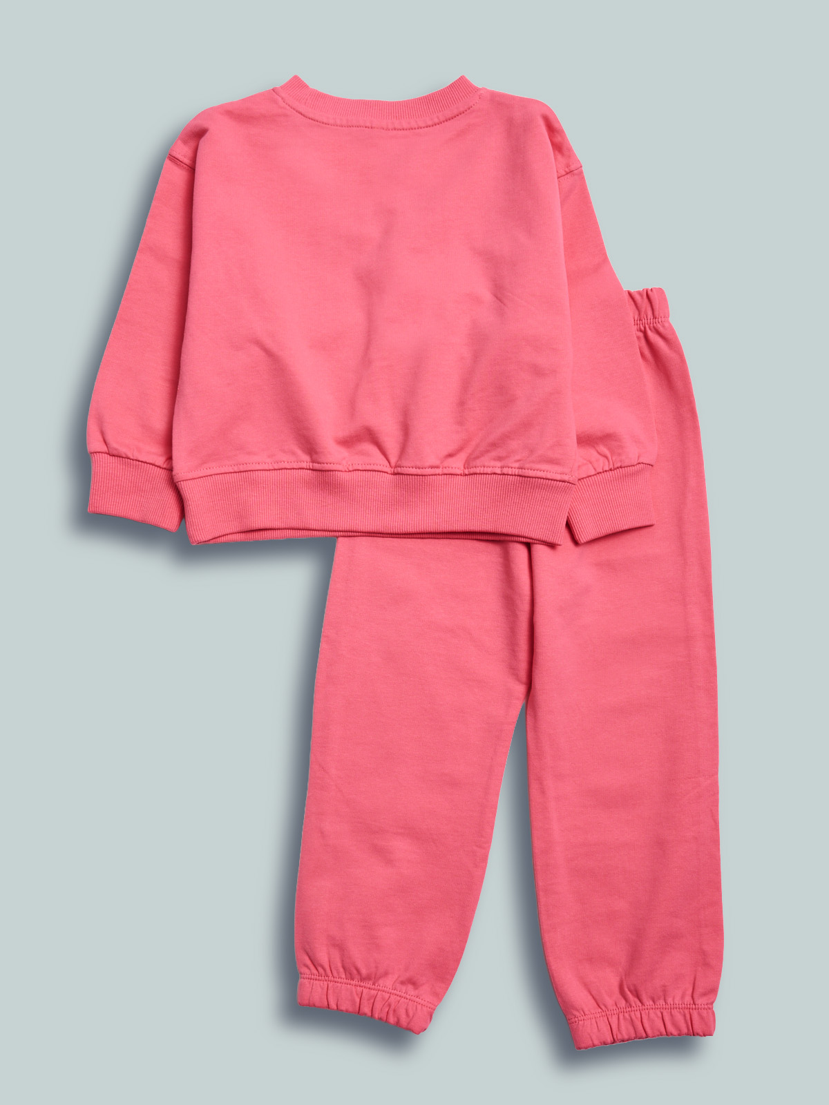 Completo due pezzi in leggera e morbida felpa. Maglia girocollo con stampa orsetto sul davanti sinistro. Pantaloni con vita elasticata per maggiore comoditร . Un completo ideale da indossare a scuola e nel tempo libero.