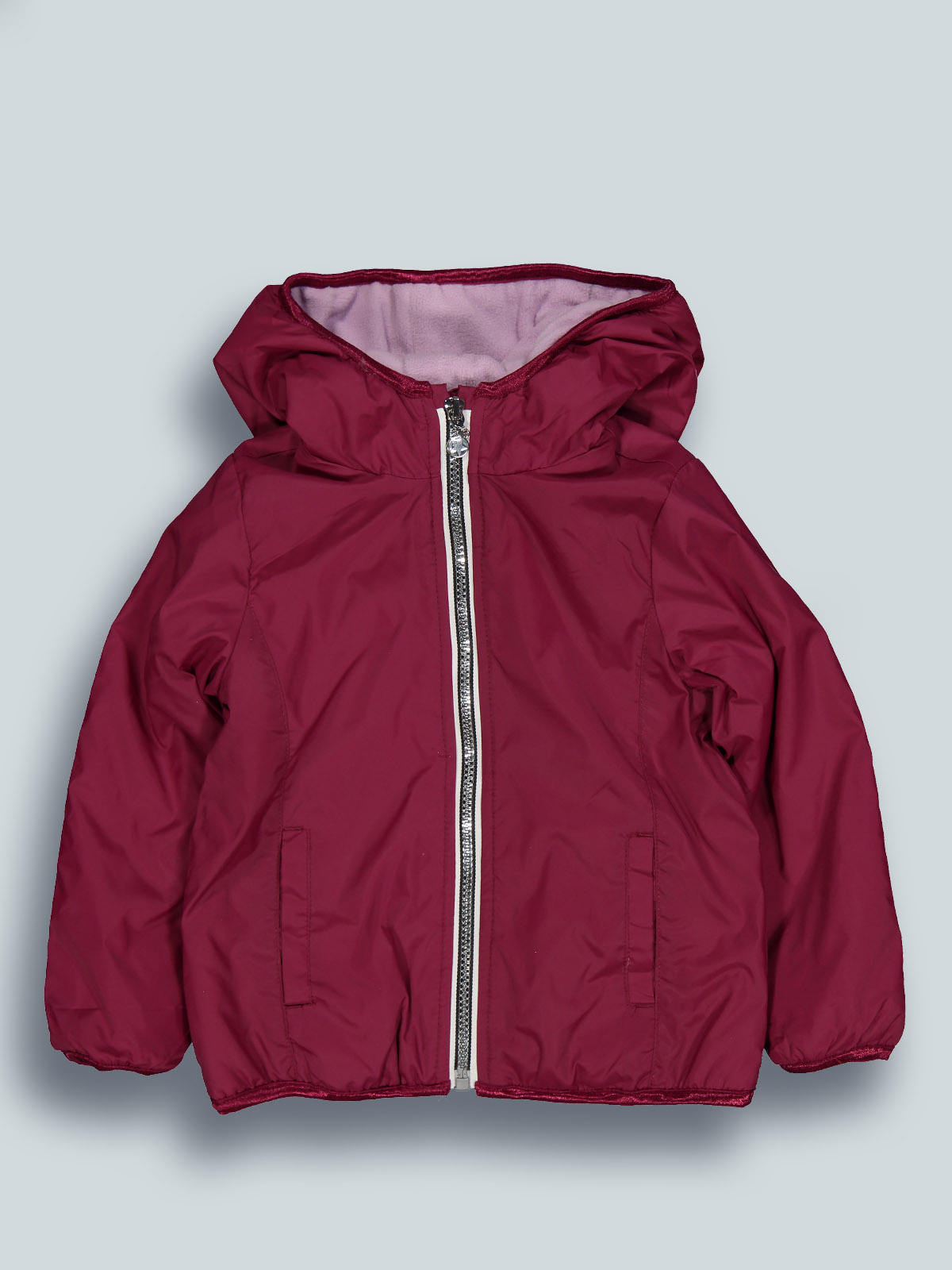Giacca a vento con cappuccio in nylon e imbottitura leggera. Foderata internamente in morbido pile in contrasto di colore. Bordi in fettuccia tubolare cangiante tono. Un capo molto confortevole e pratico, ideale per il back to school e per i primi freddi di stagione.