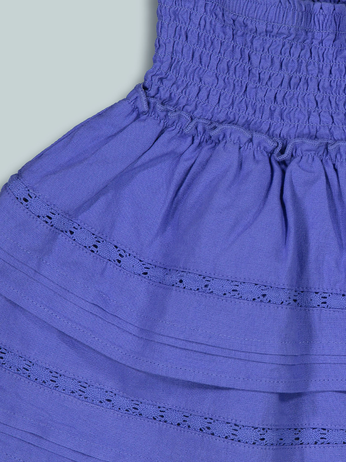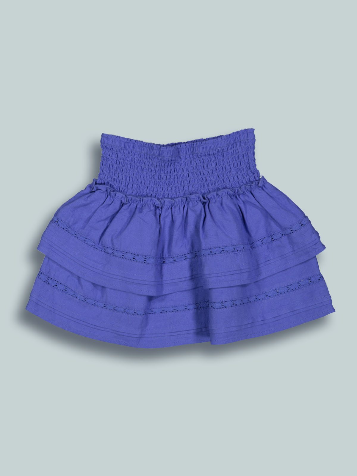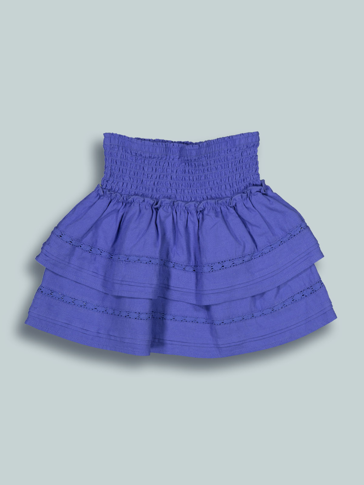 Gonna ampia in lino viscosa, vita elasticata con punto smock. Fettuccia traforata sulle balze davanti e dietro. Un capo sfizioso e molto femminile.