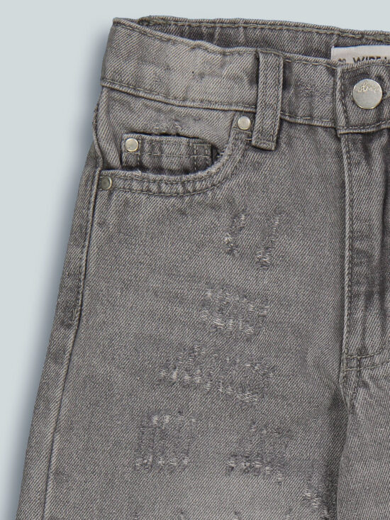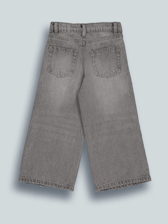 Pantaloni in denim grigio modello wide leg. Vita con elastico regolabile e apertura con zip e bottone. Un capo super glam.