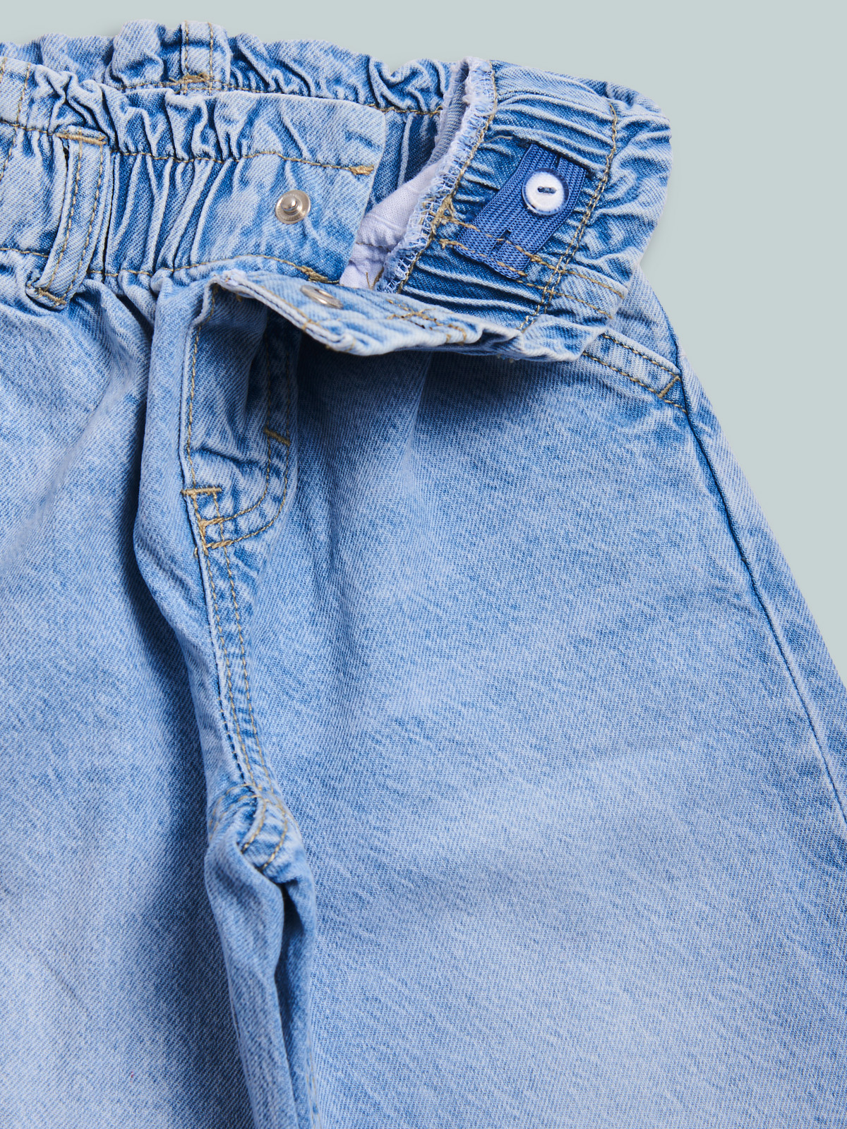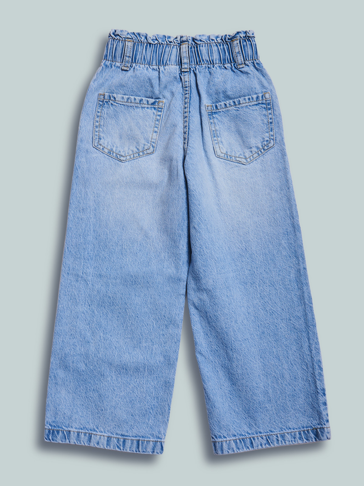 Pantaloni in denim leggero modello wide leg con vita elasticata e elastico regolabile per maggiore comoditร . Funzionalitร  e moda unite in un unico capo.