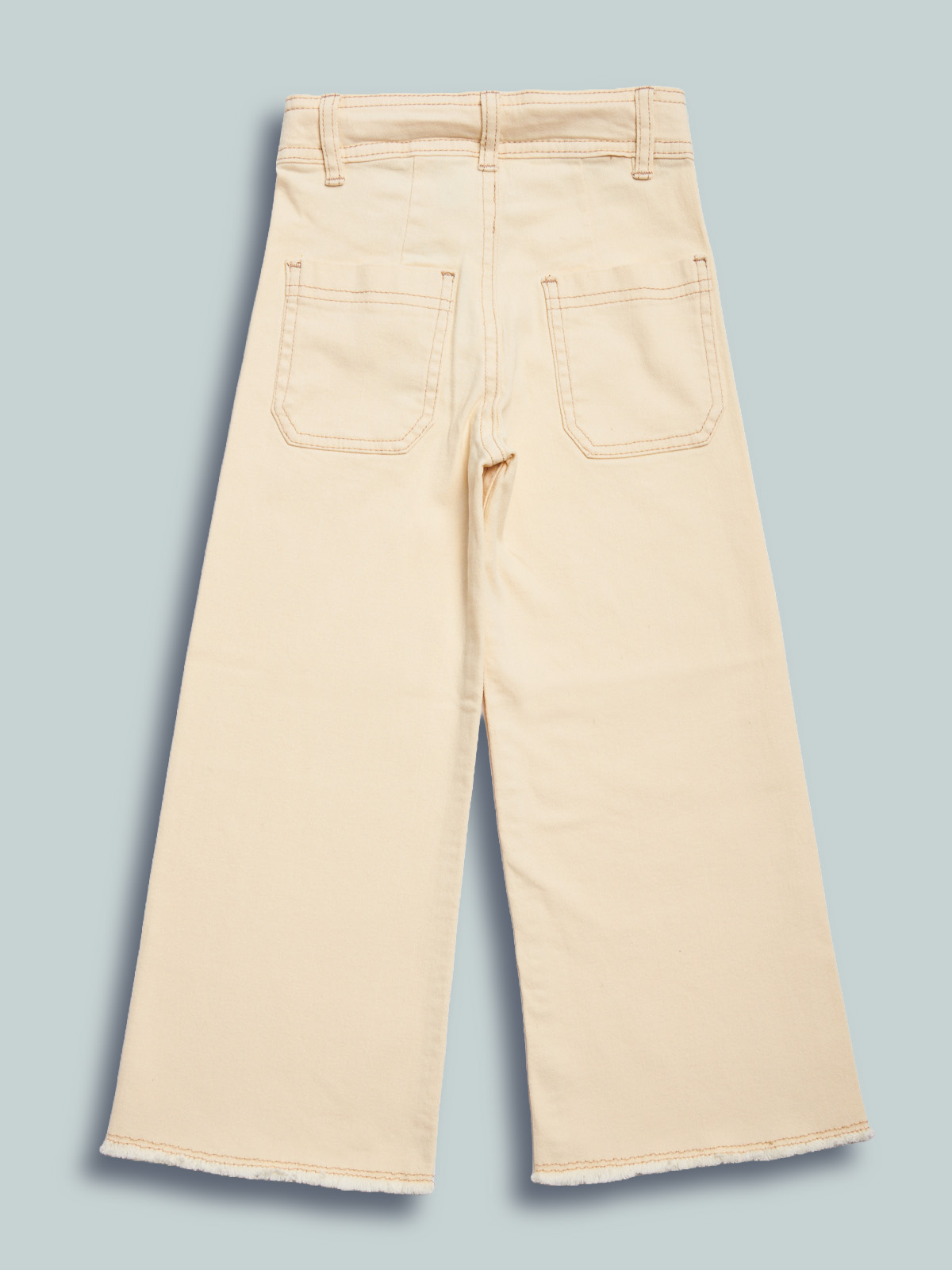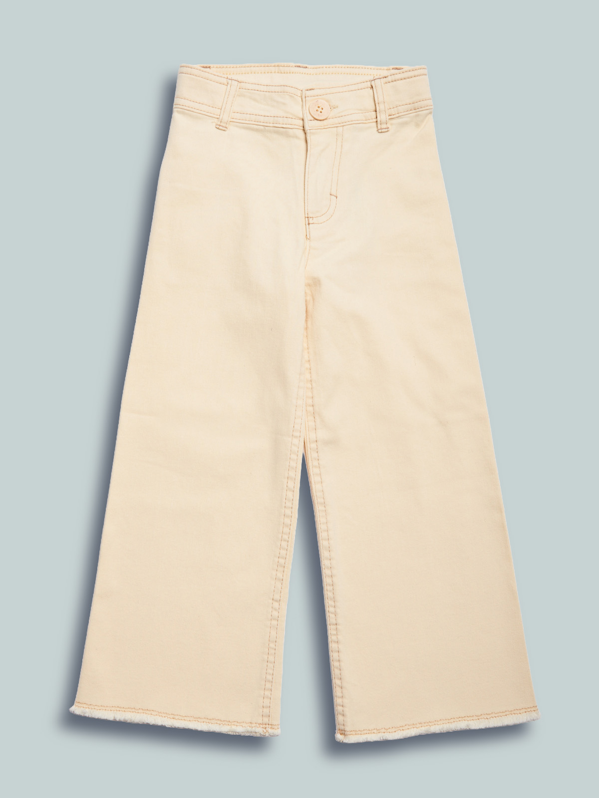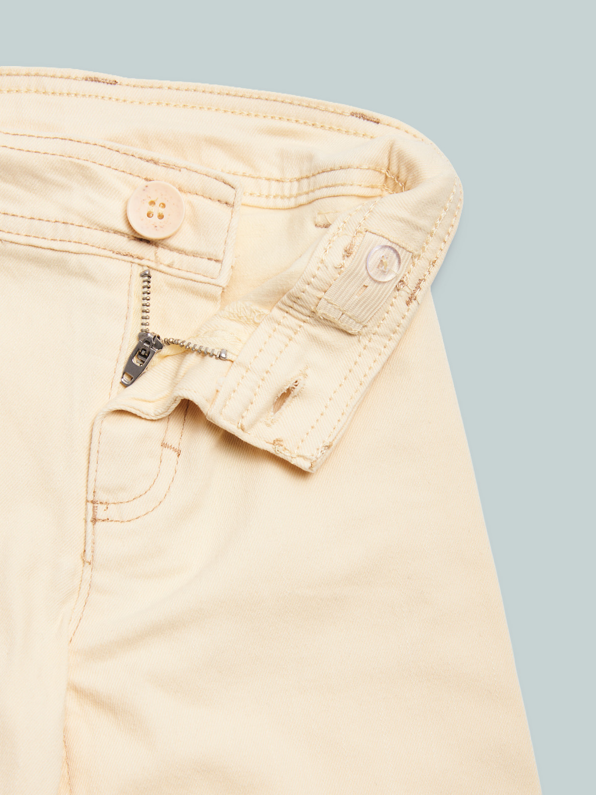 Pantaloni in drill elasticizzato effetto delavรฉ con orlo sfrangiato. Vita regolabile per maggiore comoditร , apertura con zip e bottone. Funzionalitร  e moda unite in un unico capo.