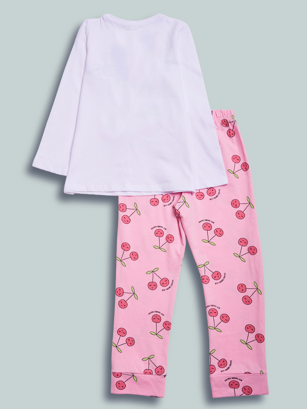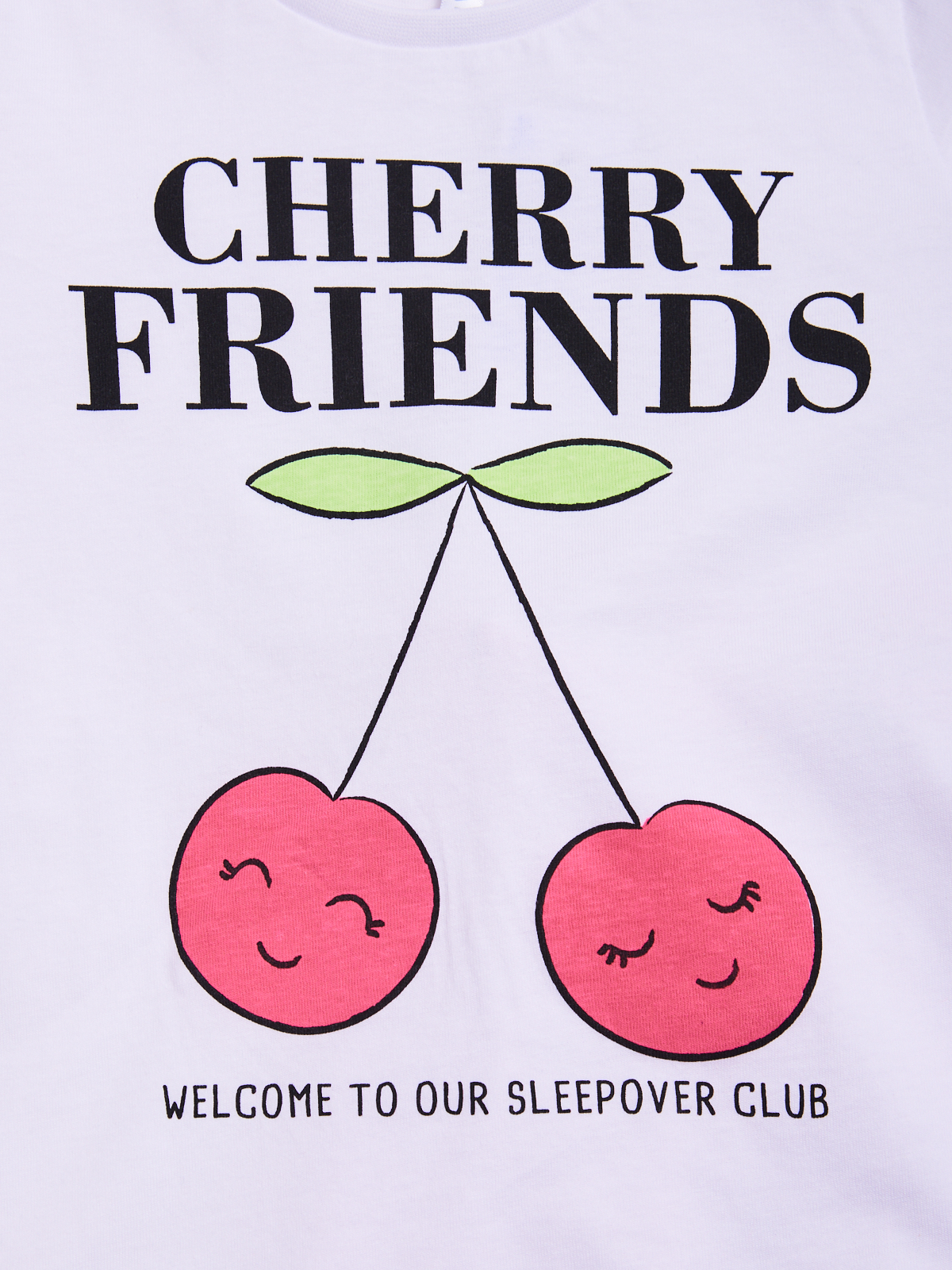 Pigiama due pezzi in morbido cotone. Tshirt manica lunga con simpatica scritta e ciliegie sul davanti. Pantaloni in fantasia ciliegie con vita elasticata per maggiore comoditร . Ideale da indossare nelle nottate primaverili, un capo morbido e comfortevole per fare dolci sogni.