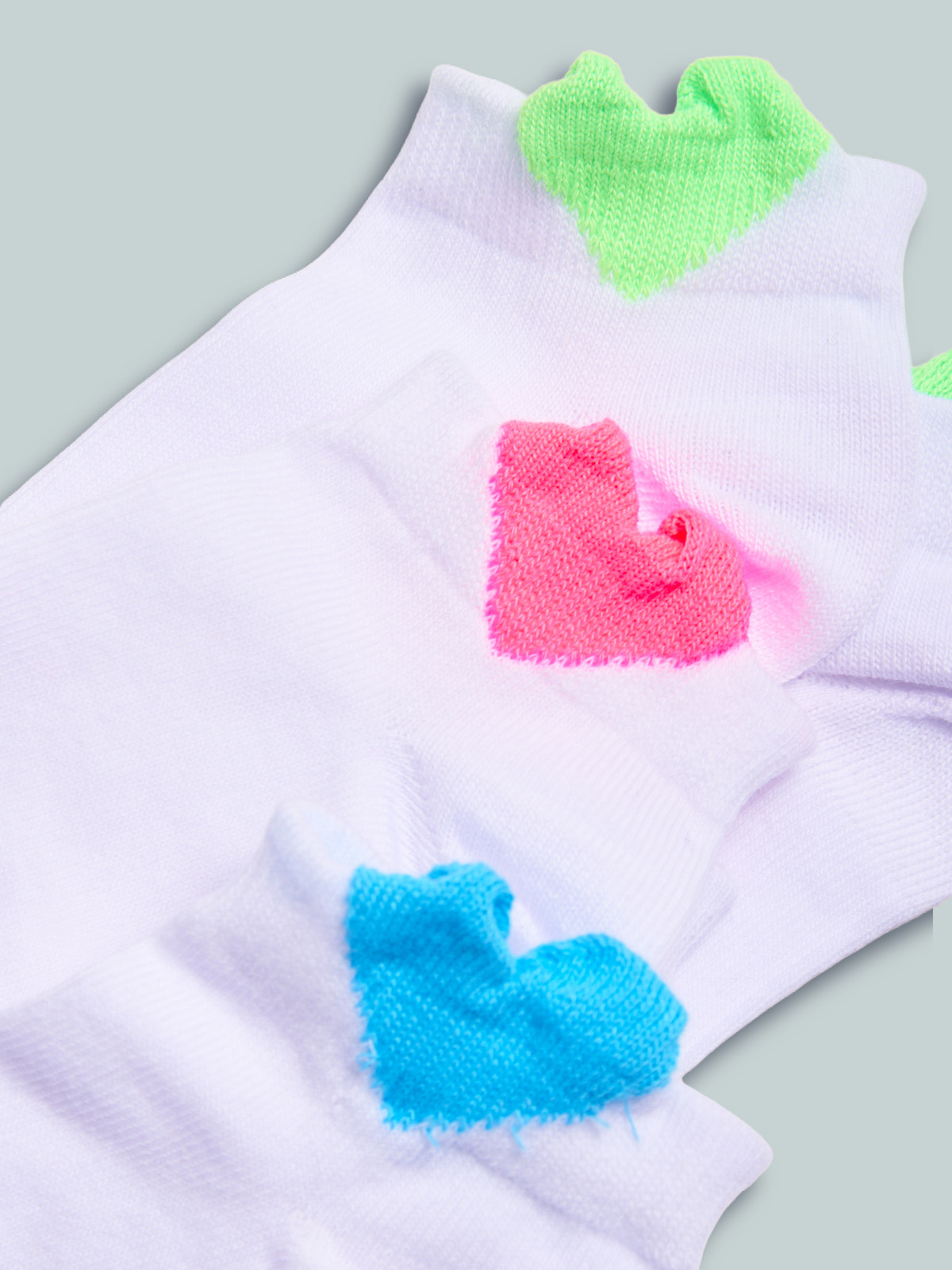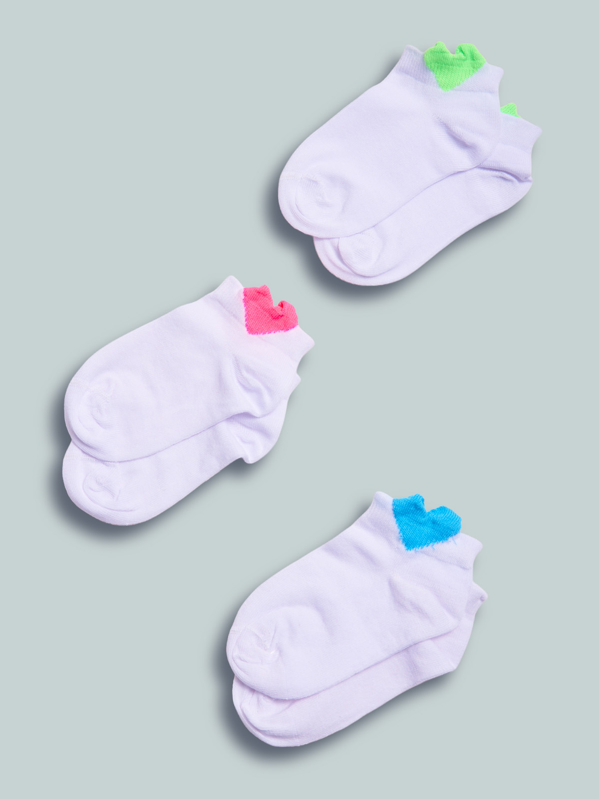 Set tre paia di calzini in maglia di morbido misto cotone con cuoricino colorato. Un set molto pratico ideale per l’estate.