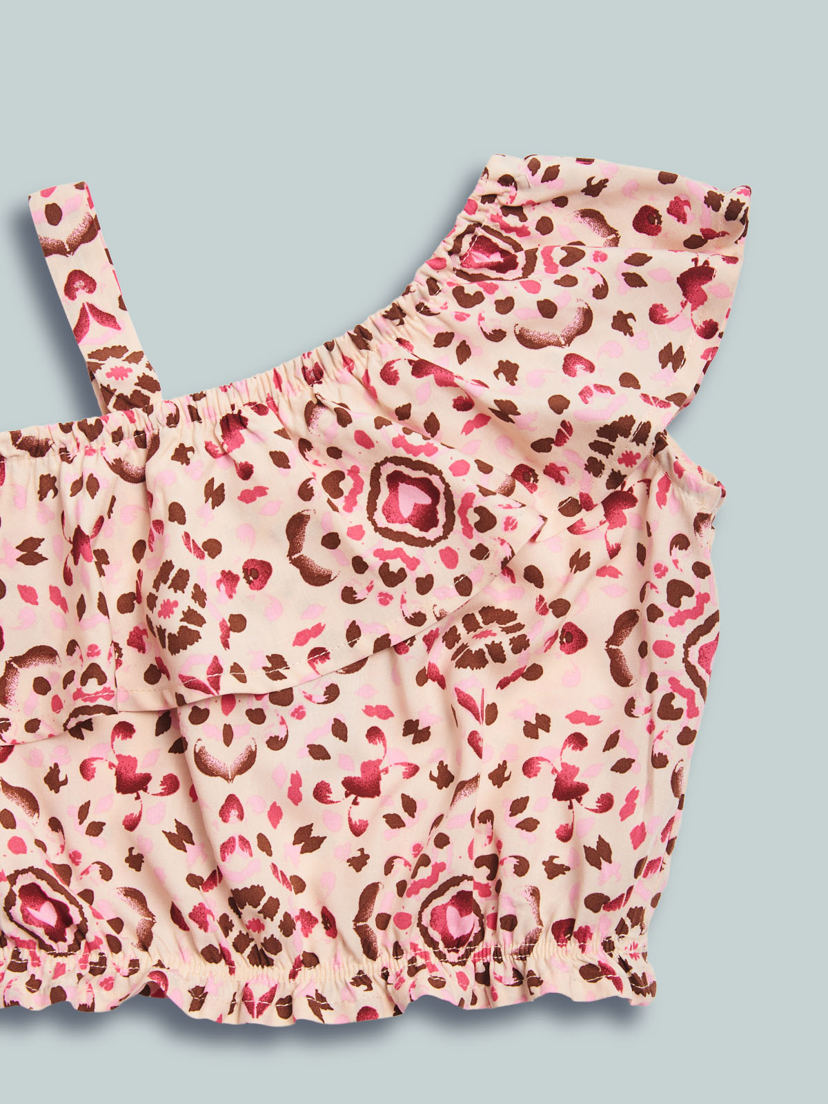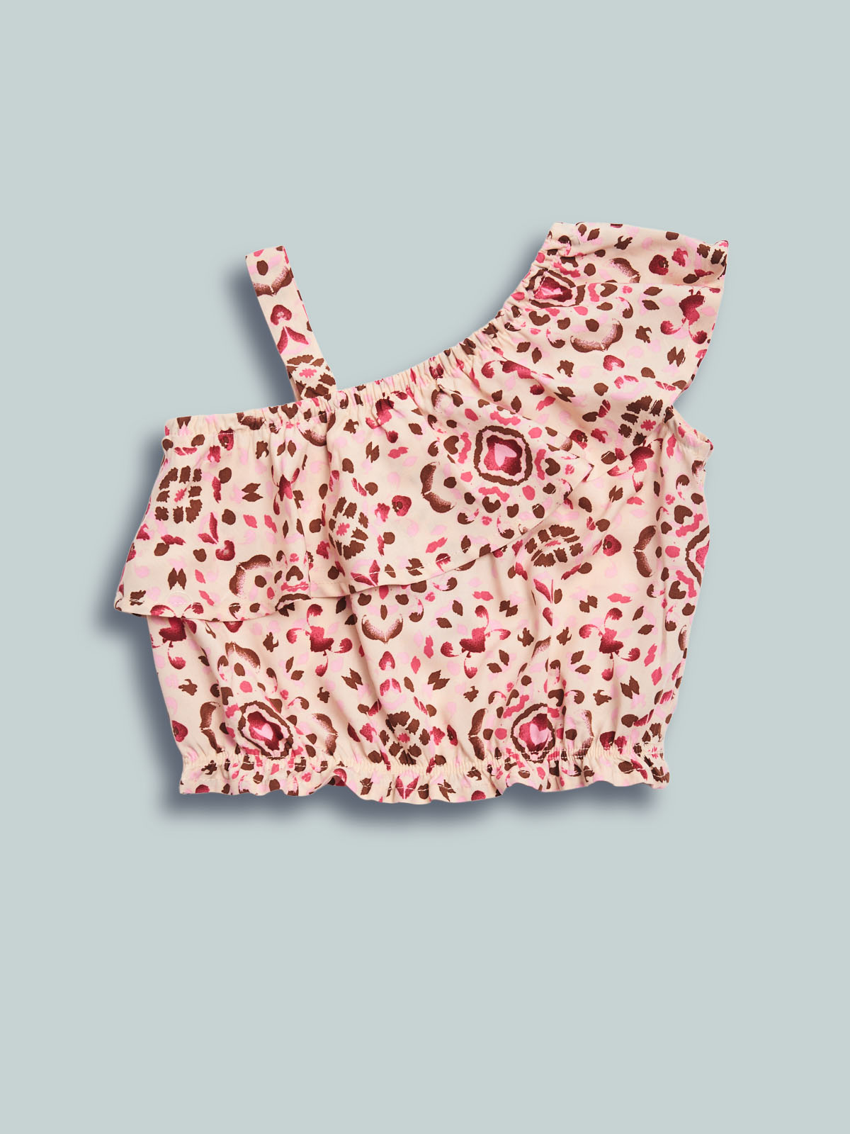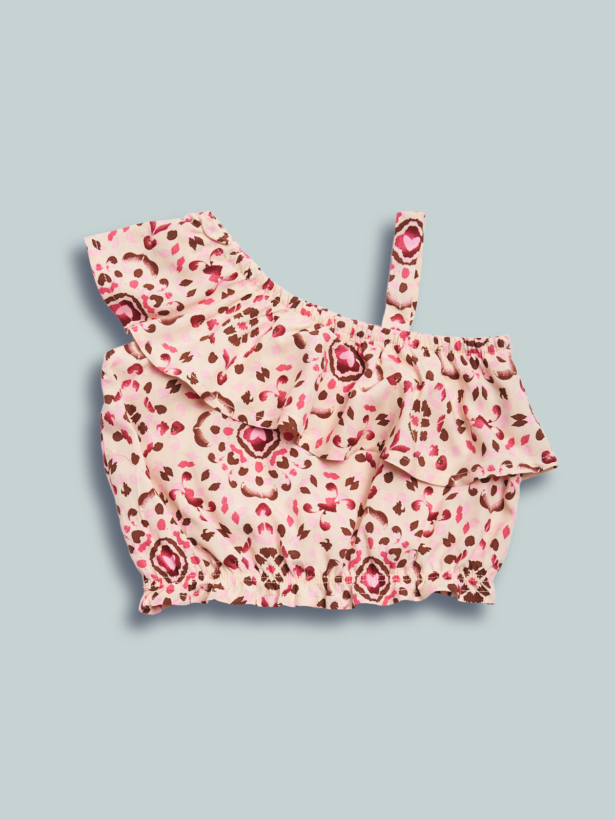 Top monospalla con spallina in tessuto voile di viscosa fantasia etnica, balza su girocollo davanti e dietro. Un capo sfizioso e femminile.