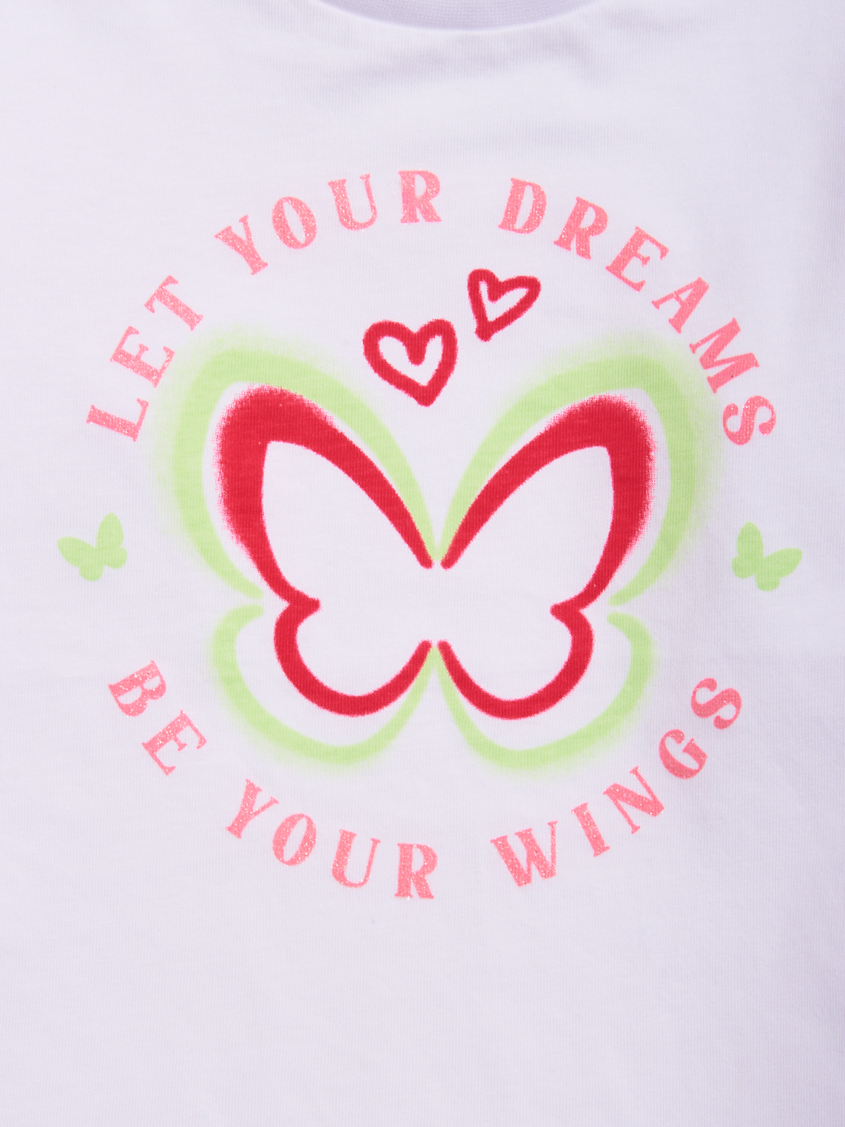 Tshirt in morbido cotone manica lunga stampa scritta e farfalla con glitter sul davanti. Una tshirt essenziale per la scuola e il tempo libero.