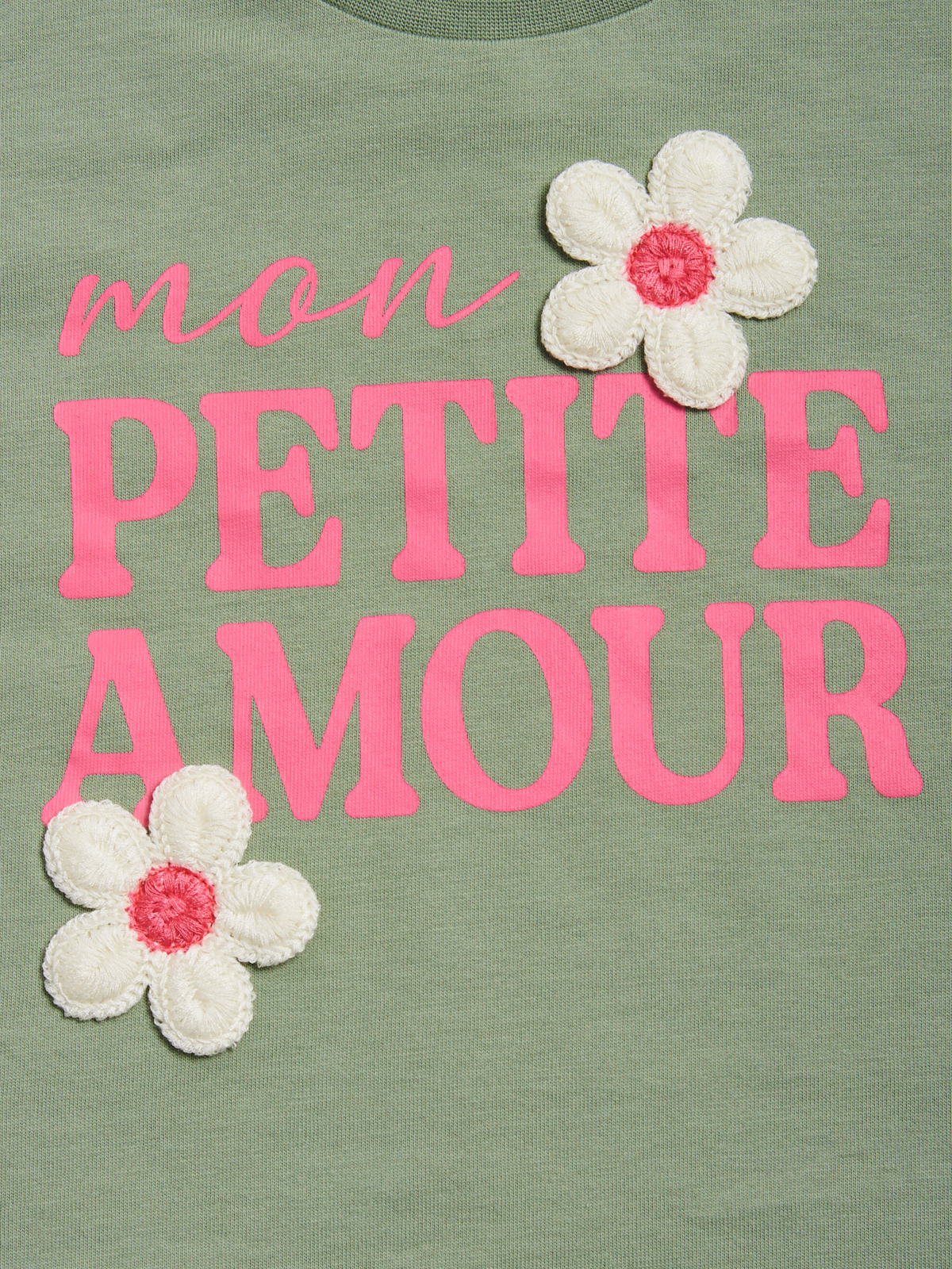 Tshirt in morbido cotone manica corta con risvolto, linea corta e morbida. Fiori in macramรจ con stampa lettering sul davanti. Un capo decisamente sfizioso dai dettagli femminili.