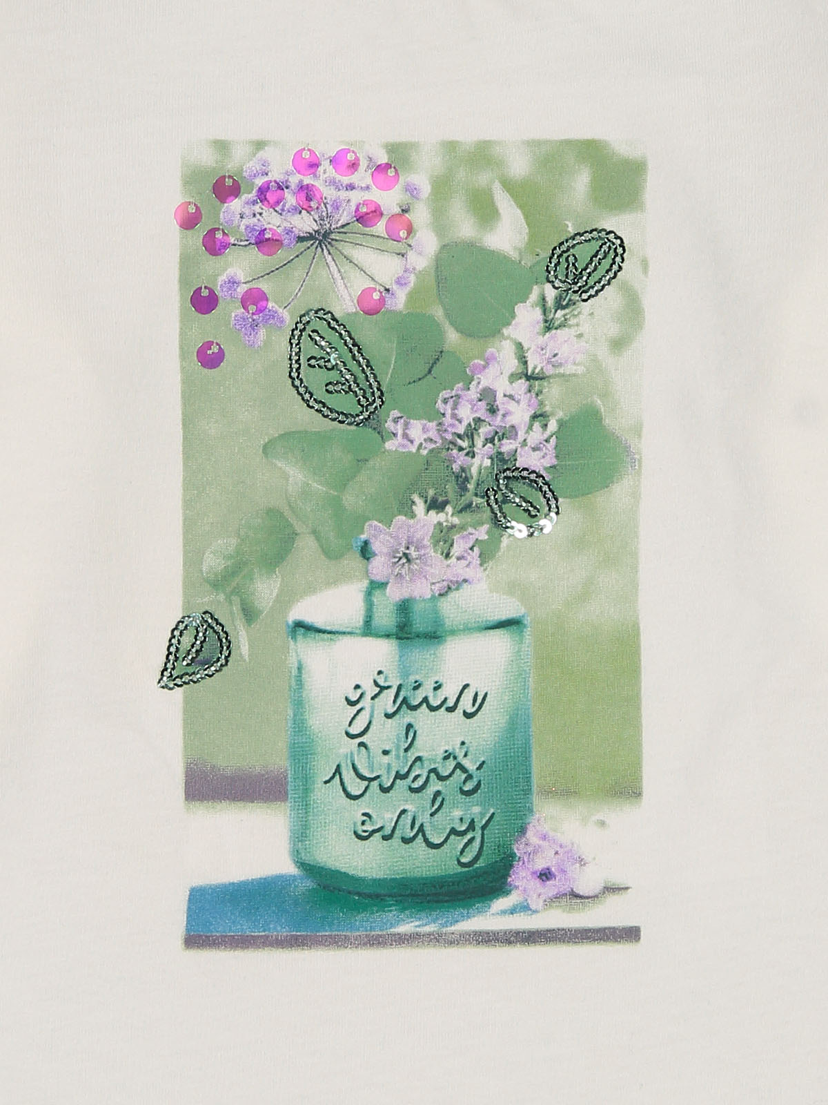Tshirt in morbido e caldo cotone manica lunga, stampa fiori con paillettes tridimensionali sul davanti. Un capo versatile dal look glamour.