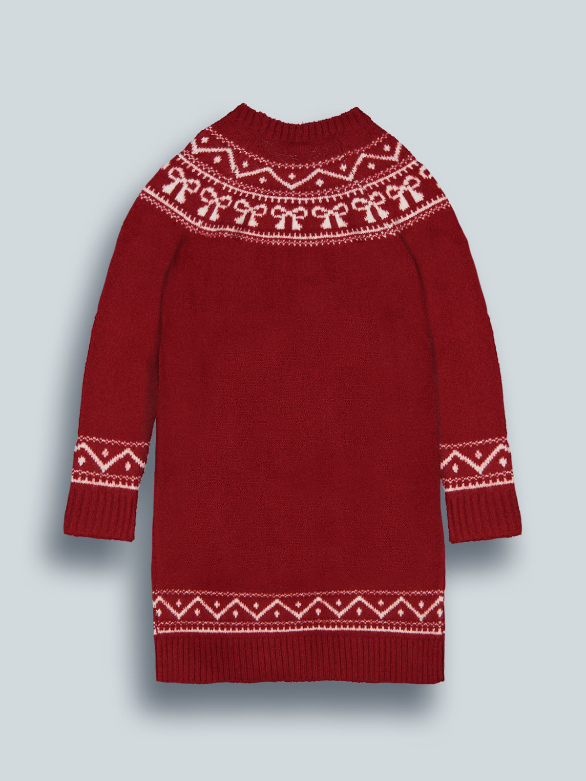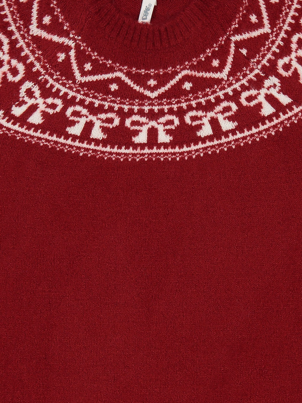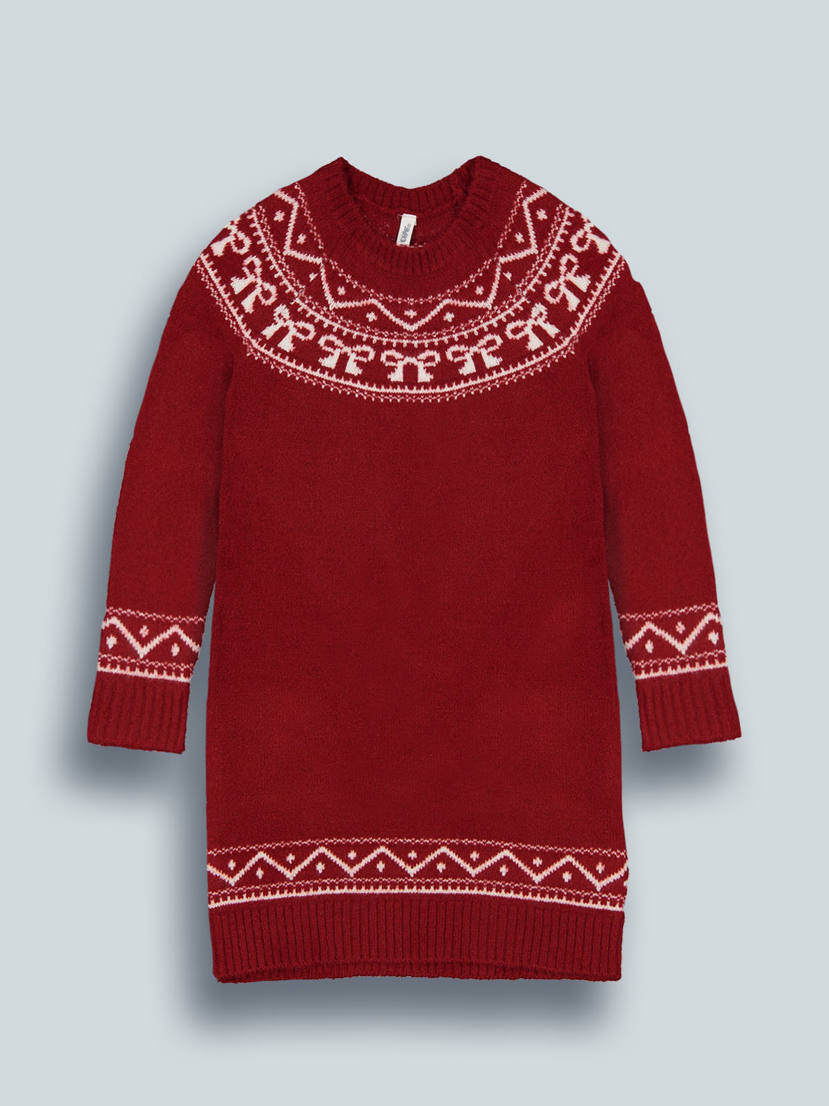 Vestito girocollo manica lunga in morbida e calda maglia con dettaglio jacquard in contrasto di colore. Un capo elegante con dettagli chic, ideale da indossare nel periodo delle feste.