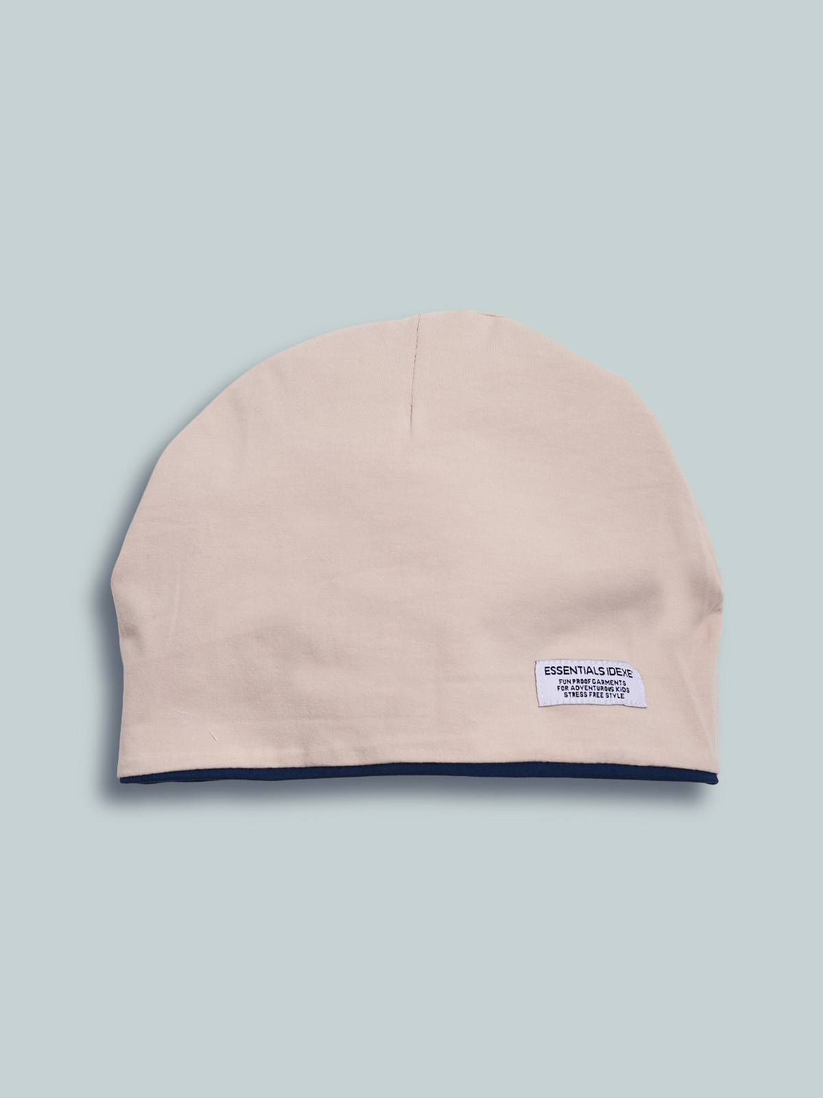 Cuffia in cotone elasticizzato reversibile in tinta unita con stampa ed etichetta. Un capo immancabile per la stagione primaverile.
