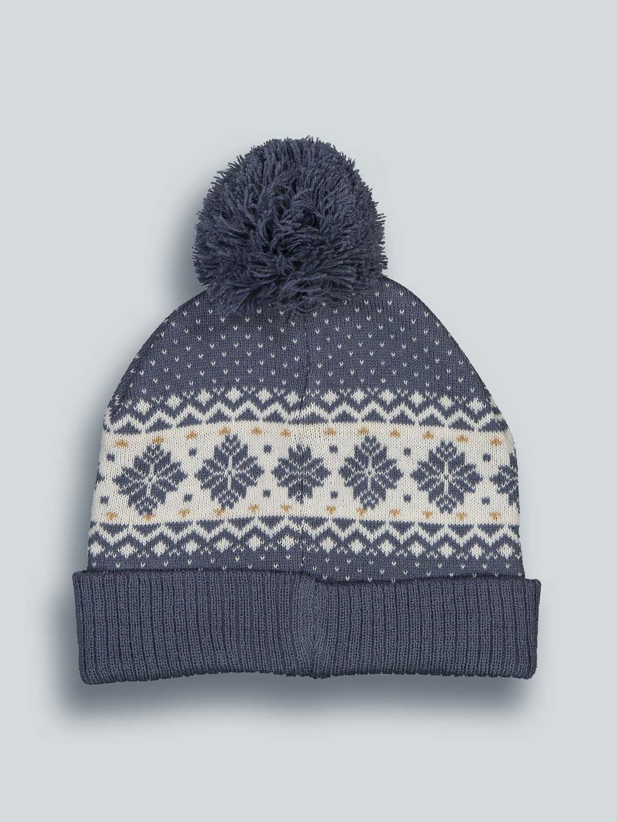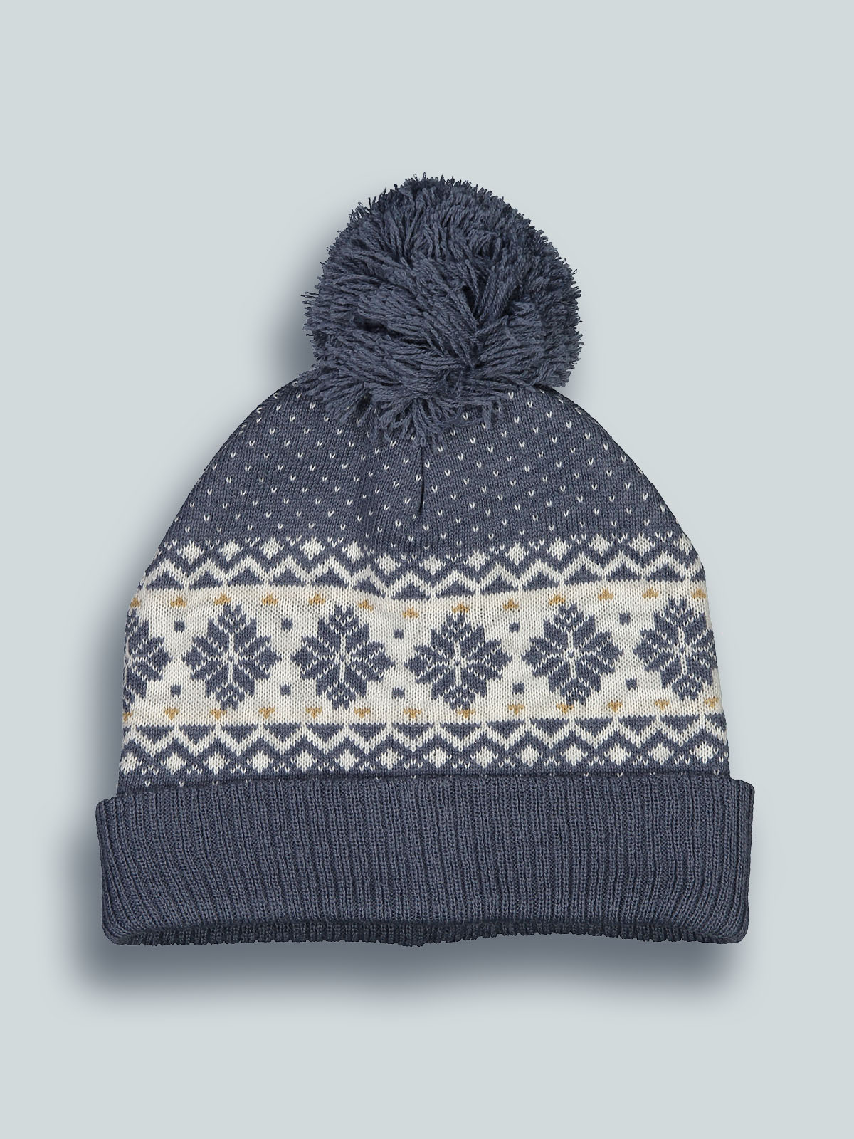 Cuffia in caldo e morbido tricot in una fantasia jacquard che richiama lo stile norvegese. Modello con risvolto e pom pon. Il capo ideale per l’inverno piรน pungente.