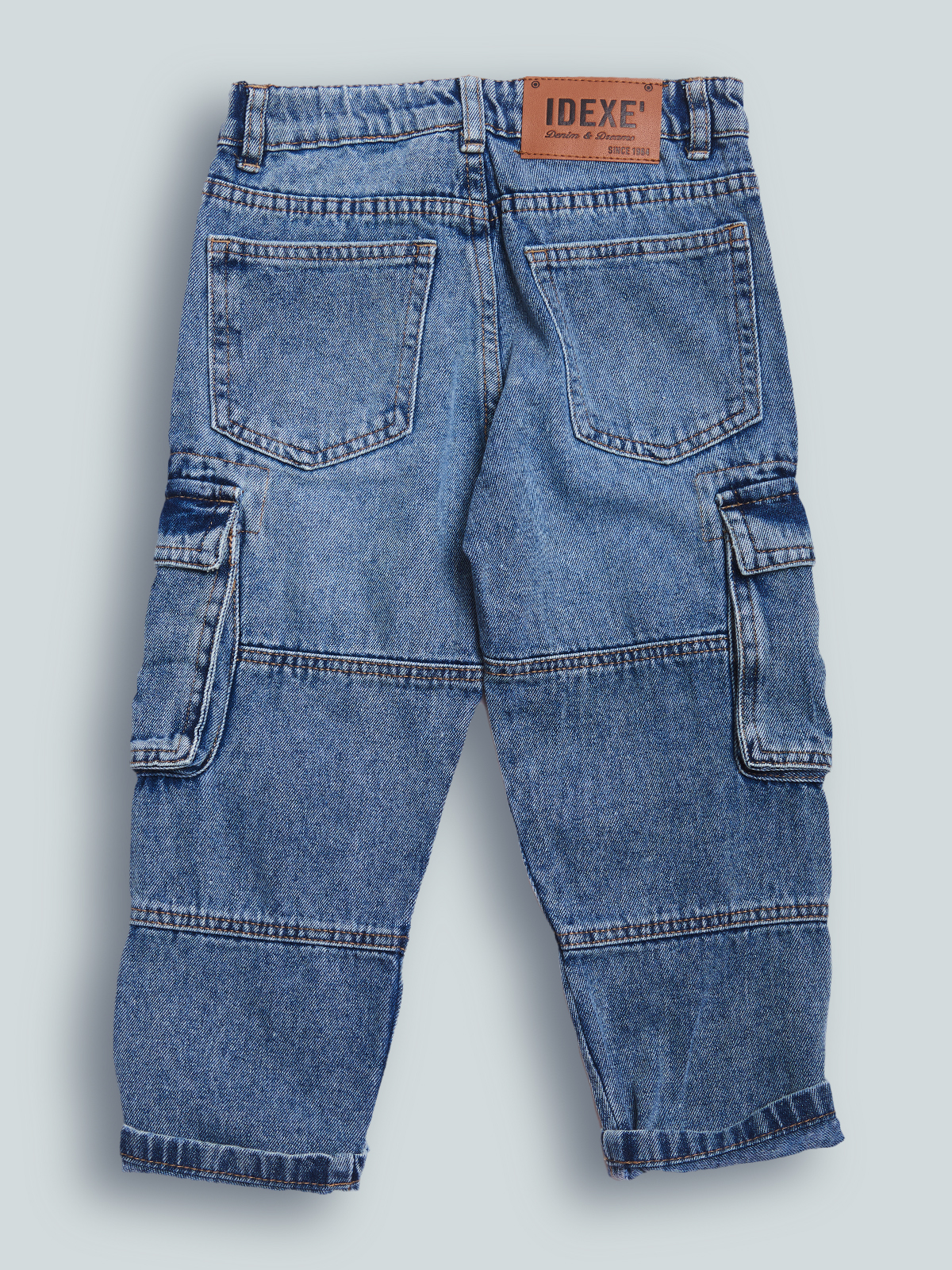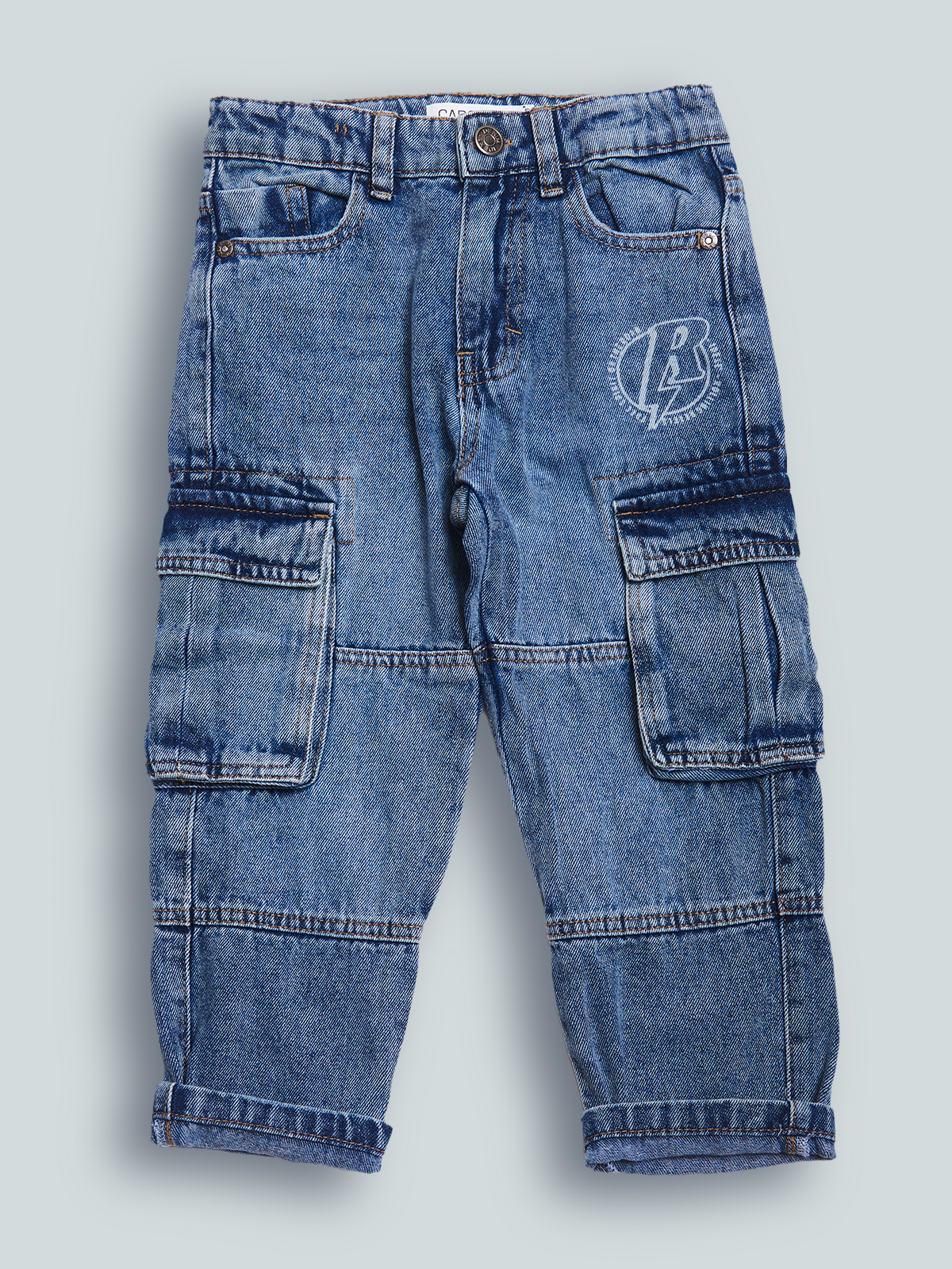 Pantaloni in denim, modello cargo fit dalla linea morbida con tasconi laterali. Apertura con zip e bottone, vita interna con elastico regolabile. Lavaggio chiaro effetto “vintage”, stampa sul davanti. Un capo che segue la tendenza del momento e che non puรฒ mancare nell’armadio del vostro bambino.