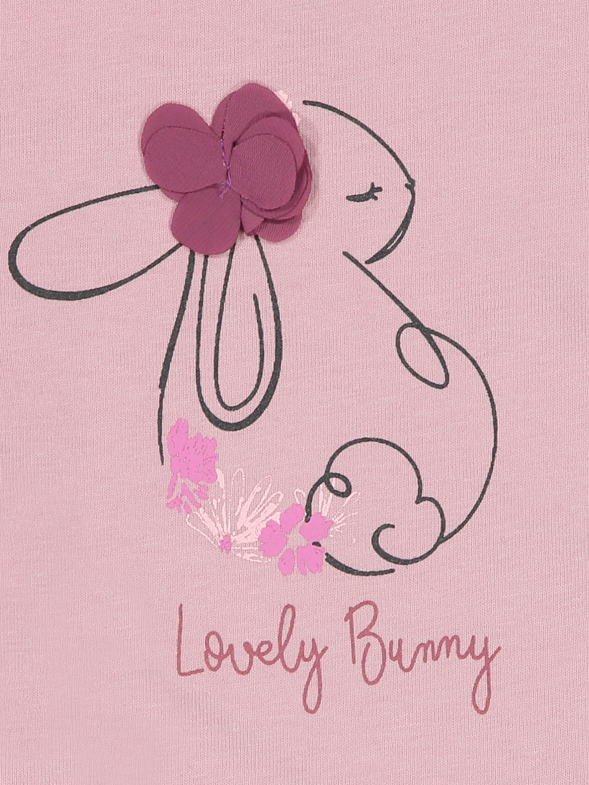 Tshirt in caldo cotone manica lunga con pratica apertura sul dietro grazie ad un bottoncino. Tenera stampa coniglio con fiore tridimensionale in applicazione voile. Un capo di facile abbinamento e ideale da indossare all’asilo e nel tempo libero.