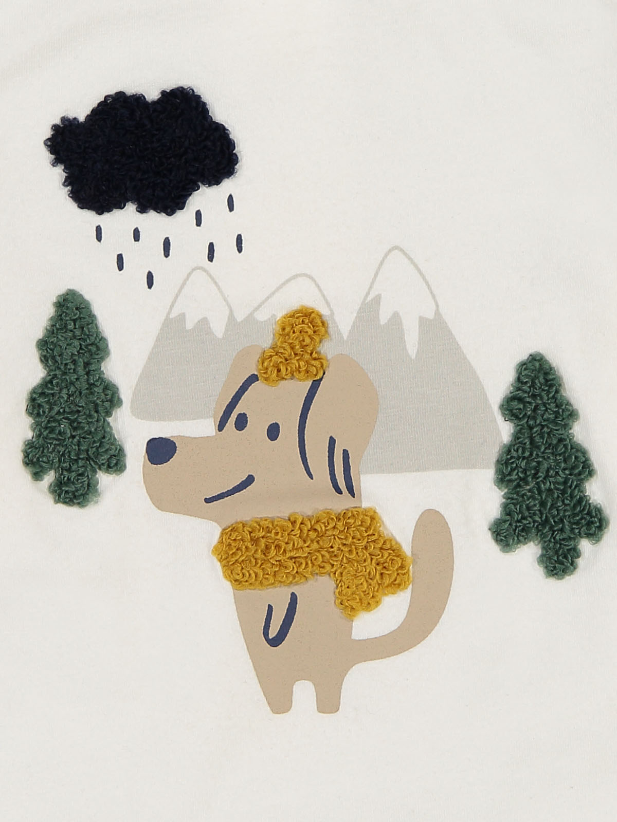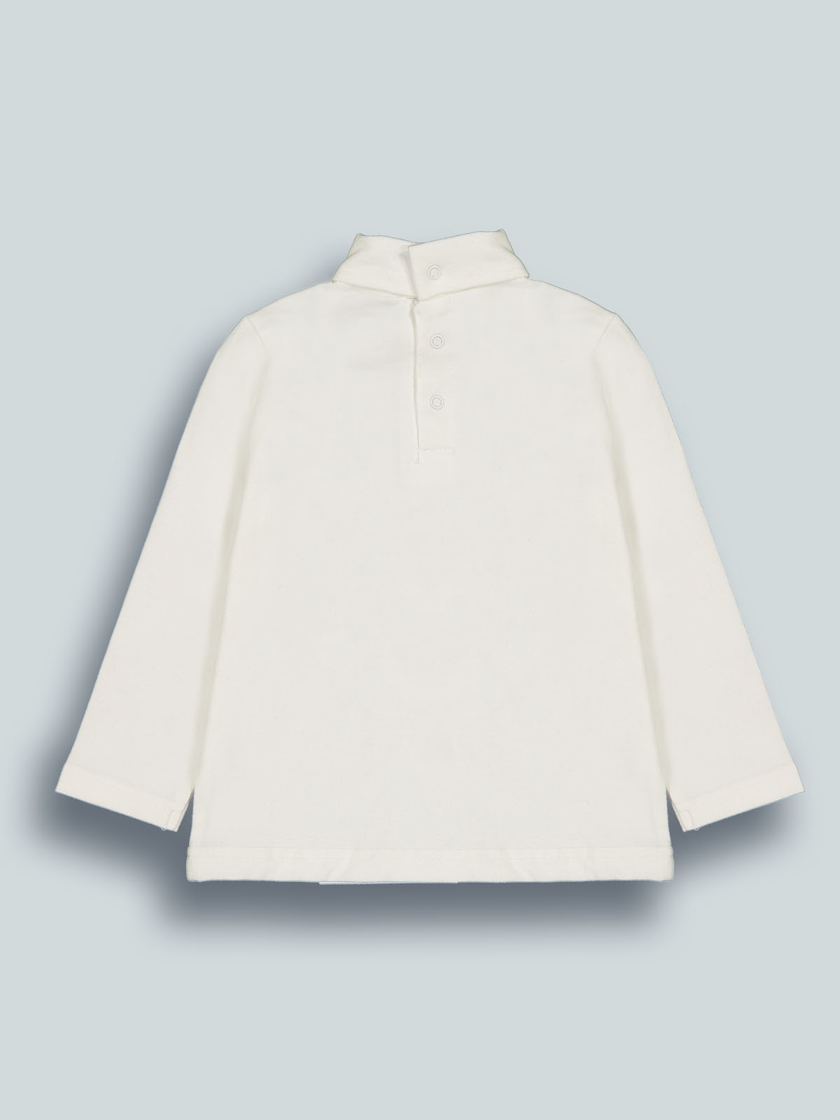 Tshirt dolcevita a manica lunga in caldo cotone elasticizzato con collo risvoltato, apertura dietro con pratici bottoncini a pressione. Stampa e ricamo effetto spugna sul davanti. Un capo che si puรฒ abbinare con tutto.