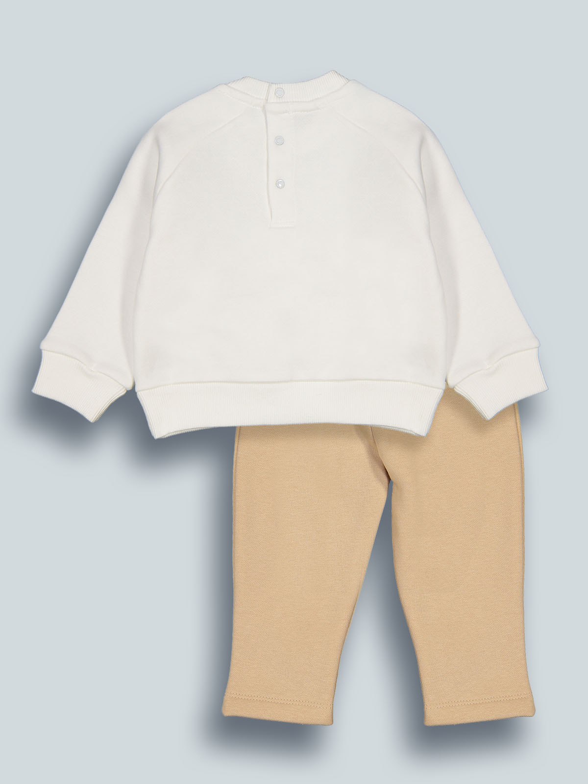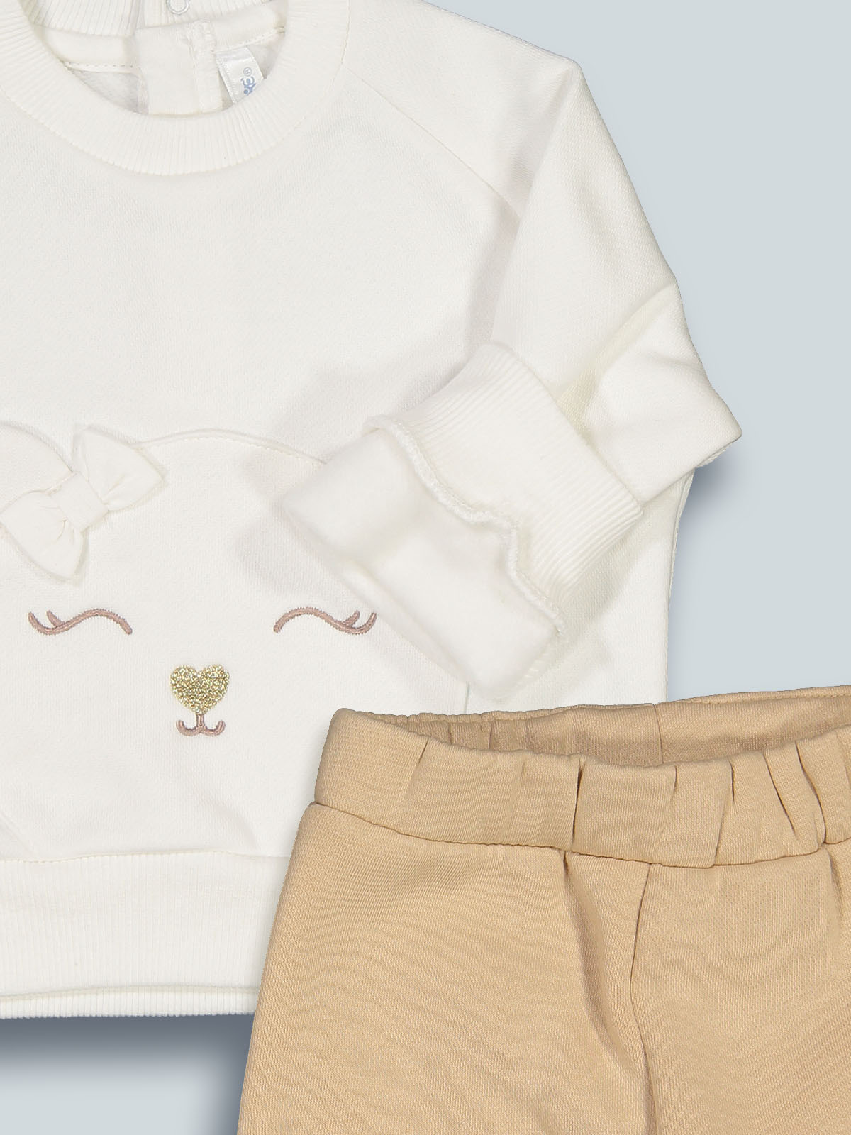 Completo due pezzi in morbida calda mista felpa. Maglia girocollo con peluches in applicazione e simpatico musetto a ricamo. Collo, polsi e fondo in costina. Pantaloni con vita elasticata per maggiore comoditร . L’interno della felpa di questo capo รจ lavorato in maniera tale che le fibre del tessuto si sollevino, rendendolo piรน morbido, soffice e caldo sulla pelle. Un completo essenziale per l’asilo e non solo.