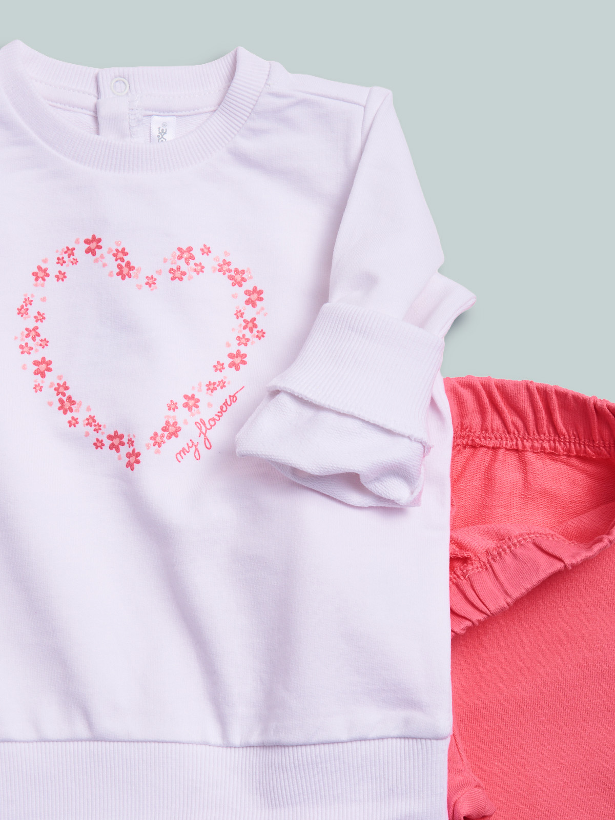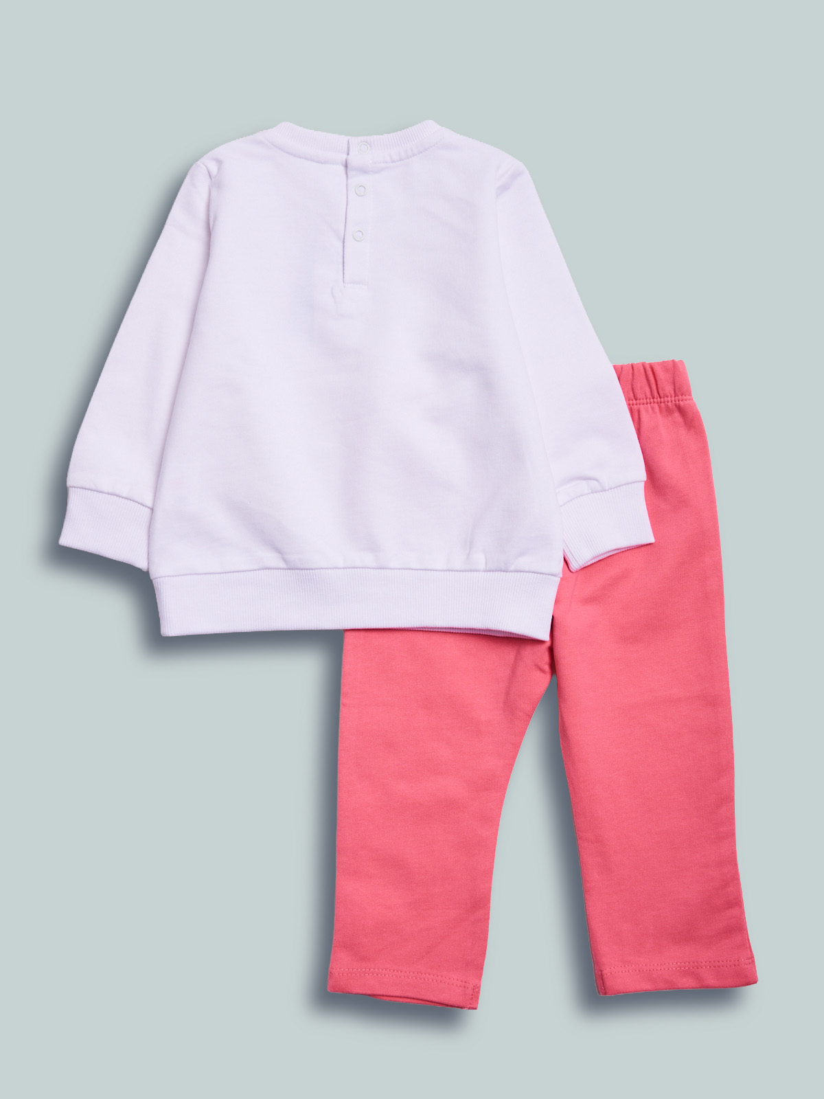Completo due pezzi in morbida felpa leggera. Maglia girocollo manica lunga con pratica apertura sul dietro grazie ai bottoncini a pressione. Simpatica stampa fiori con glitter. Pantaloni con vita elasticata per maggiore comoditร . Un completo molto pratico, ideale da indossare all’asilo e nel tempo libero.