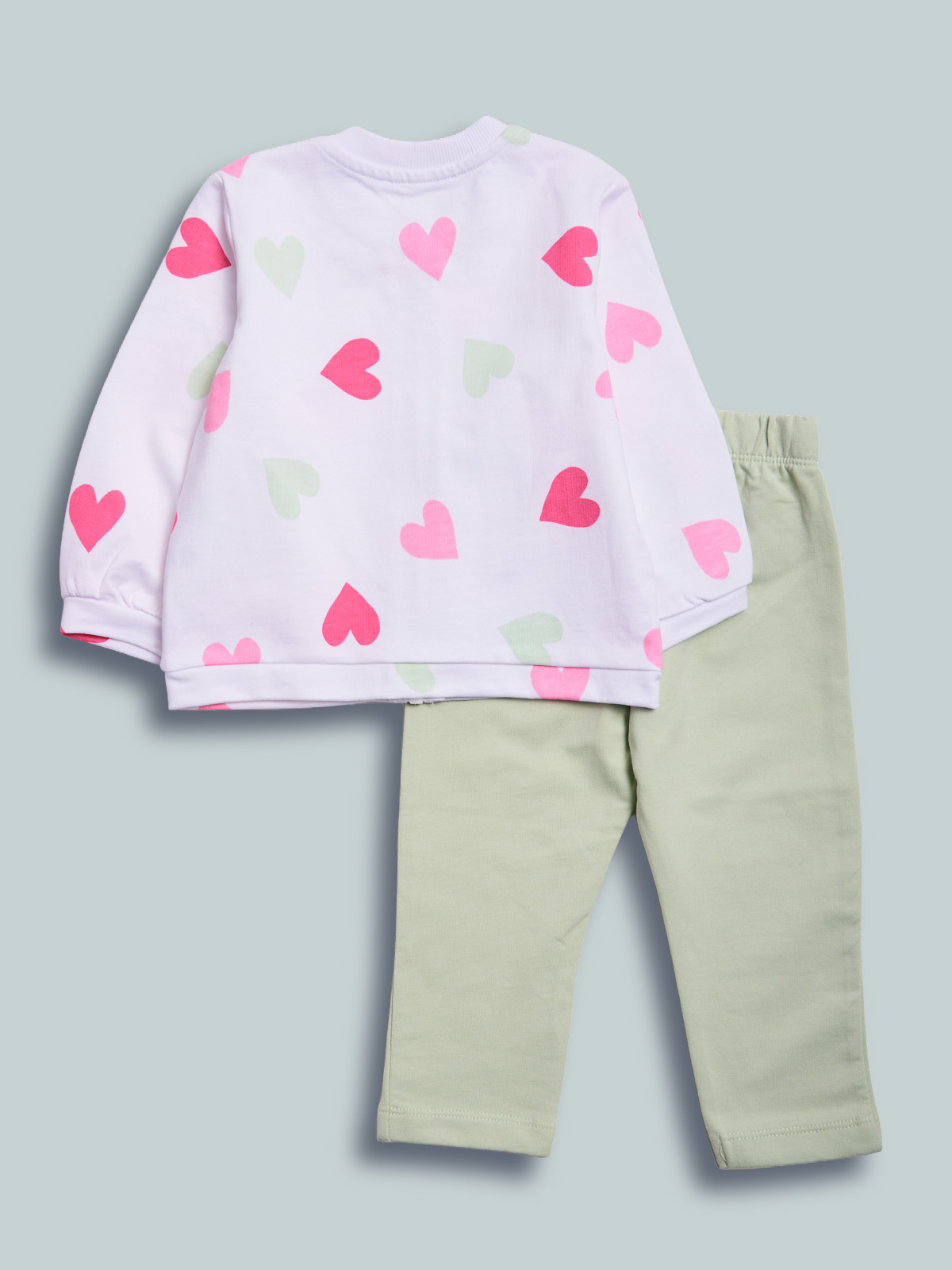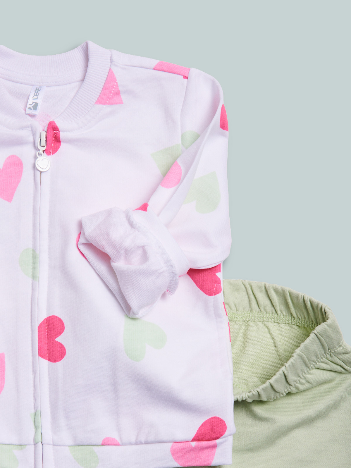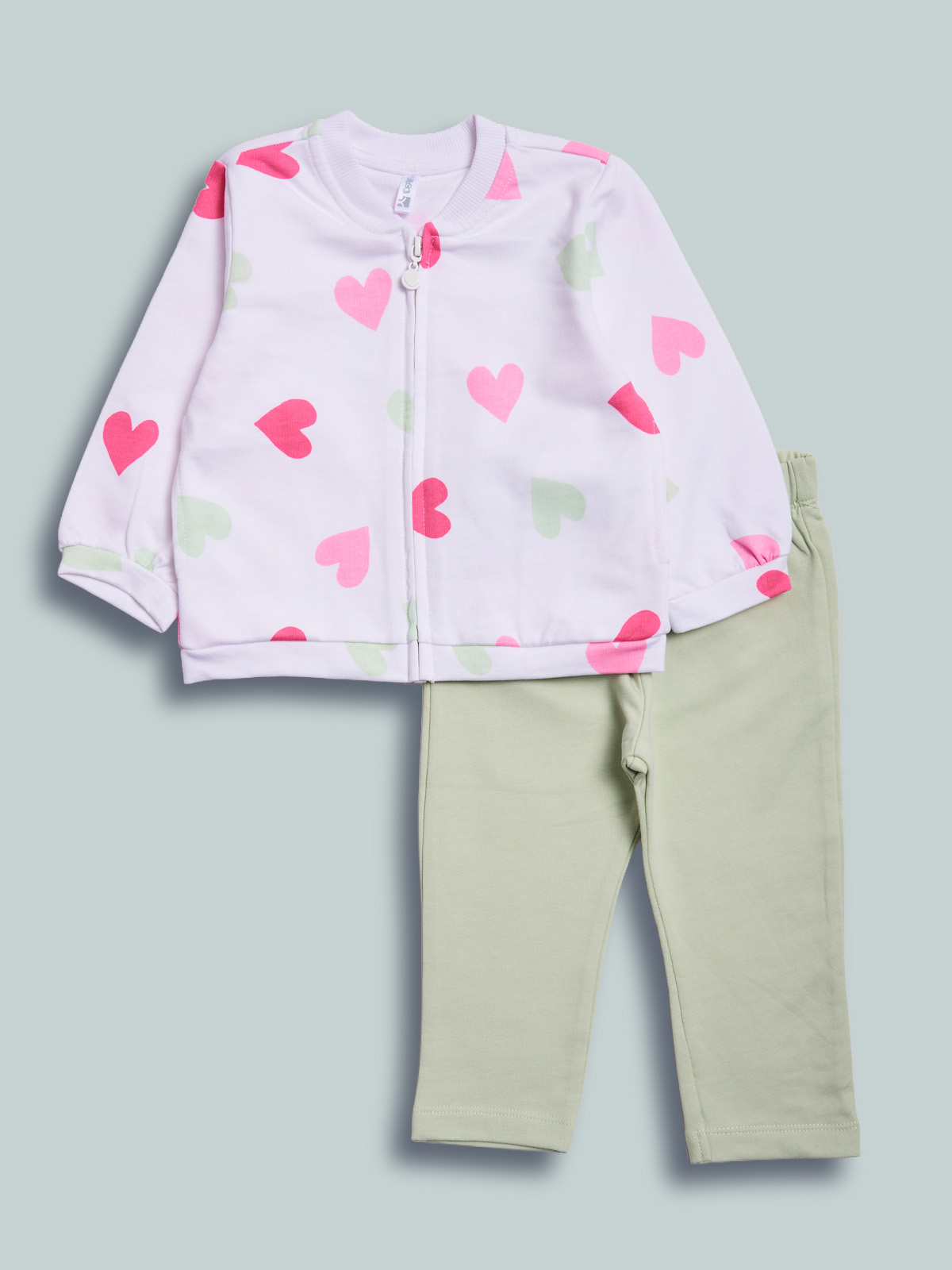 Completo due pezzi in morbida felpa leggera. Cardigan manica lunga, in fantasia cuori. Collo in costina. Pratica da indossare grazie all’apertura frontale con zip. Pantaloni con vita elasticata per maggiore comoditร . Un completo molto pratico, ideale da indossare all’asilo e nel tempo libero.