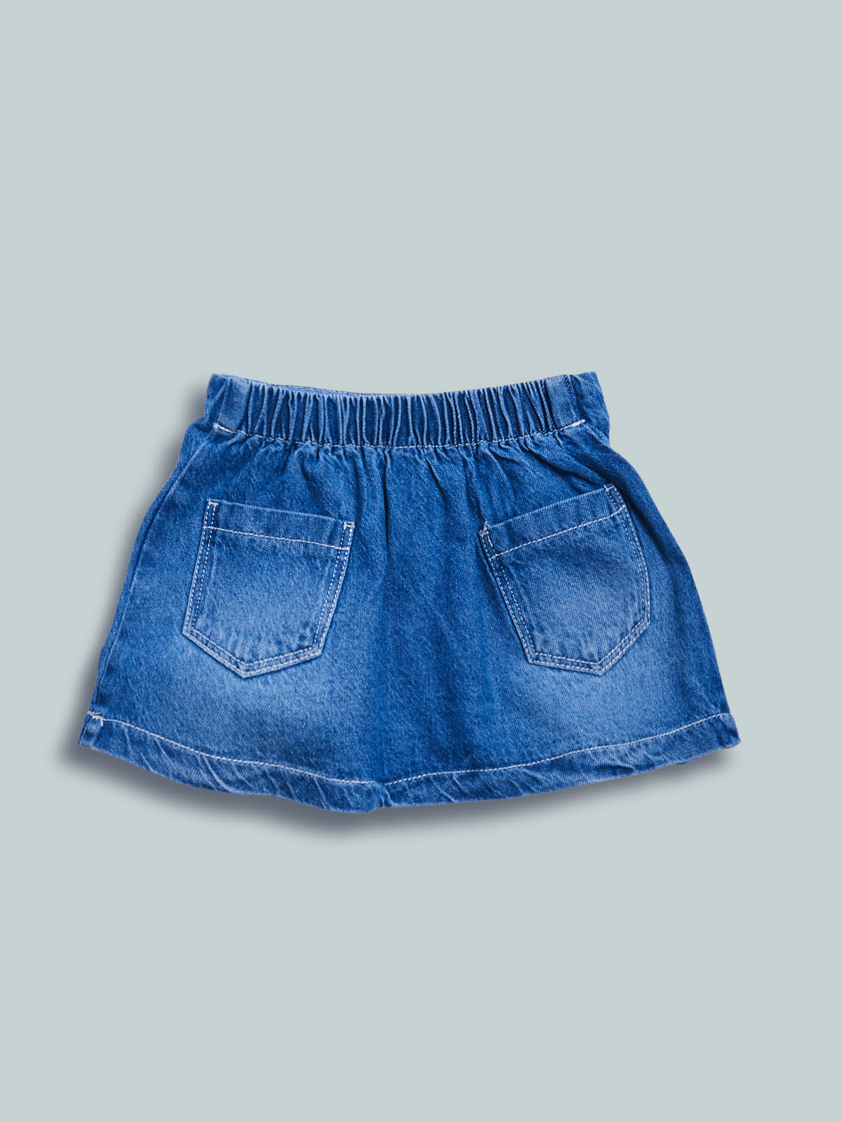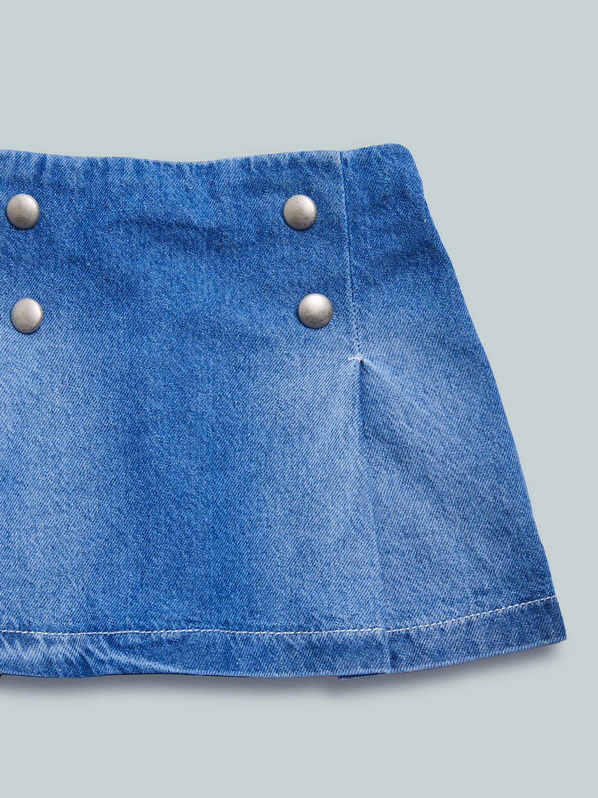Gonna in morbido denim con vita elasticata sul dietro per maggiore comoditร . Motivo sul davanti con pieghe e bottoni. Un capo essenziale per qualsiasi tipo di look.