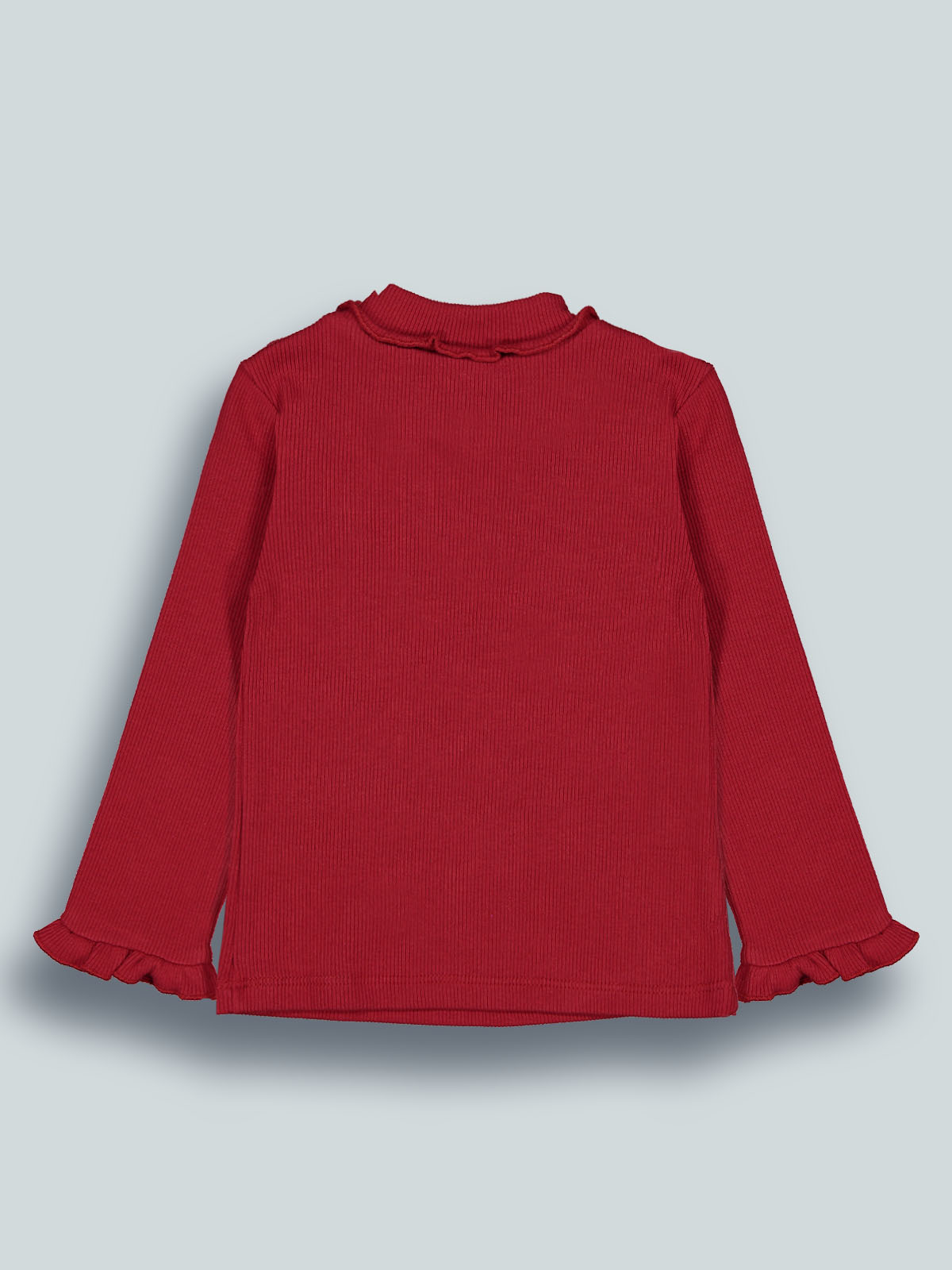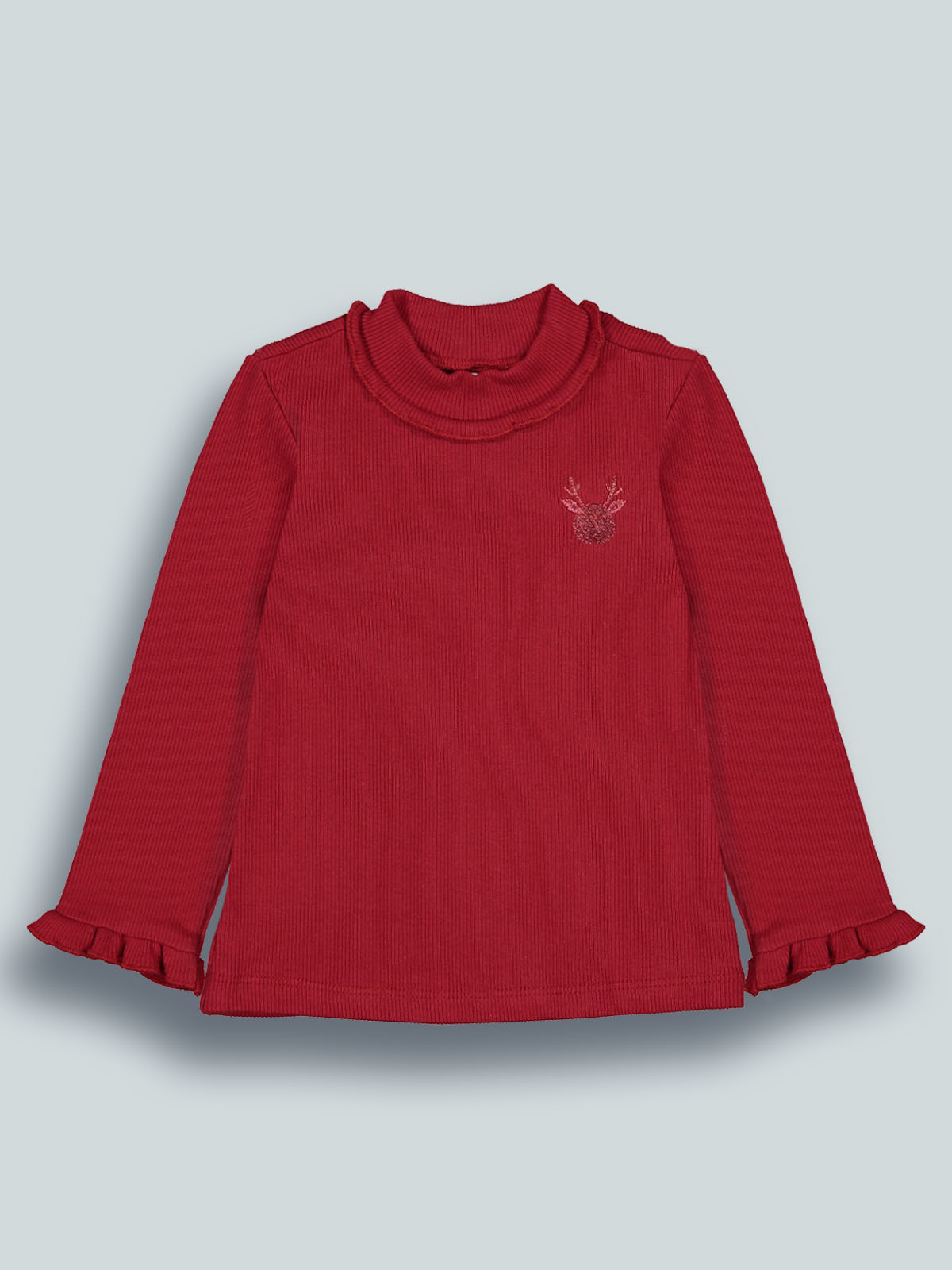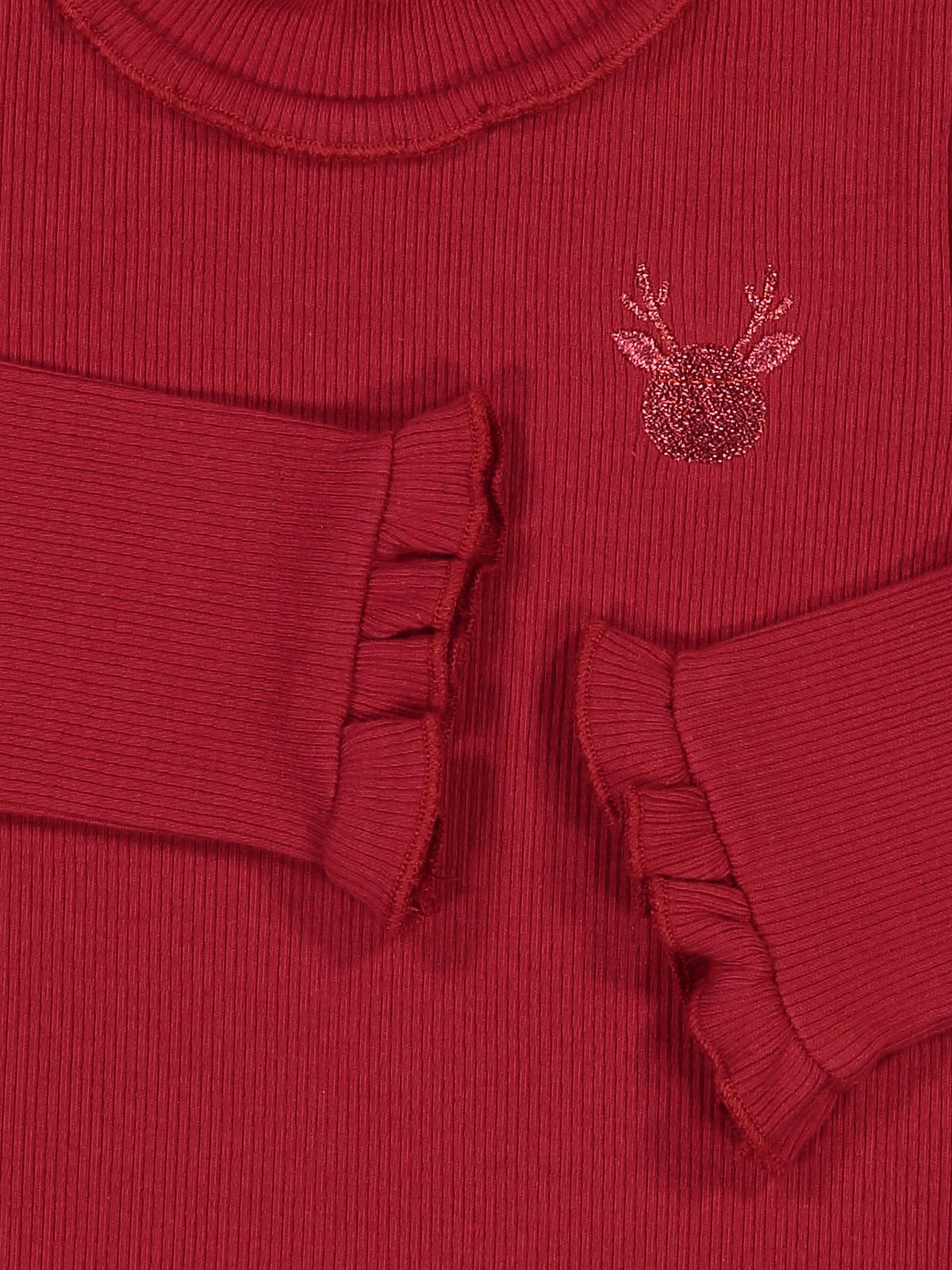 Lupetto in calda costina manica lunga. Simpatica renna a ricamo lurex sul davanti. Il modello del collo alto proteggerร  la vostra bambina dal freddo. Rouches al fondo manica e al girocollo per ancora piรน femminilitร . Un capo con dettagli chic ideale da indossare nel periodo nelle feste.