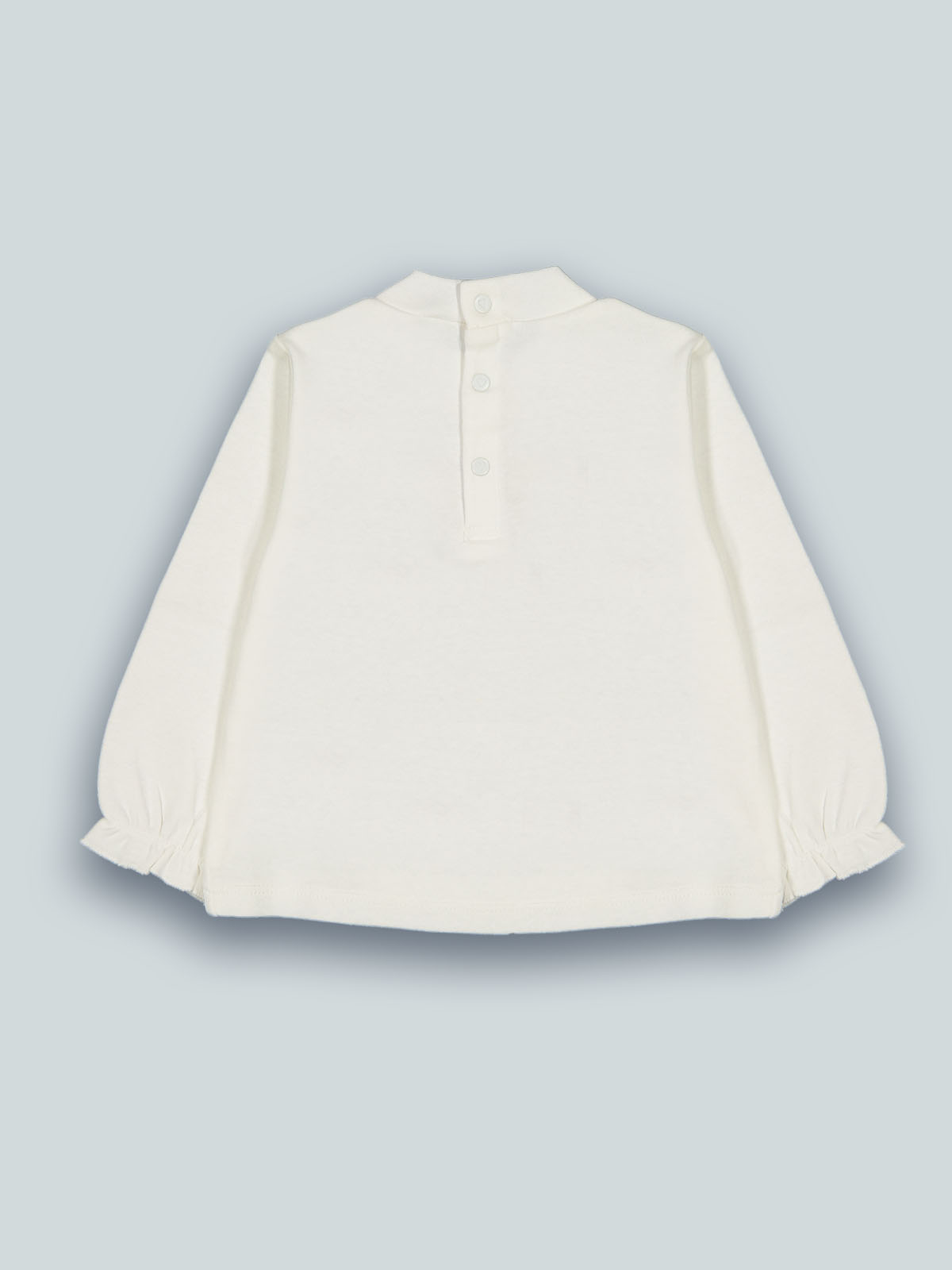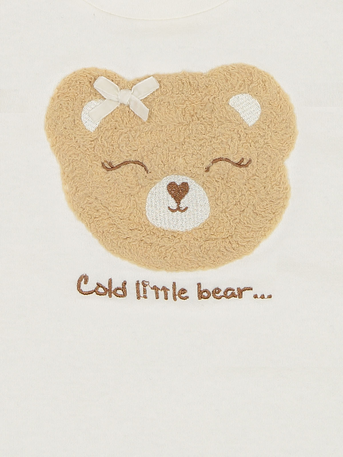 Lupetto basic in caldo cotone manica lunga con pratica apertura sul dietro grazie ai bottoncini a pressione. Il modello del collo alto proteggerร  la vostra bambina dal freddo. Simpatico orsetto a ricamo effetto punto spugna con fiocco in velour in applicazione. Un capo versatile e di facile abbinamento.
