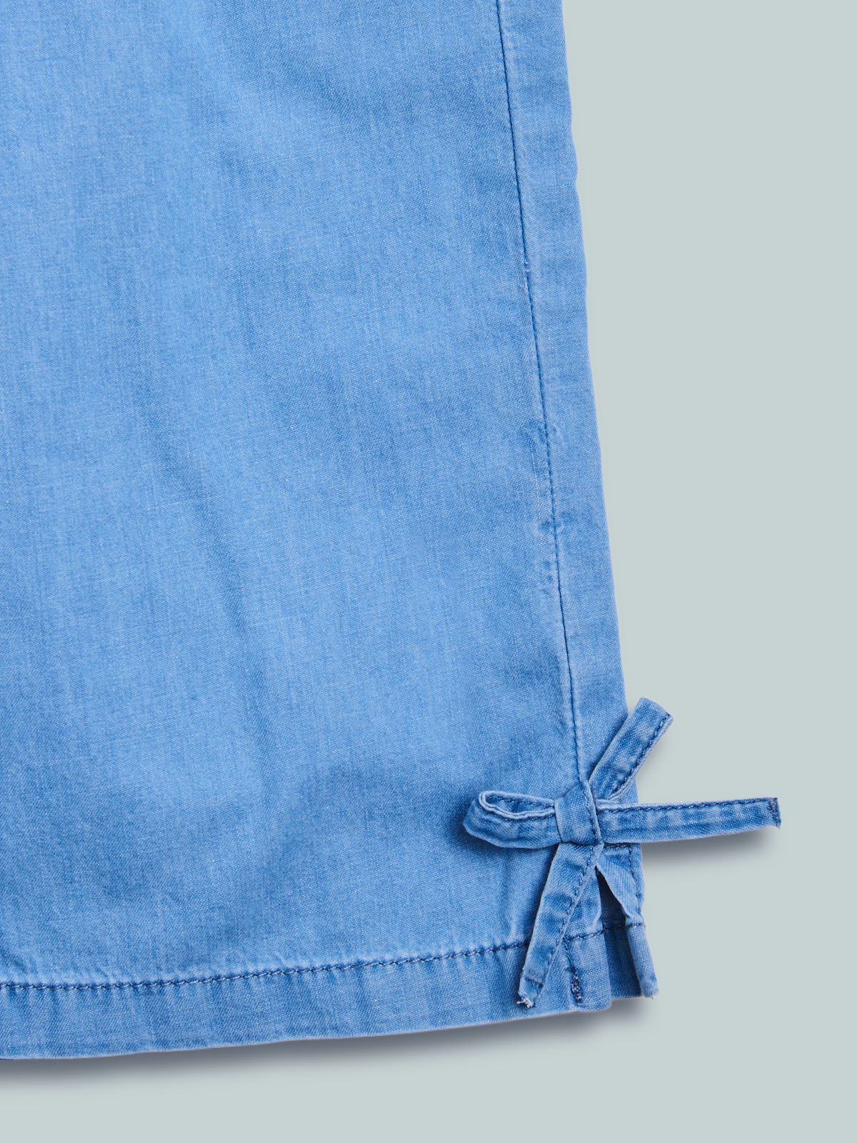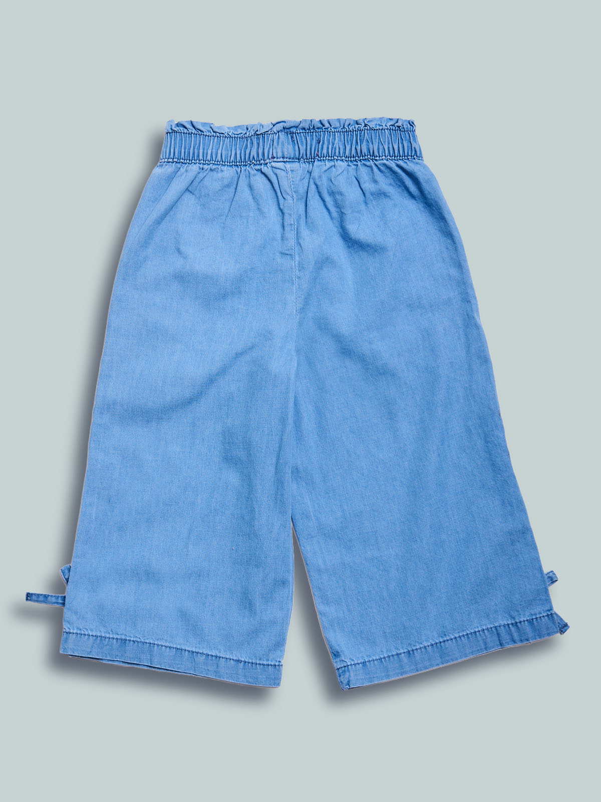 Pantaloni in morbido denim leggero con vita elasticata per maggiore comoditร . Vestibilitร  wid leg. Fiocchetti al fondo per ancora piรน femminilitร . Perfetti da indossare per essere sempre alla moda.