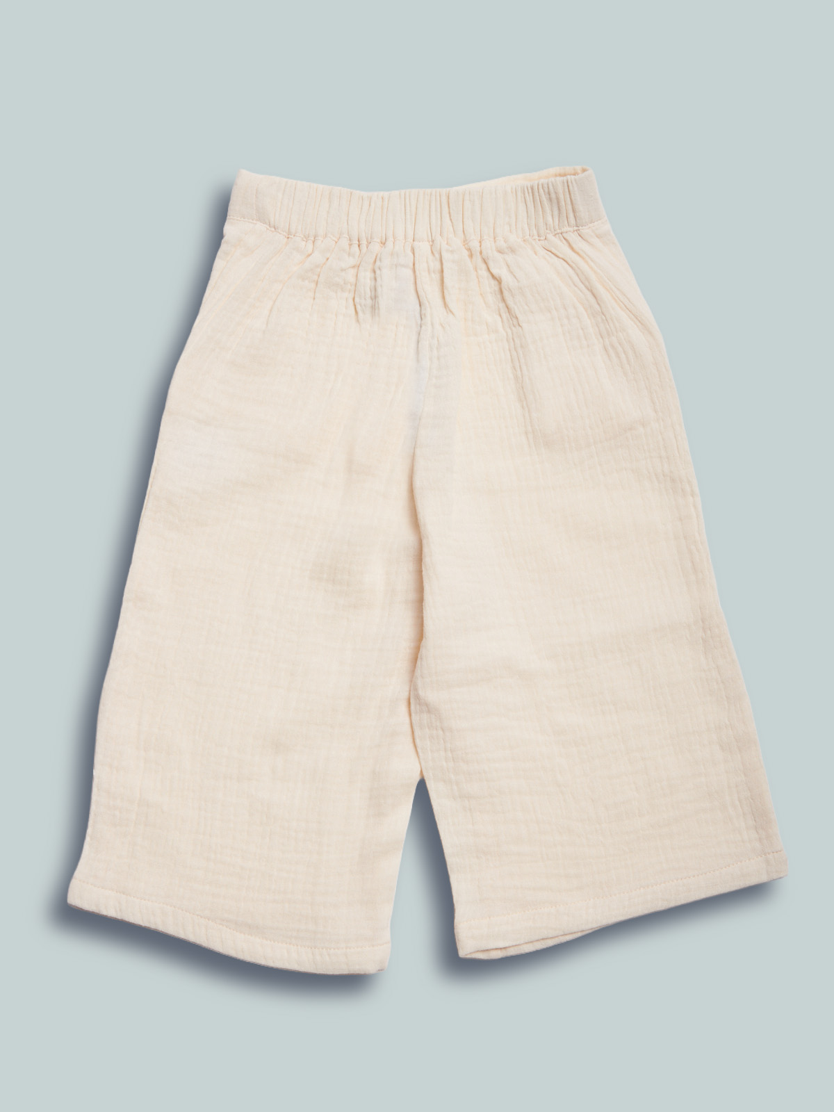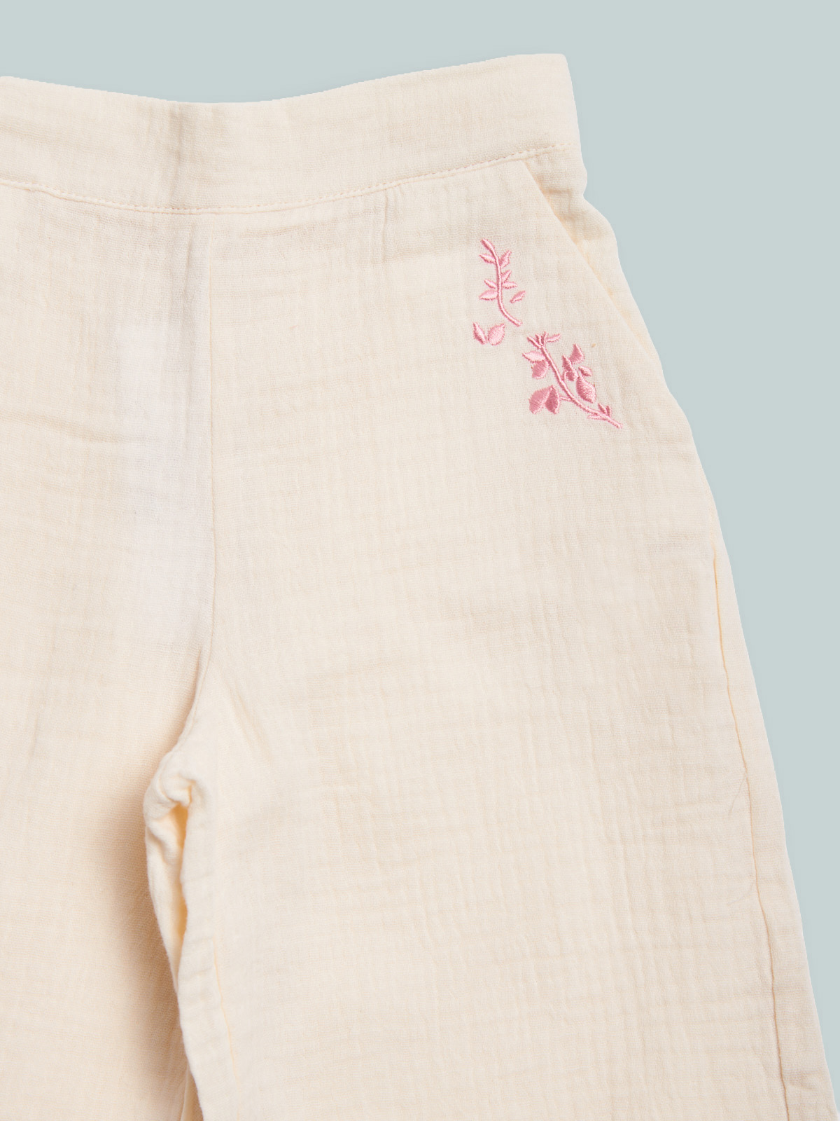 Pantaloni in morbido tessuto cotoniero goffrato con vita elasticata per maggiore comoditร . Fiori a ricamo sul davanti per maggiore femminilitร . Un capo dall’anima fashion e molto pratico al tempo stesso.