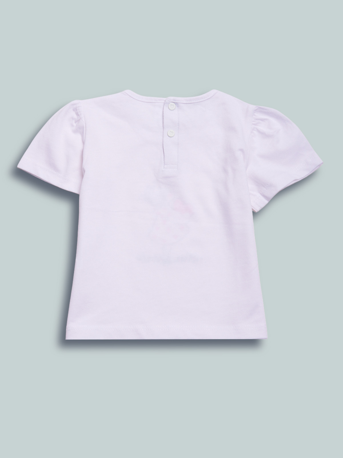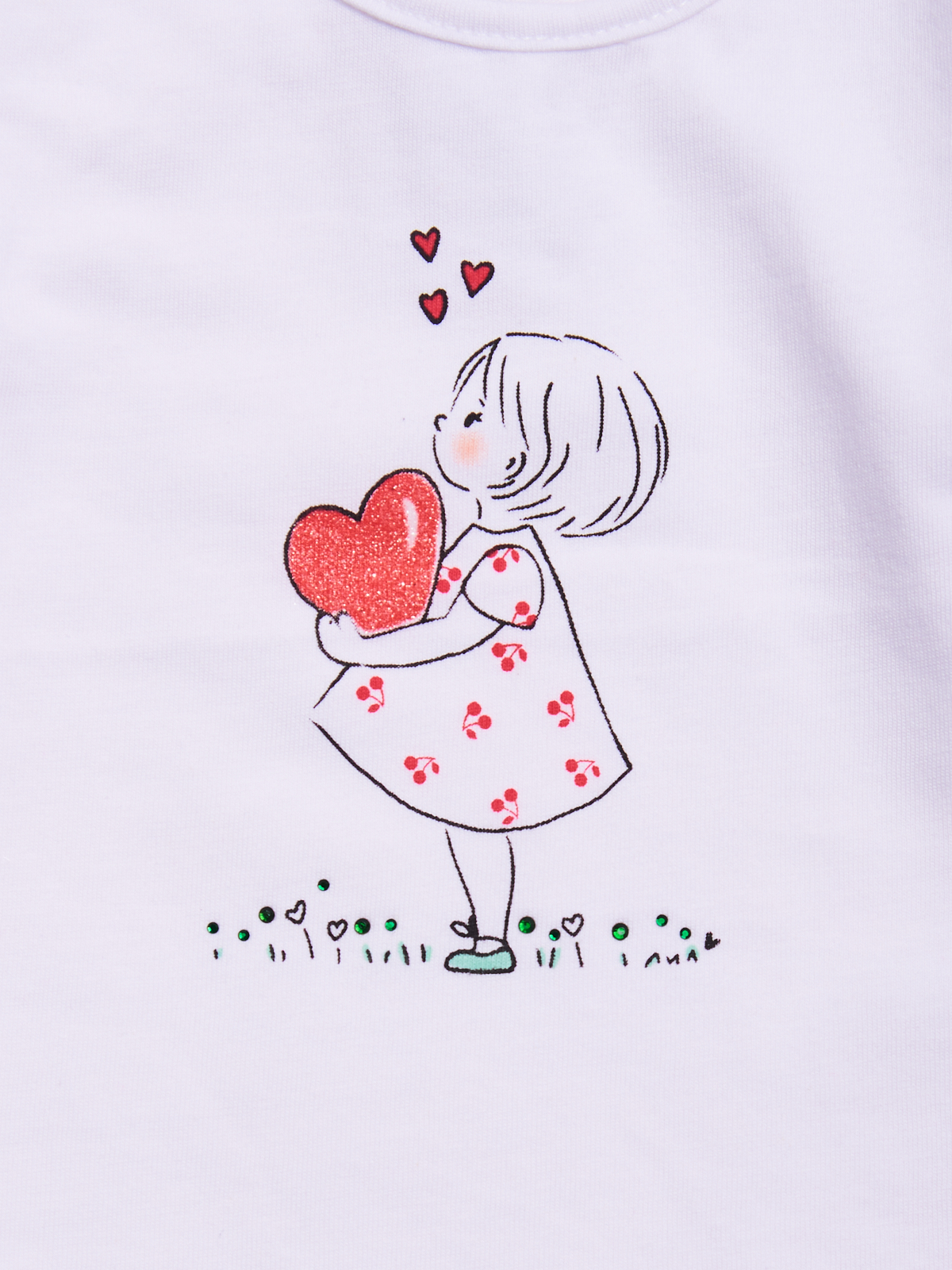 Tshirt in cotone manica corta con pratica apertura sul dietro grazie ai bottoncini a pressione. Tenera stampa bambina con glitter e strass. Un capo basico e di facile abbinamento.
