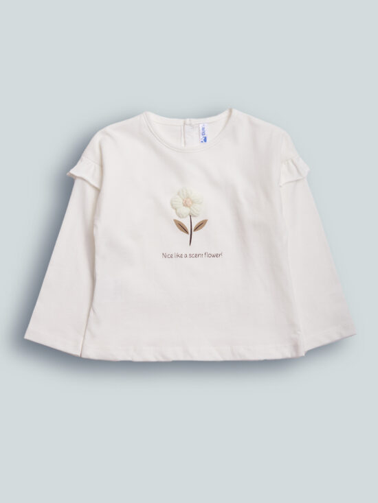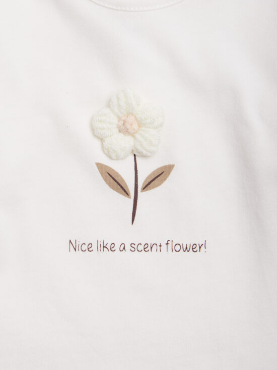 Tshirt in caldo cotone manica lunga con pratica apertura sul dietro grazie ai bottoncini a pressione. Fiore tridimensionale in applicazione con stampa scritta. Un capo fashion e di facile abbinamento.
