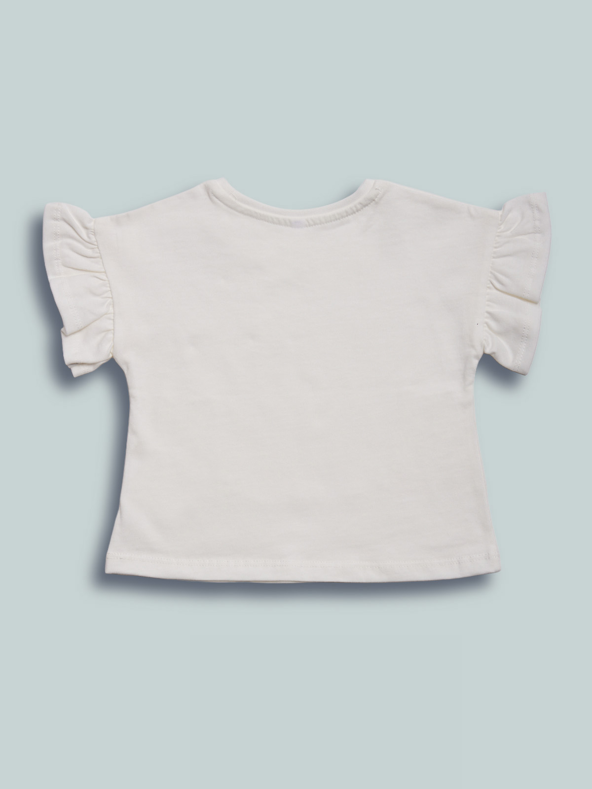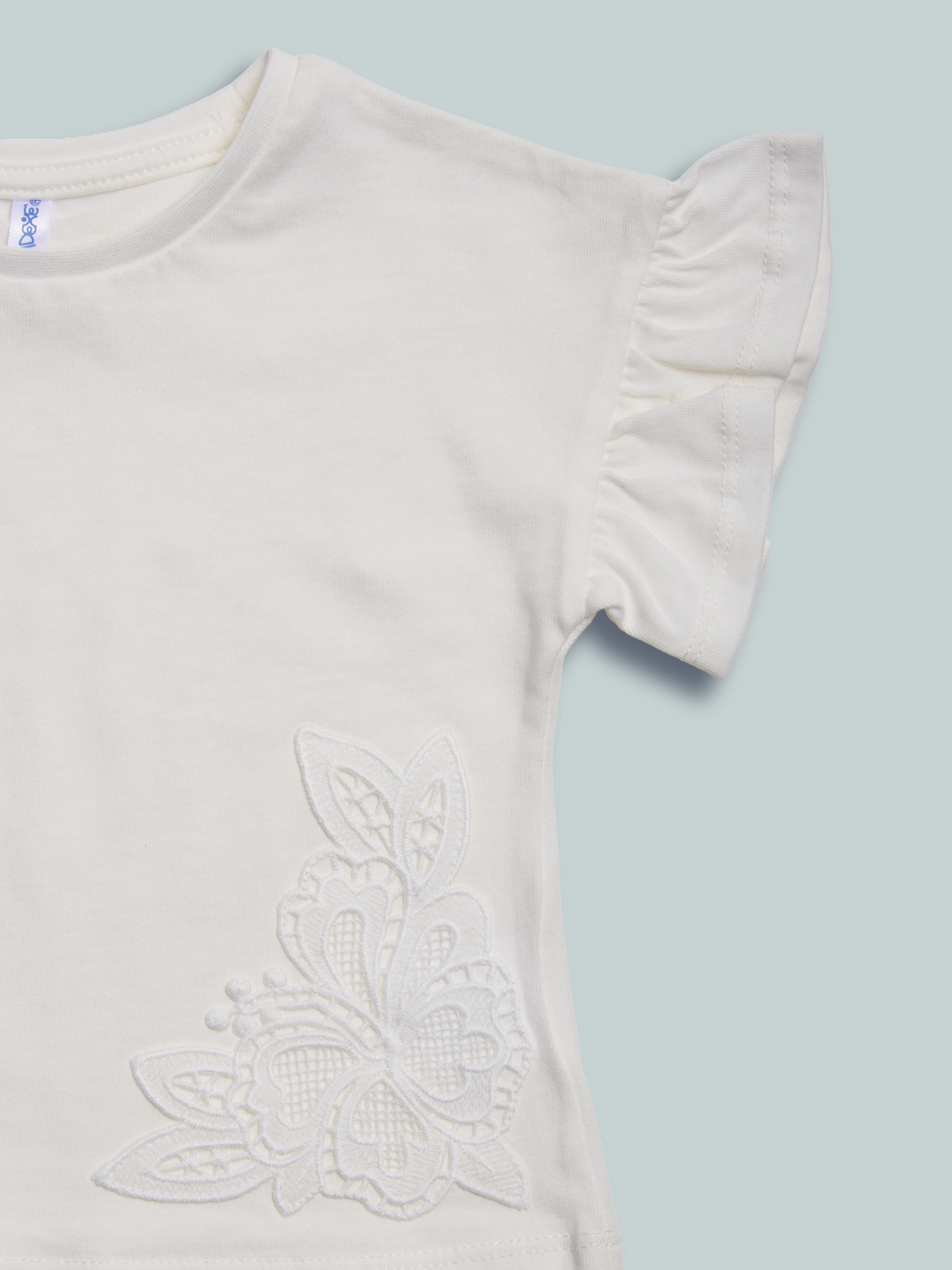 Tshirt in cotone manica corta con dettaglio di rouches al fondo. Fiori in macramè per maggiore eleganza. Un capo decisamente sfizioso e perfetto per le occasioni speciali.