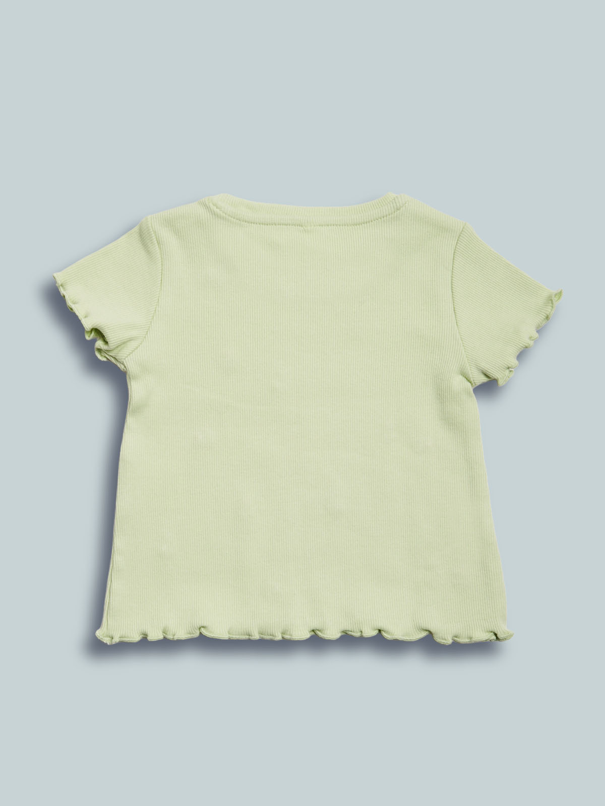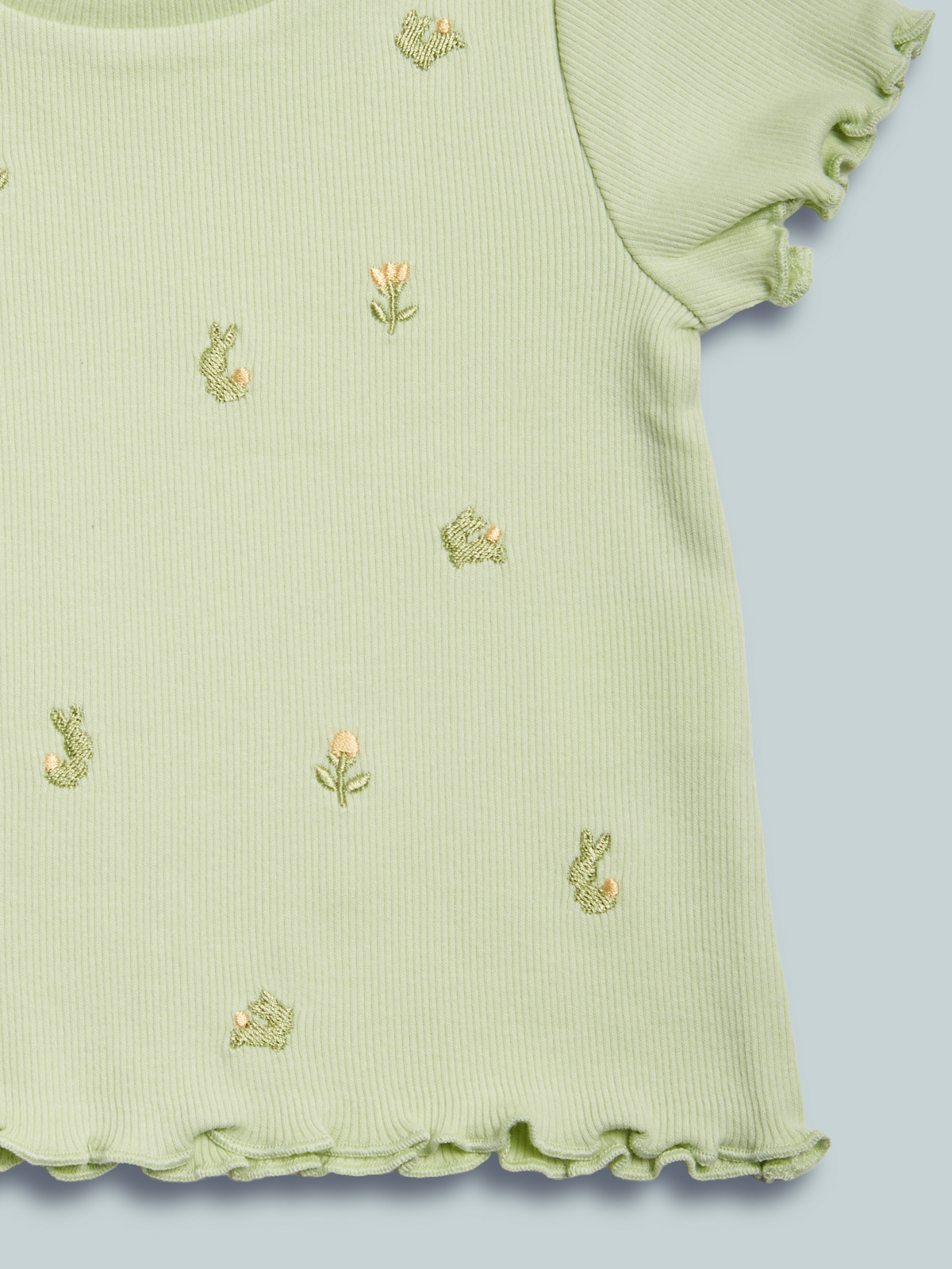 Tshirt in morbida costina manica corta con simpatici ricami sul davanti. Un capo basico e di facile abbinamento.