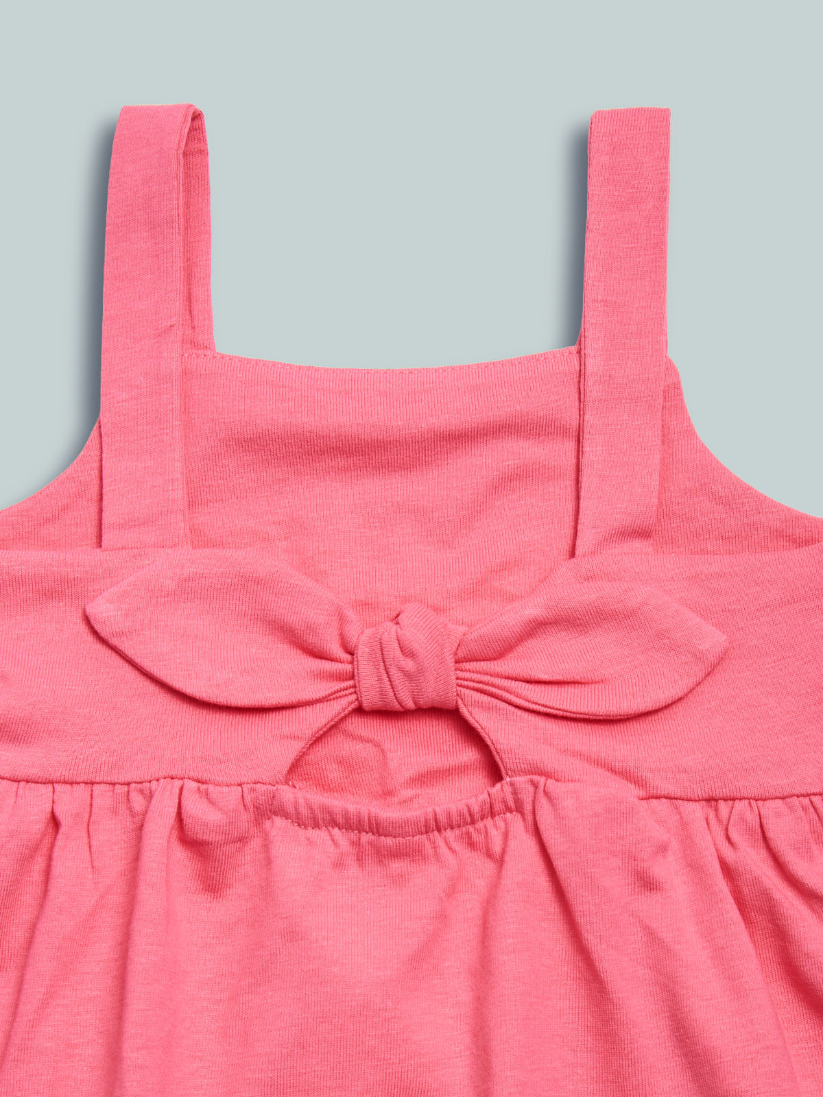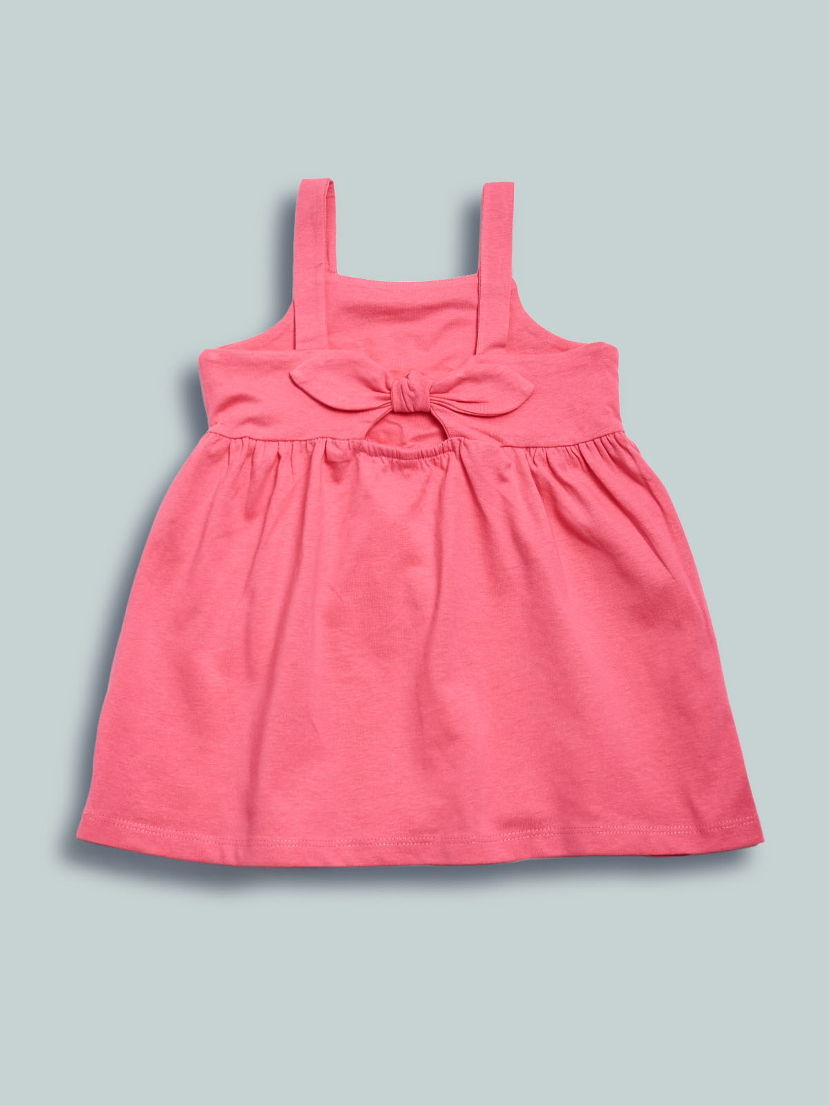 Vestito in cotone con motivo fiocco sul dietro. Taglio in vita con arricciatura per maggiore ampiezza. Un capo fresco e ideale per l’estate.