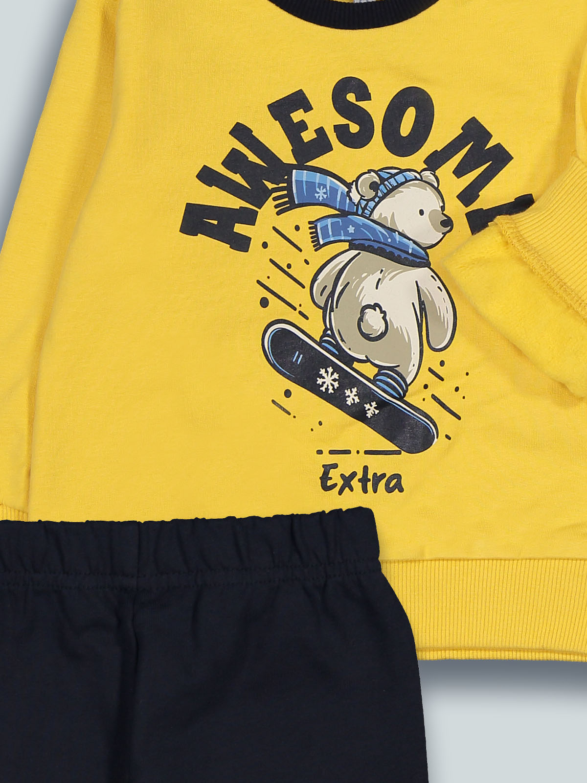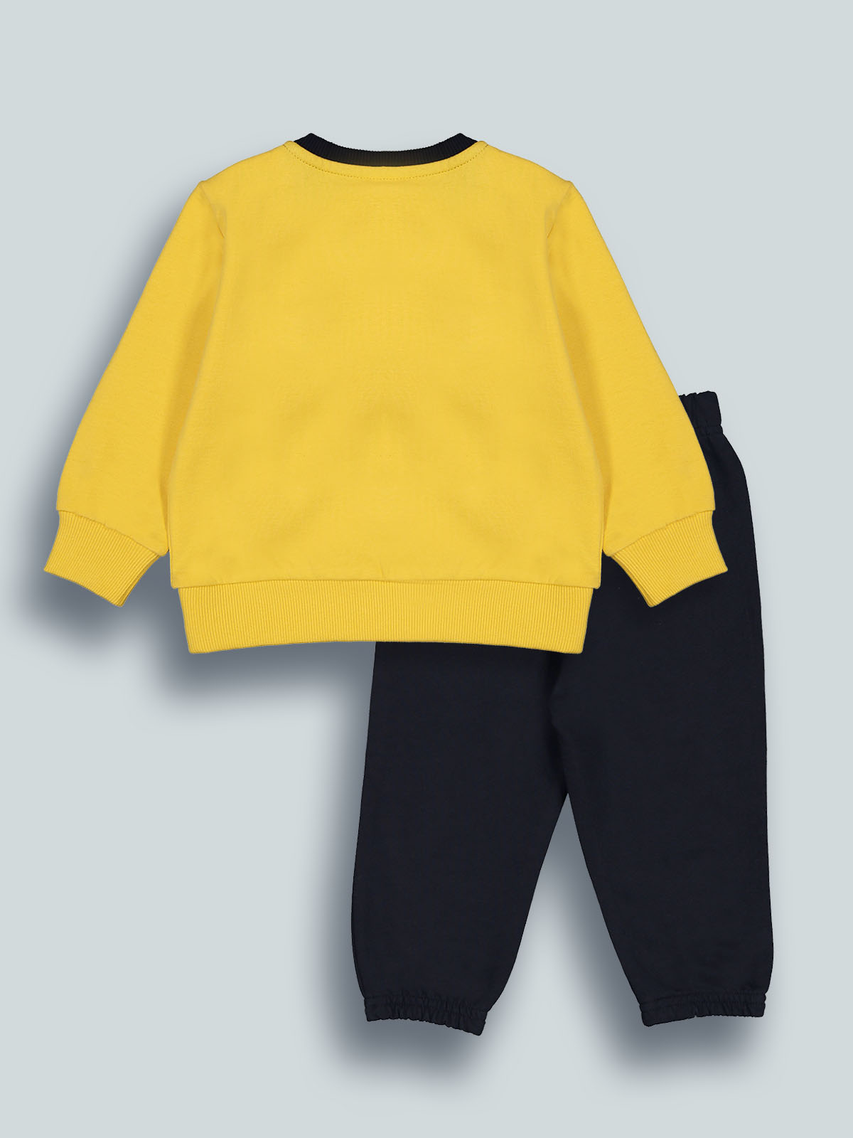 Completo due pezzi in calda felpa ideale per le giornate piรน fredde. Maglia girocollo con collo, polsi e fondo in costina, pratica apertura su spalla con bottoncini a pressione. Stampa sul davanti. Pantaloni con morbido elastico per vita e fondo gamba. L’interno di questo capo รจ lavorato in modo tale che le fibre del tessuto si sollevino, rendendolo piรน morbido, soffice e caldo sulla pelle. Un capo pratico per essere comodi tutto il giorno.