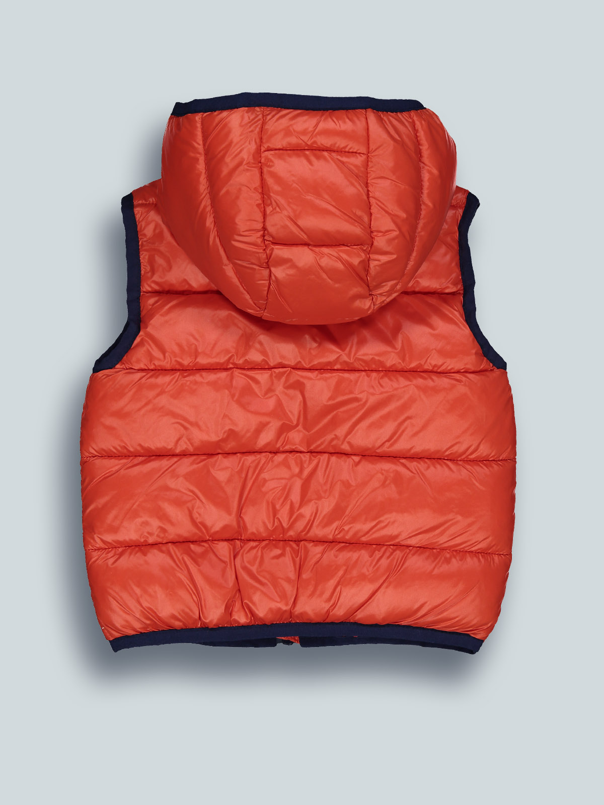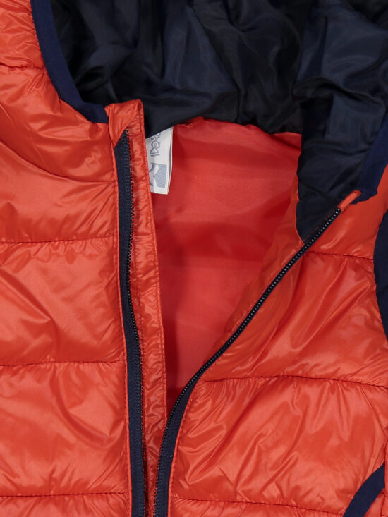 Gilet con cappuccio, in nylon trapuntato leggero con morbida ovatta. Aperto davanti con zip, bordi in fettuccia elasticata, tasche davanti, fodera in nylon. Un capo adatto ai primi freddi di stagione, perfetto per la scuola e il tempo libero.