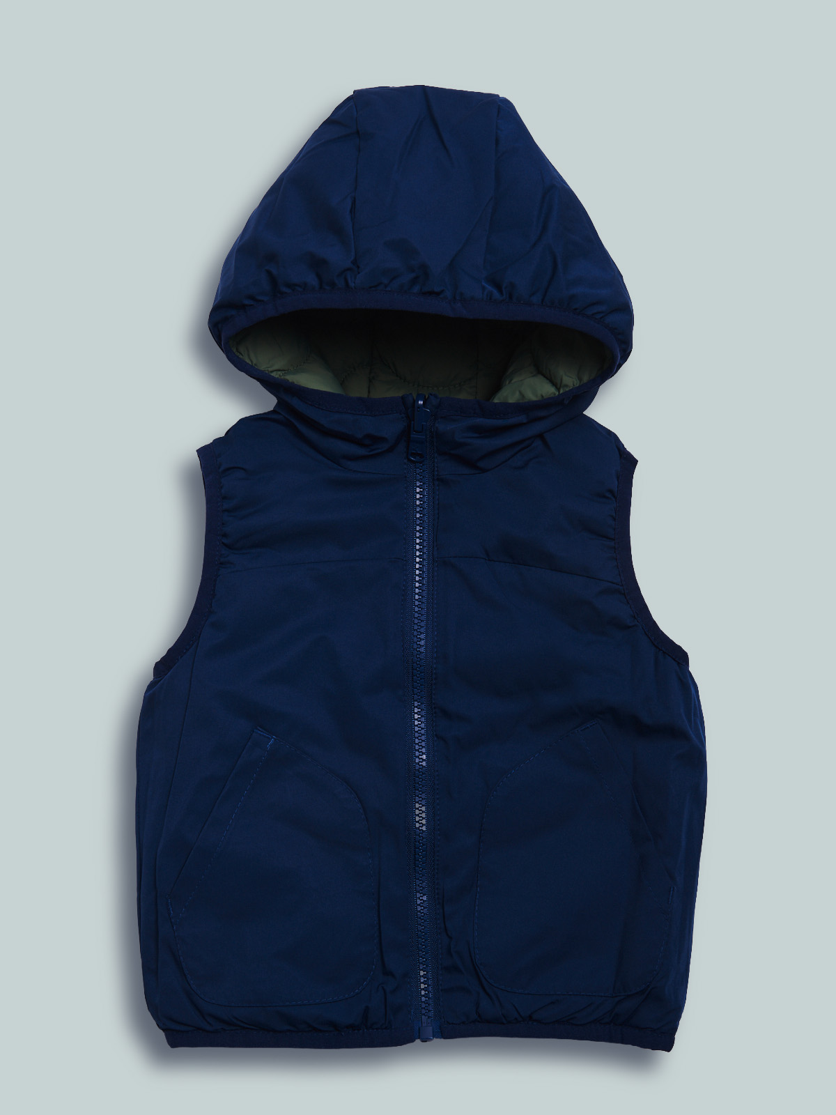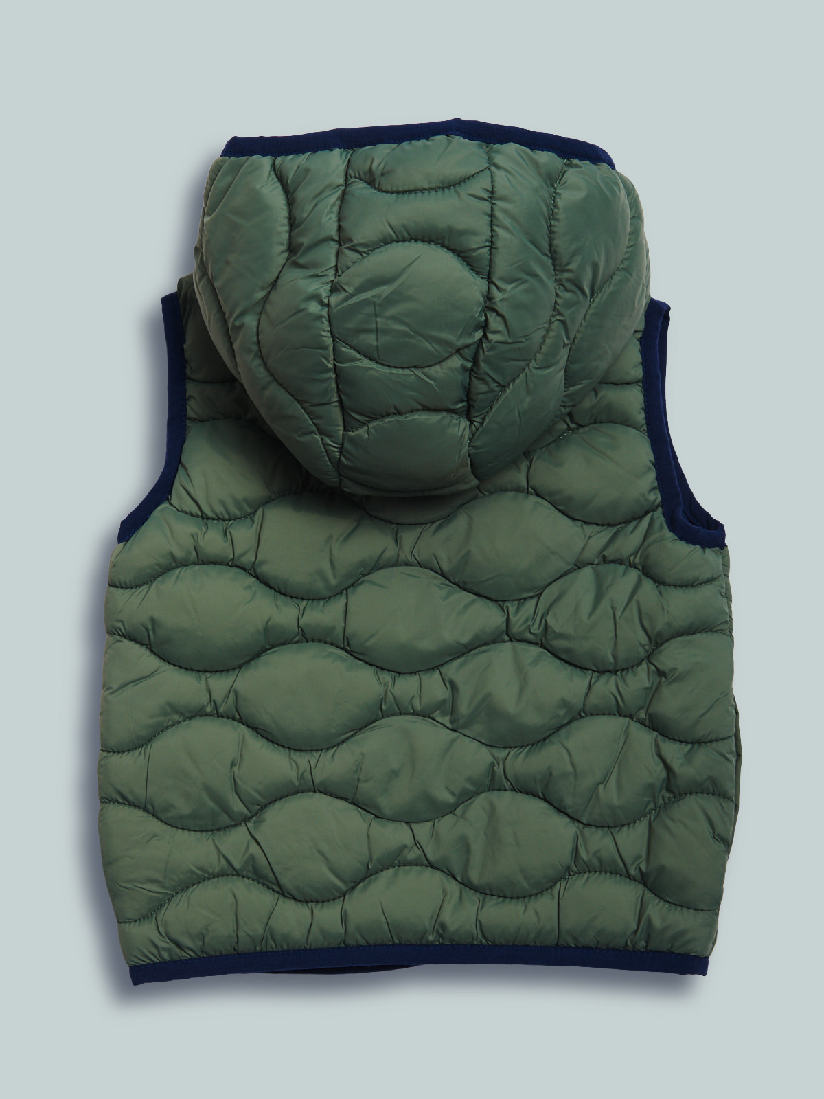 Gilet reversibile con cappuccio in nylon imbottito leggero. Lato verde trapuntato a onde e lato blu liscio, entrambi i lati dotati di tasche, bordi in fettuccia elasticata. Un capo versatile, adatto alla stagione primaverile.