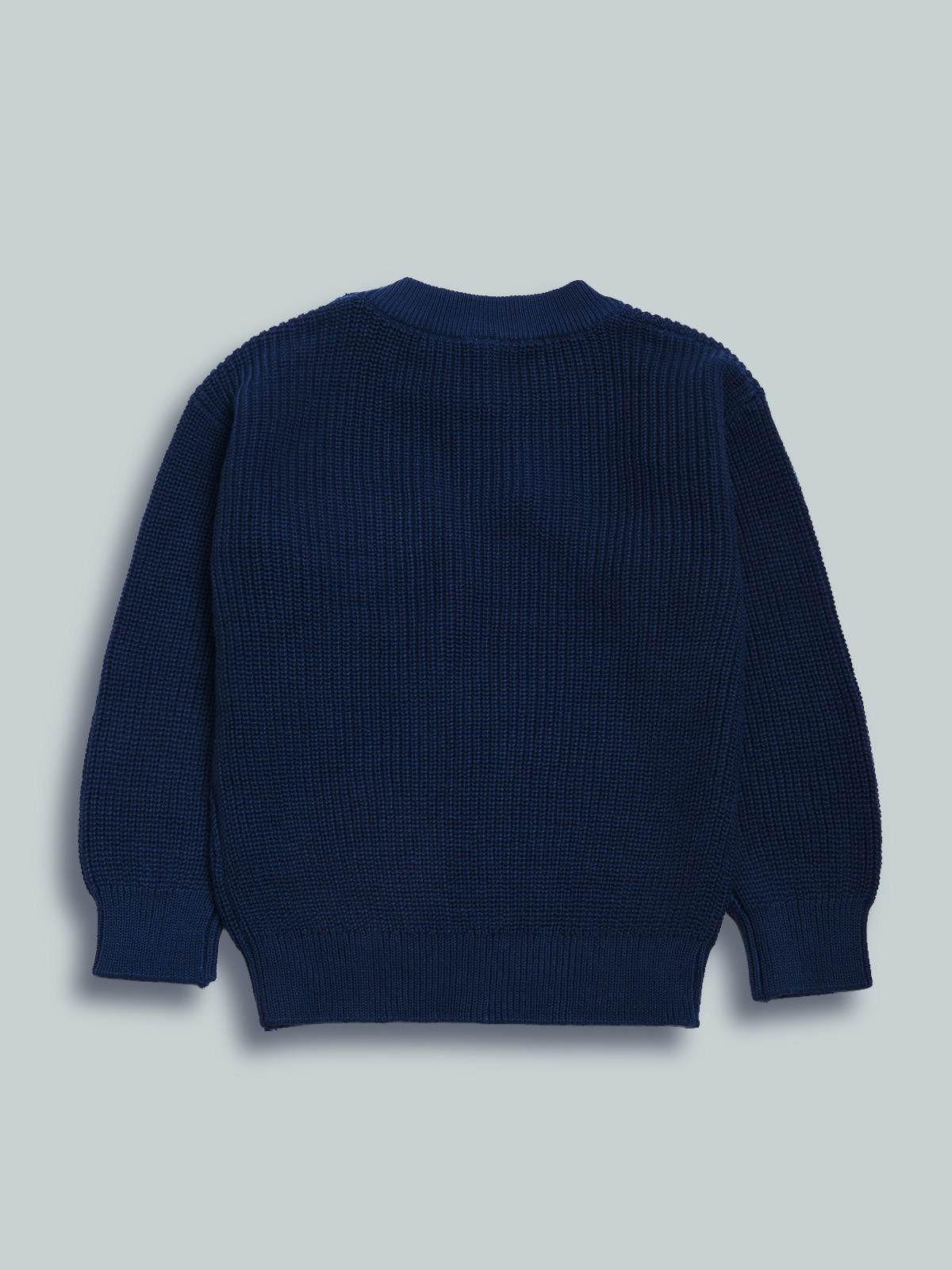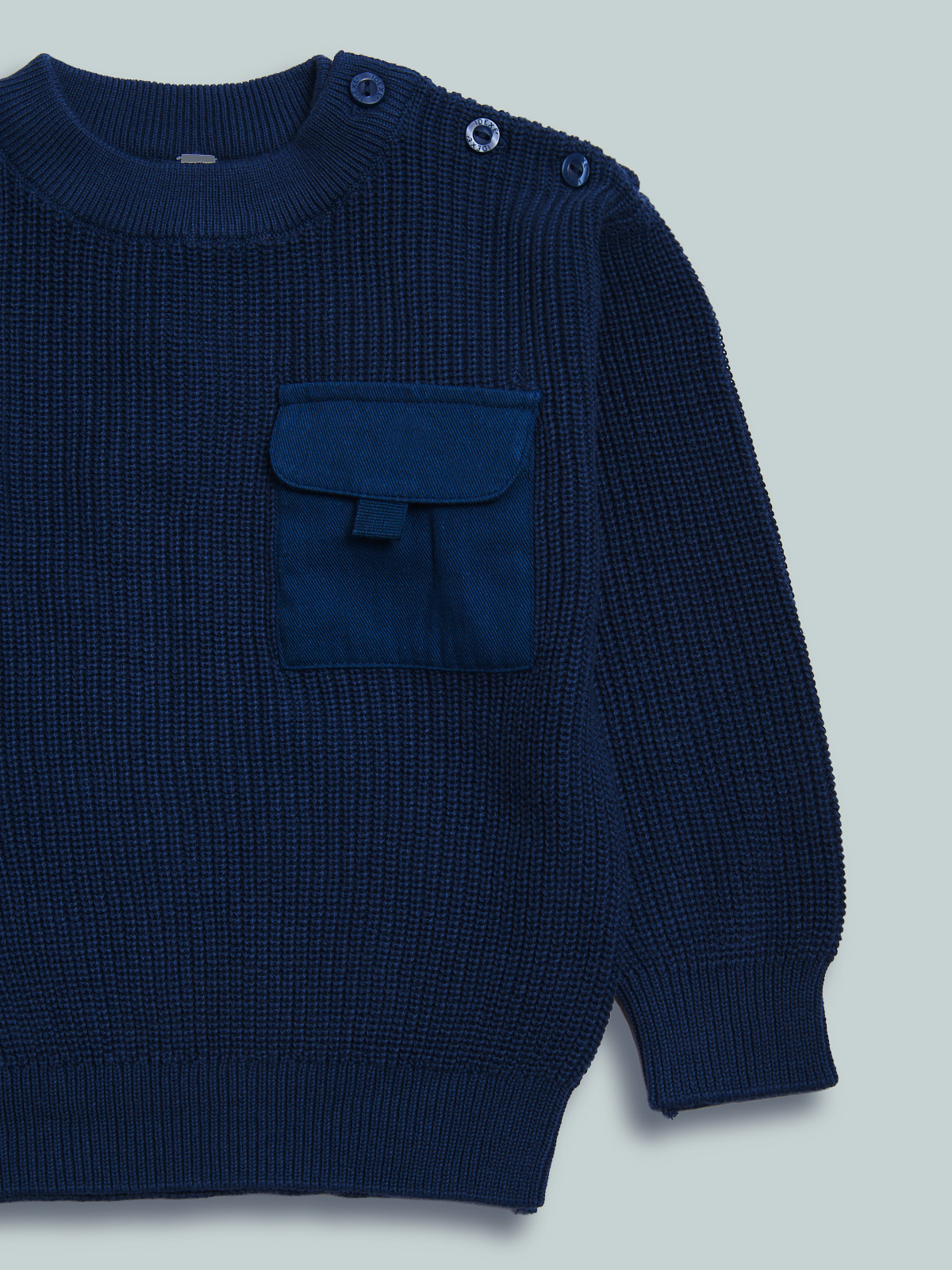 Maglioncino girocollo in morbido tricot, aperto su spalla con pratici bottoncini. Tasca con pattina in tessuto drill applicata sul davanti. Un capo di tendenza, facile da abbinare e che non puo’ mancare nell’armadio del vostro bambino.