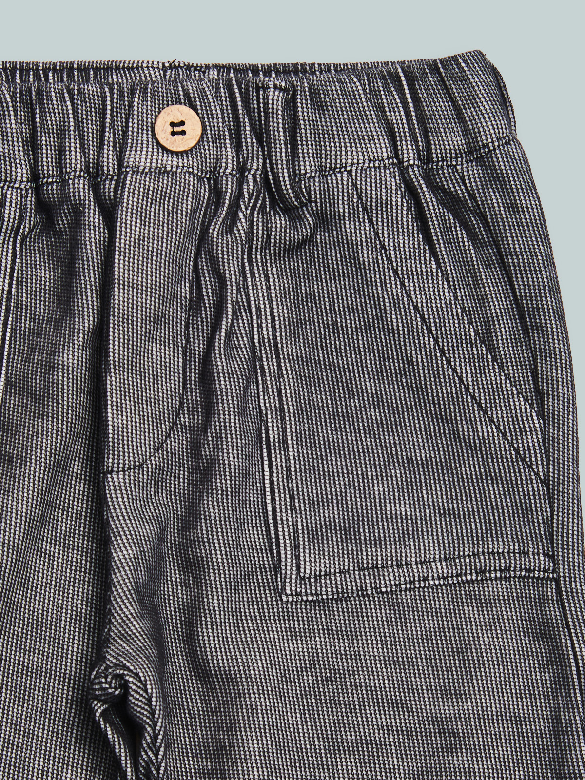 Pantaloni in tessuto maglia elasticizzato, modello con vita elasticata e finto bottone effetto legno, tasche applicate davanti e a filetto dietro. Un capo pratico e comodo per giocare in libertร .