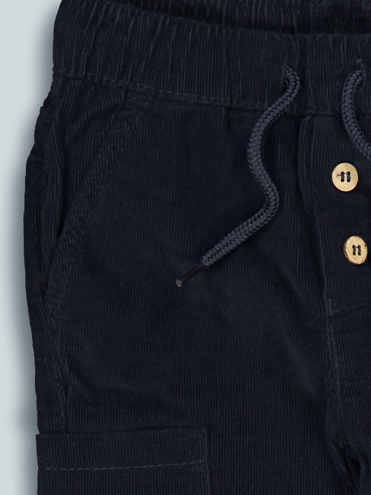 Pantaloni in velluto a coste fini, foderati in jersey. Modello con vita elasticata e coulisse regolabile, bottoncini su braghetta, pratiche tasche davanti e sui fianchi. Un capo morbido e caldo, ideale per l’inverno.