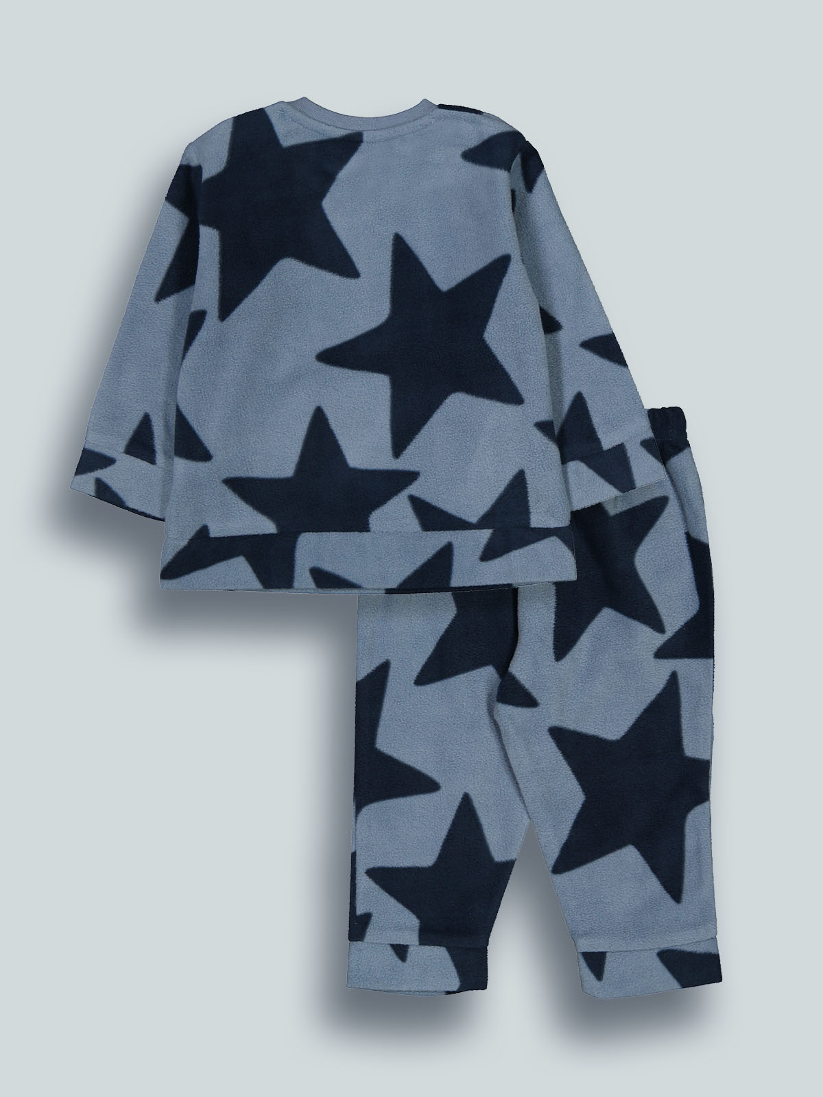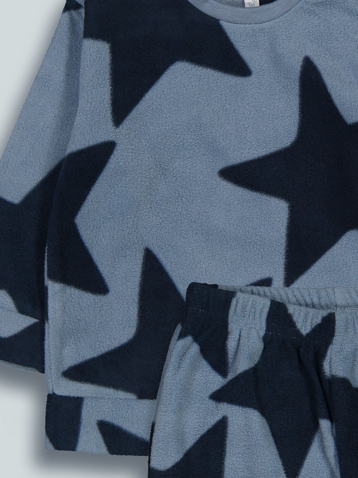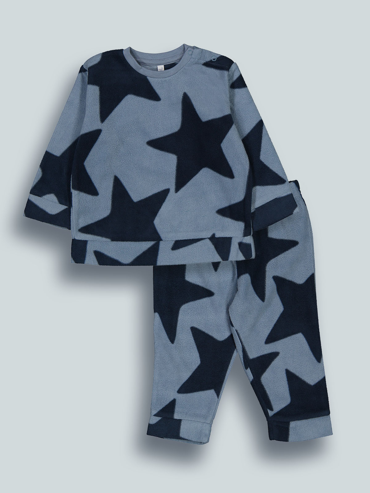 Pigiama due pezzi in pile leggero fantasia stelle. Tshirt a manica lunga, pratica apertura su spalla con bottoncini a pressione. Pantaloni con elastico a vita. Un capo caldo e confortevole, ideale per le notti piรน fredde.