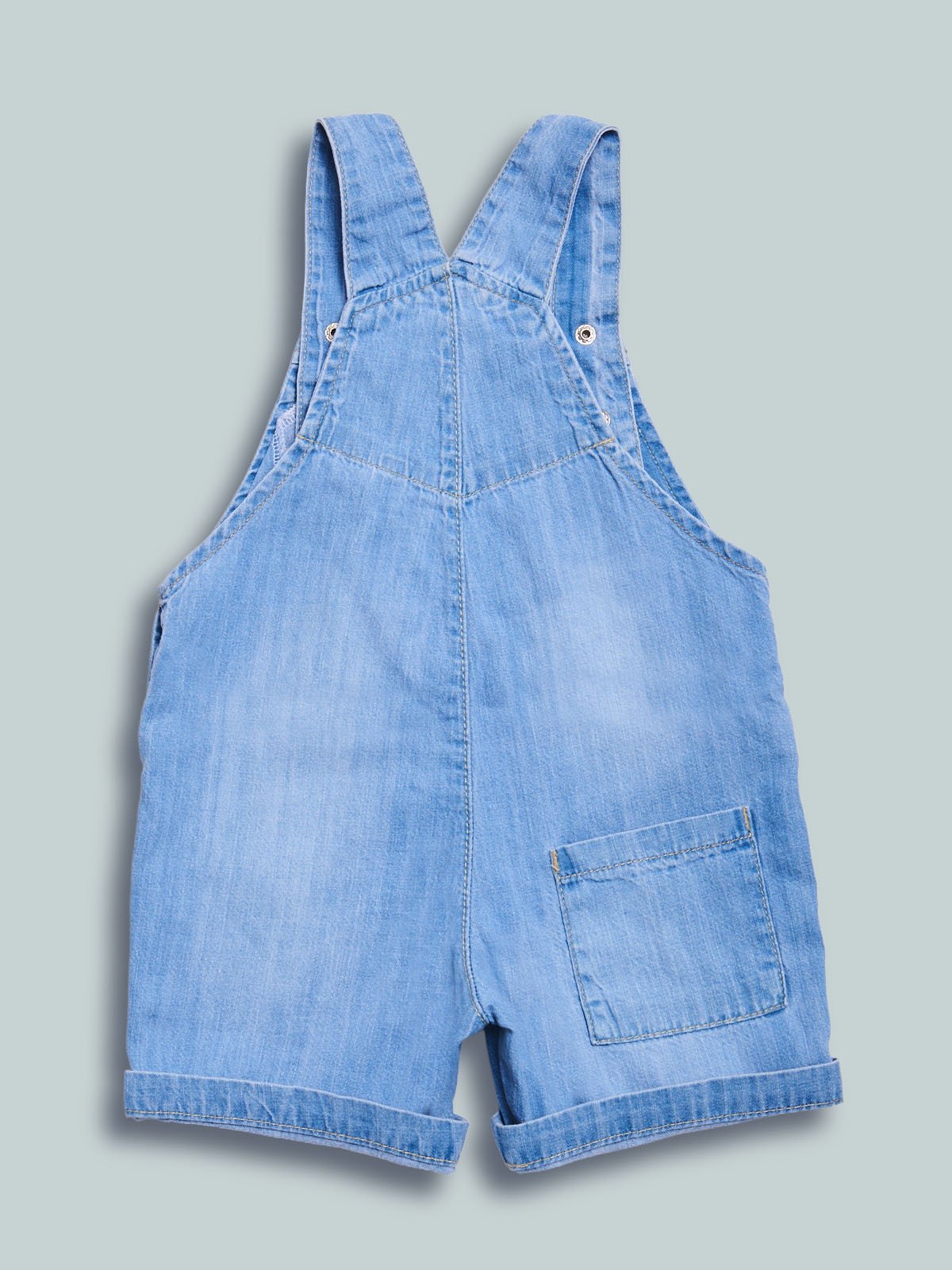 Salopette in denim leggero, modello corto con tasche applicate sul davanti e sul retro, lavaggio effetto “vintage”. Un capo sempre attuale e molto pratico, per essere comodi tutto il giorno.