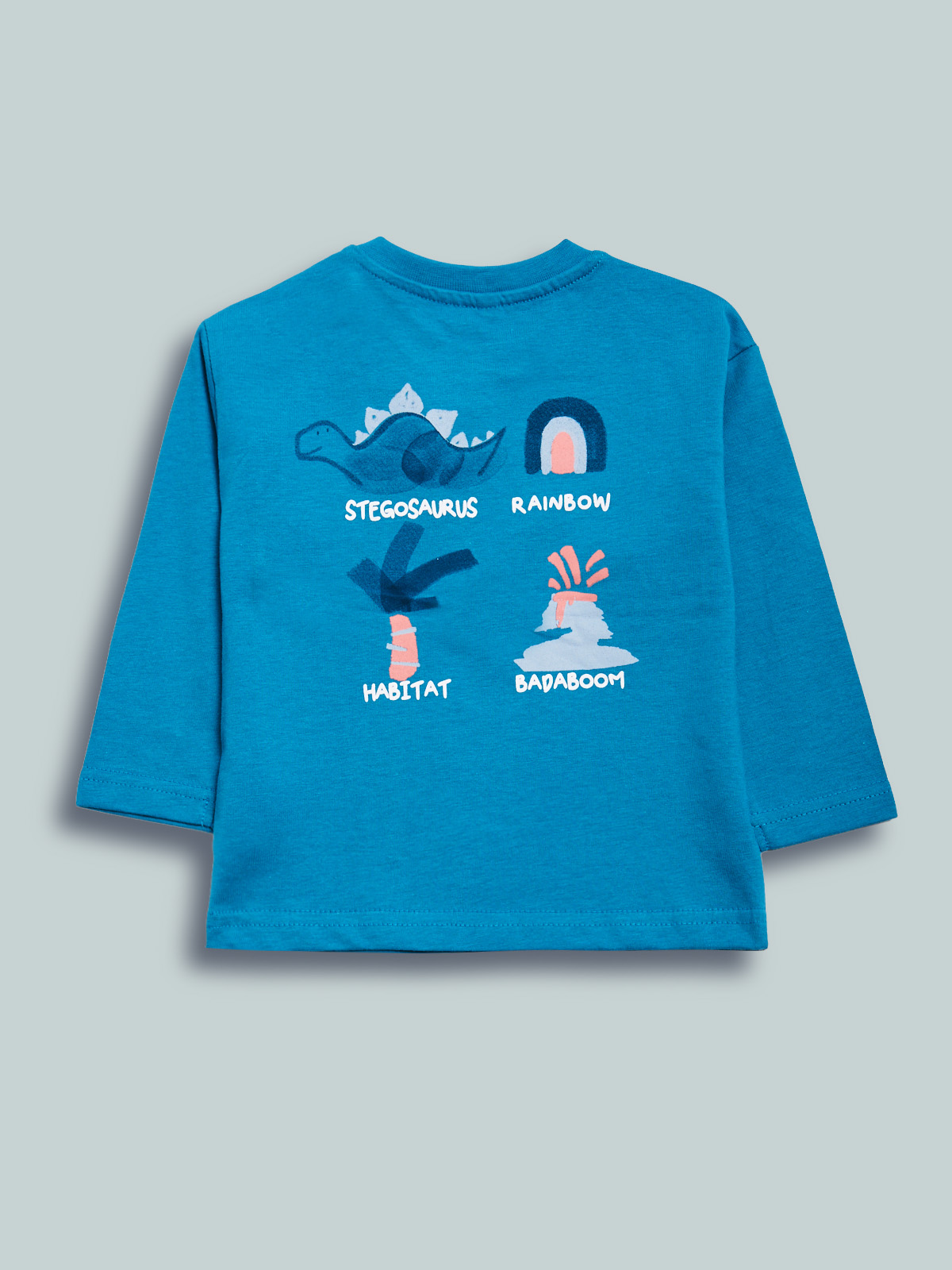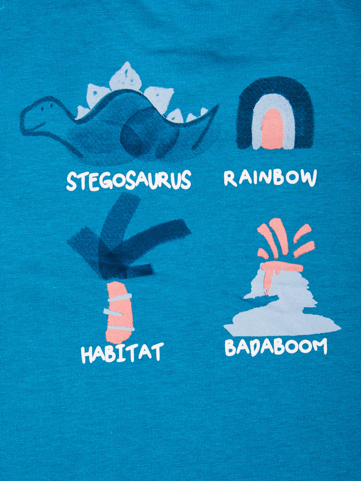 Tshirt manica lunga girocollo in cotone, pratica apertura con bottoncini a pressione su spalla, taschino sul davanti. Stampe a tema dinosauri sul davanti e dietro. Il capo ideale per essere comodi tutto il giorno.