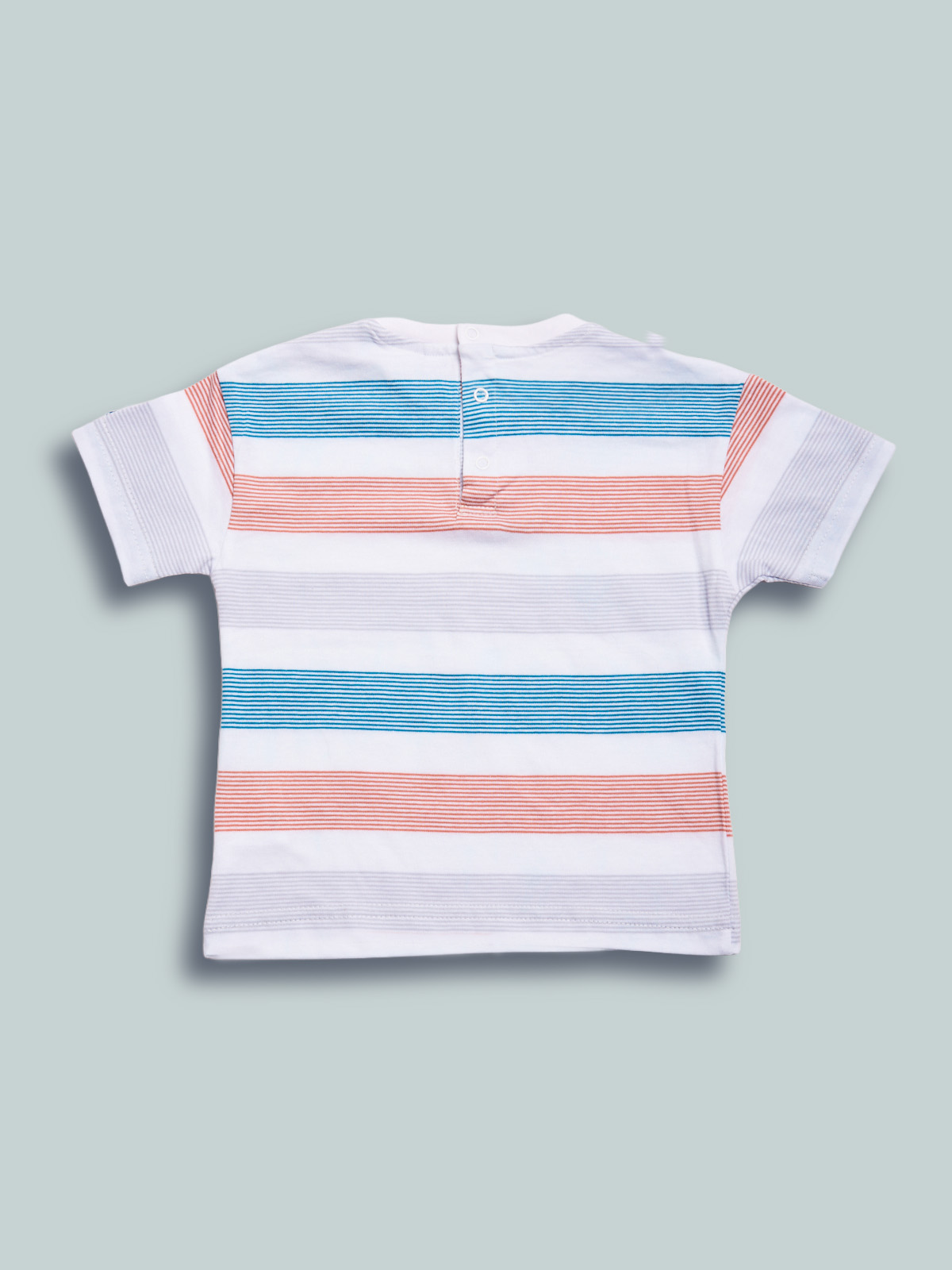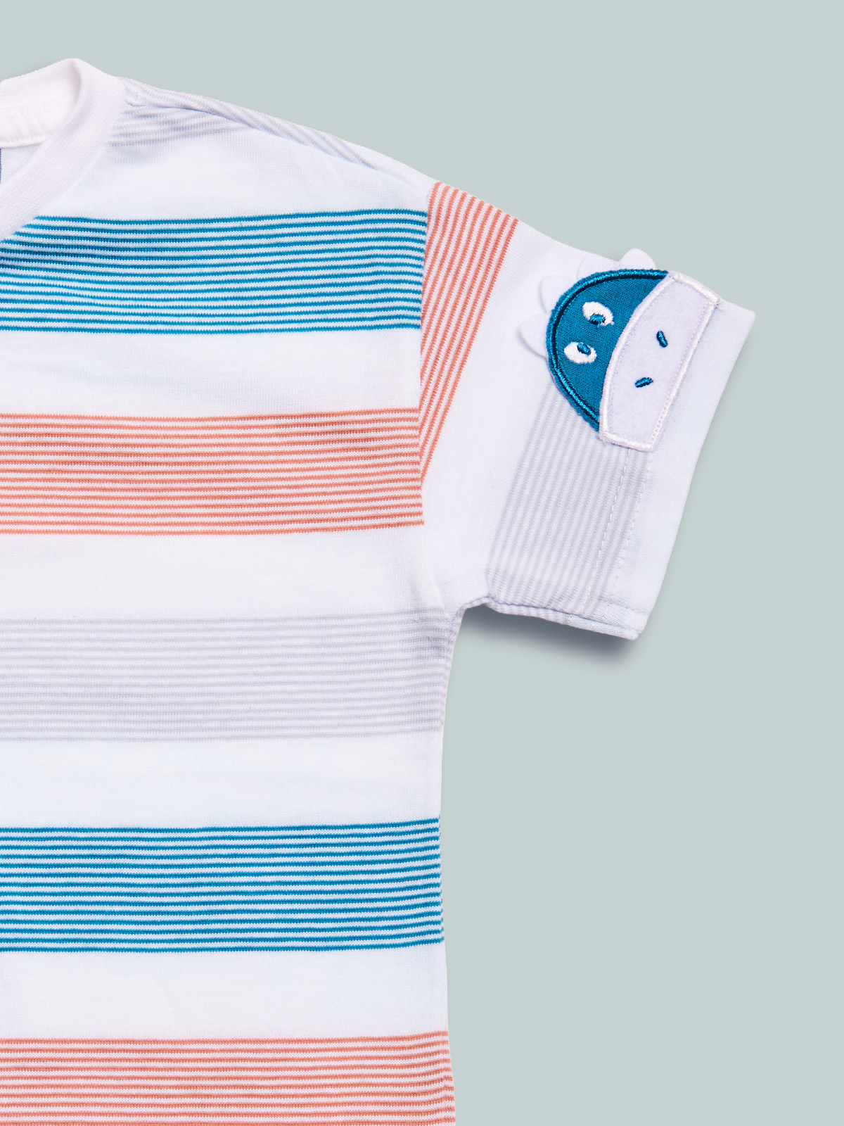 Tshirt manica corta girocollo in cotone rigato, pratica apertura con bottoncini a pressione sul retro. Ricami dionosauri sulle maniche. Una tshirt pratica e confortevole, da indossare tutti i giorni.