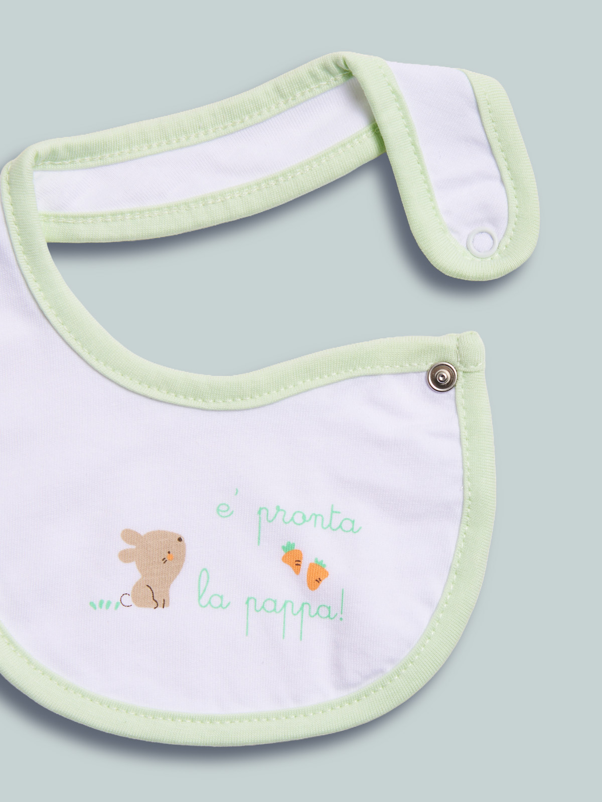 Bavetta in cotone decorato con stampa riproposta su altri articoli per completare il tuo corredino. Dotato di un pratico bottone a pressione sulla parte laterale per agevolarne l’indosso. Questo accessorio fa parte del corredino composto da tutti gli articoli indispensabili per il tuo neonato.