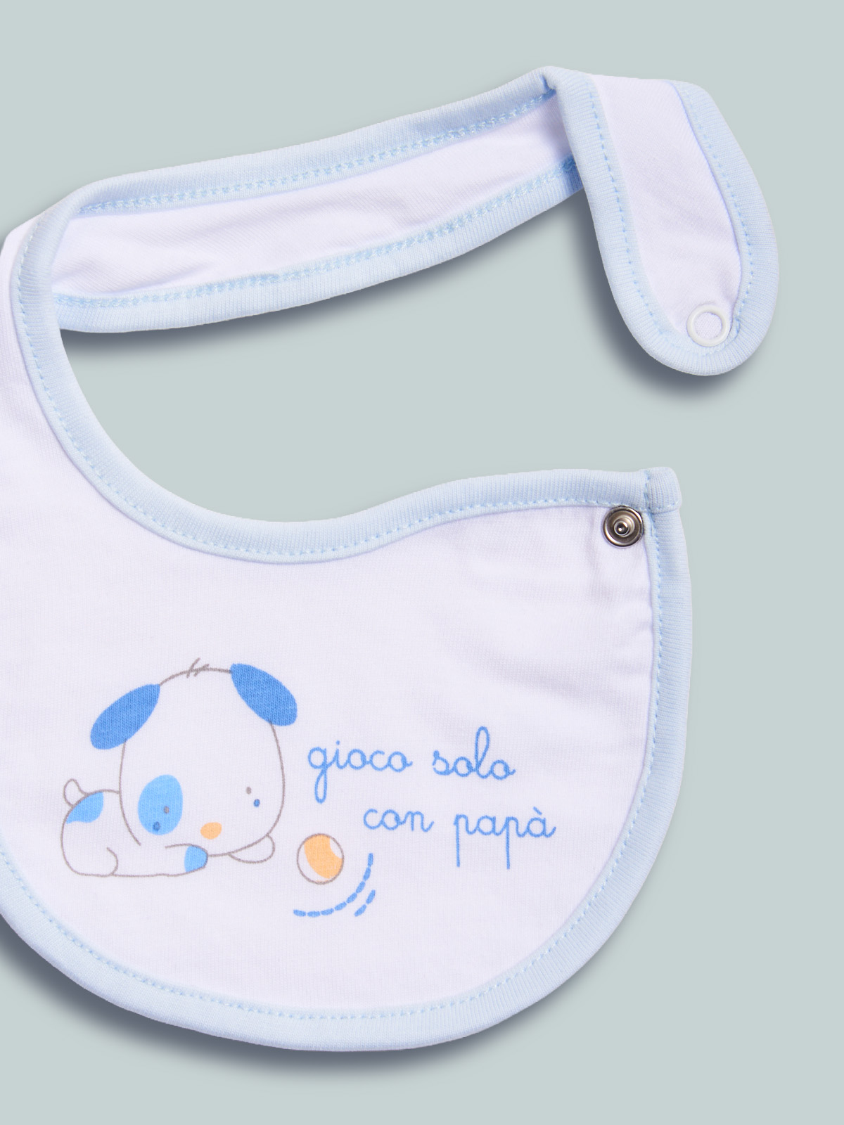 Bavetta in cotone decorato con stampa riproposta su altri articoli per completare il tuo corredino. Dotato di un pratico bottone a pressione sulla parte laterale per agevolarne l’indosso. Questo accessorio fa parte del corredino composto da tutti gli articoli indispensabili per il tuo neonato.