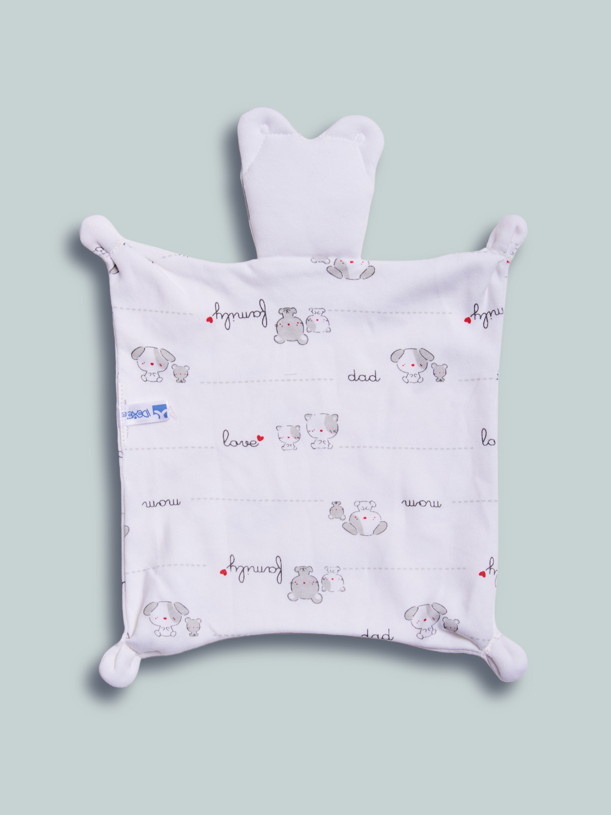 Simpatico dou dou in caldo cotone stampato fantasia, materiale piacevole al tatto, con nodini alle estremitร  รจ facile da afferrare.