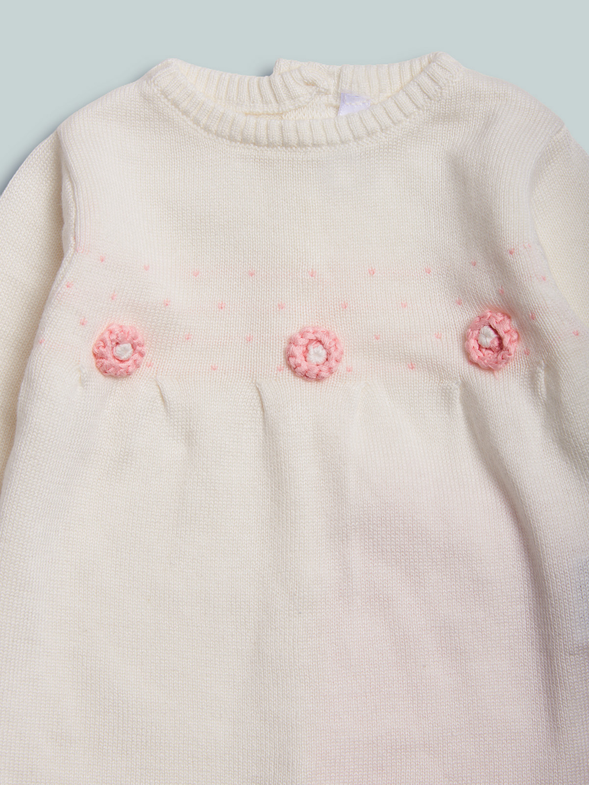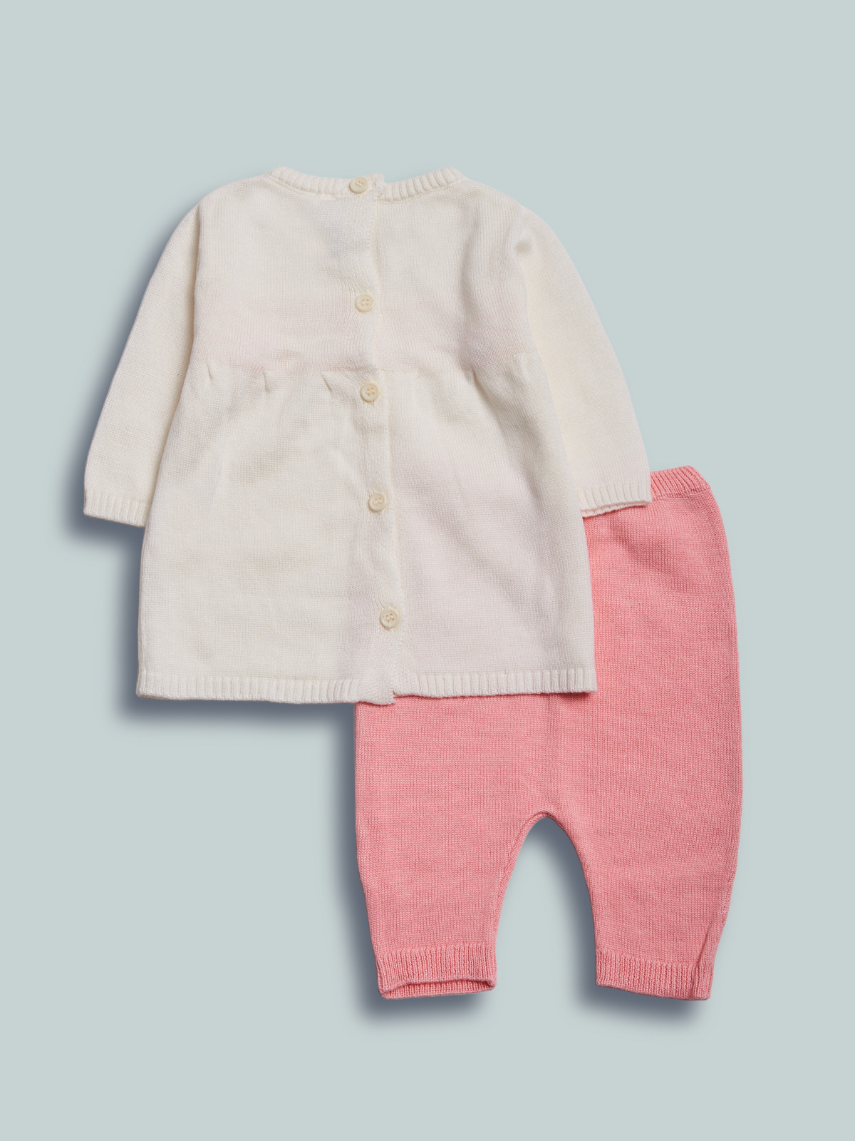 Completo due pezzi in morbida maglia tricot. Vestito manica lunga. Chiusura con bottoni sulla schiena per facilitare la vestibilitร . Pantalone modello leggings, morbido elastico in vita. Non farti sfuggire comoditร  ed eleganza in un solo capo.