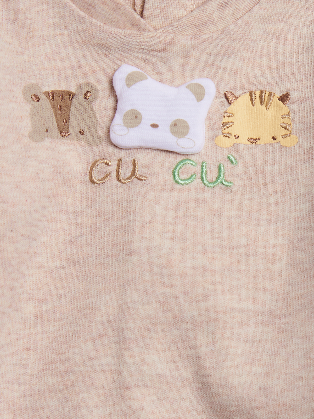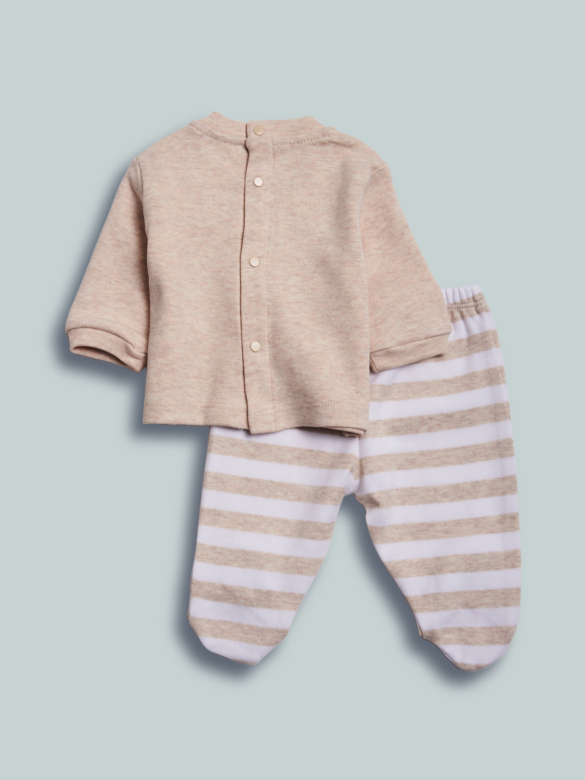 Completo due pezzi composto da coprifasce in caldo cotone beige melange, apertura sul dietro con bottoni a pressione. Elemento decorativo: stampa con orsetti su toppe imbottite, ghettina caldo cotone rigato. Fantastico per tutti i giorni, data la sua praticitร . Questo completo fa parte del corredino composto da tutti gli articoli indispensabili per il tuo neonato.