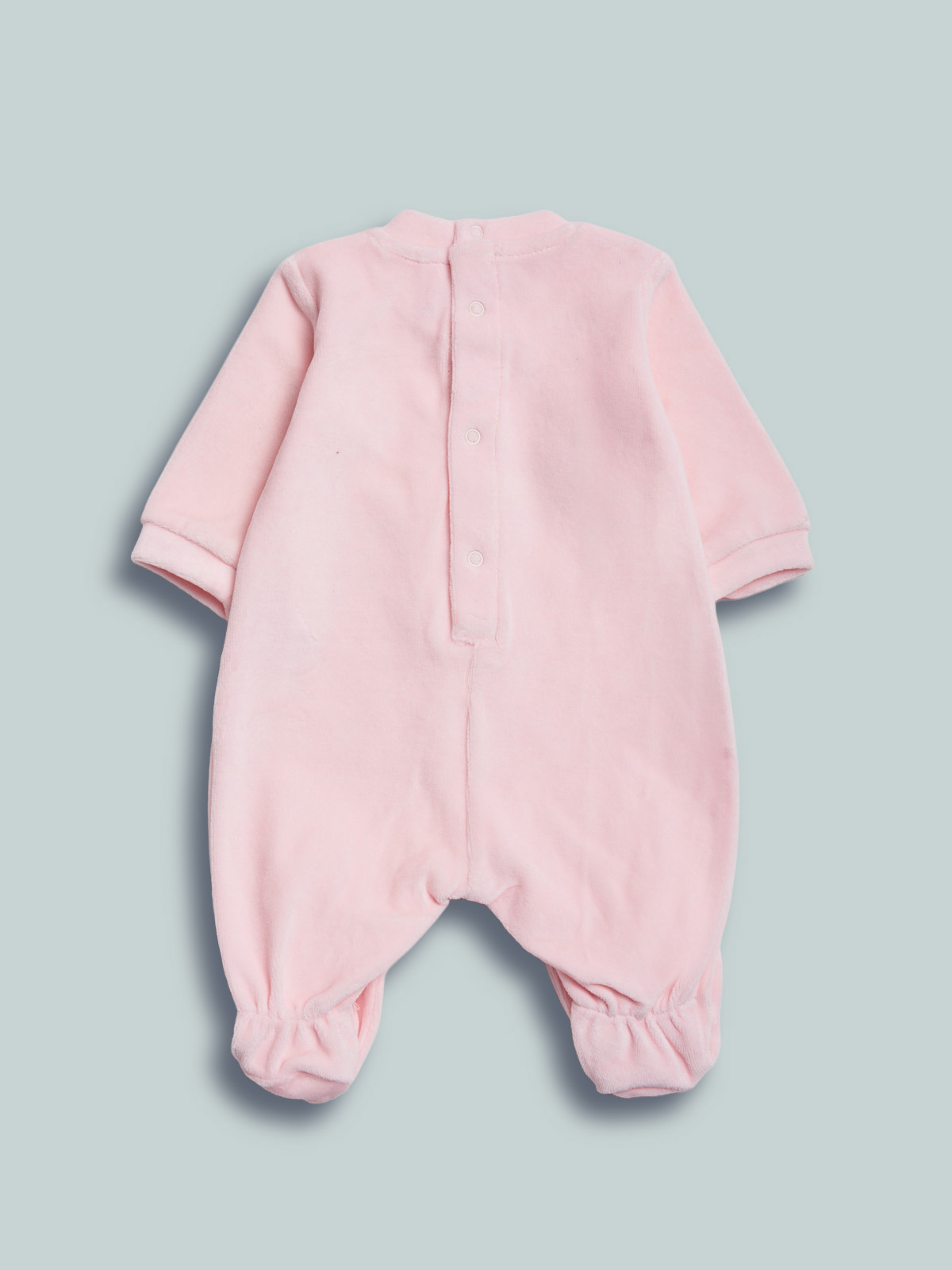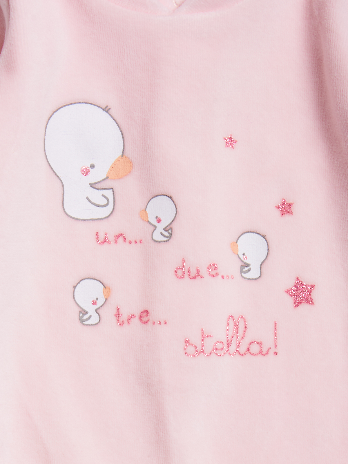 Pigiama in morbida ciniglia manica lunga con piedino, apertura dietro ed entrogamba con bottoni a pressione per agevolarne l’indosso. Elemento decorativo: simpatica stampa glitter. Ideale per la nanna.