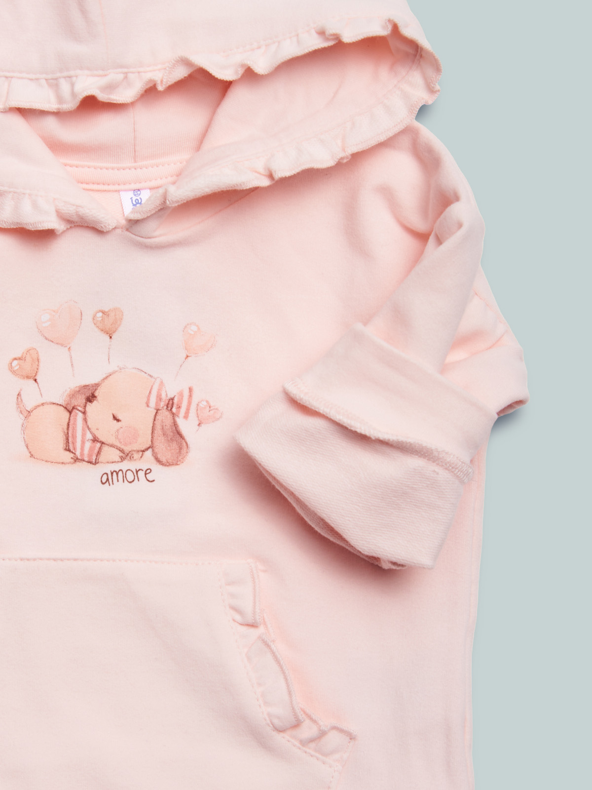 Maglia over in felpa leggera elasticizzata, cappuccio e tasca marsupio con rouches per una maggiore femminilitร . Elementi decorativi: tenera stampa. Un capo versatile e fashion.